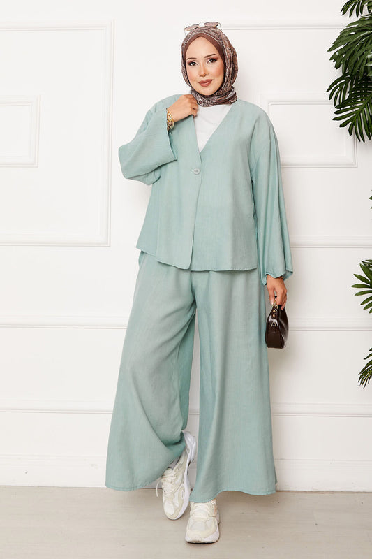 Tek Düğme Detaylı Salaş İkili Takım yağ yeşil