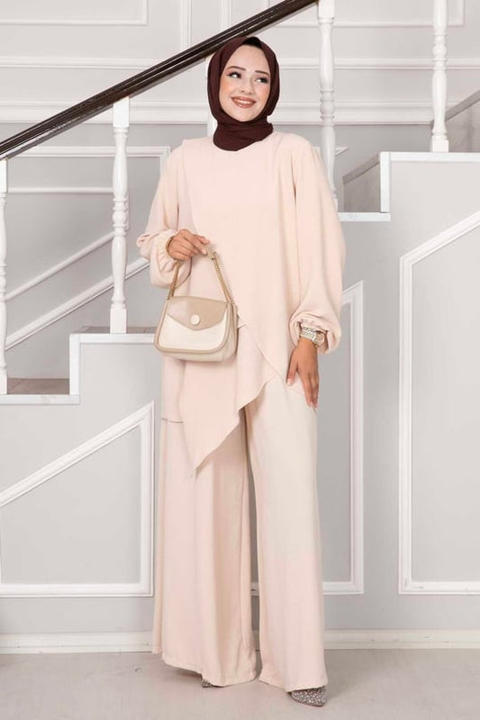 Önü Yarım Fermuarlı, Rahat Kalıp Tesettür Takım camel