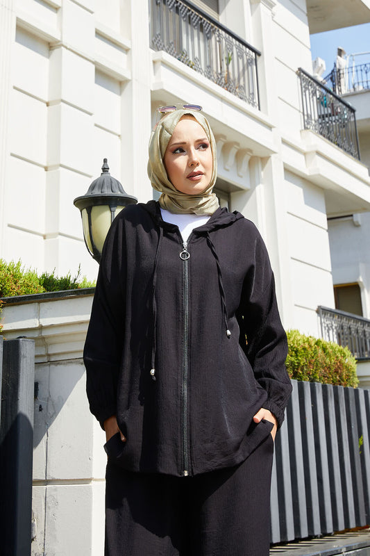 Fermuar Detaylı Kapüşonlu İkili Takım Siyah