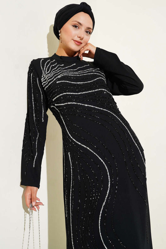 Taş Süs Detaylı Abiye Elbise Lacivert