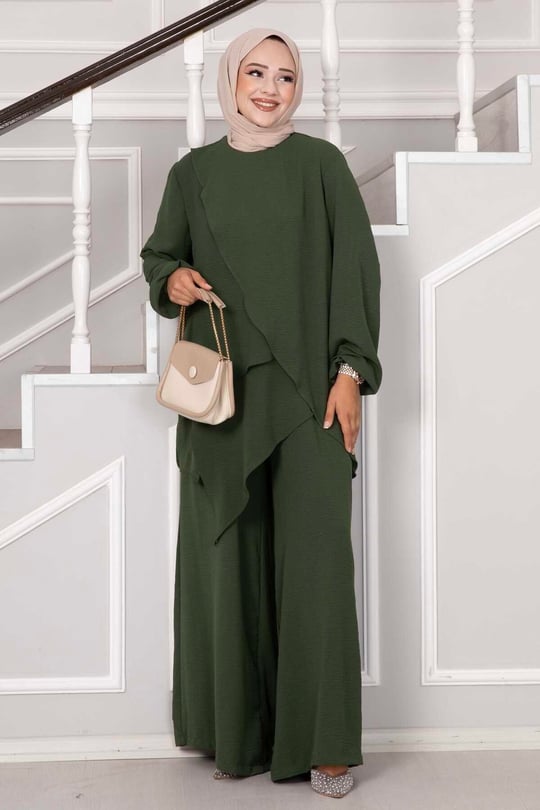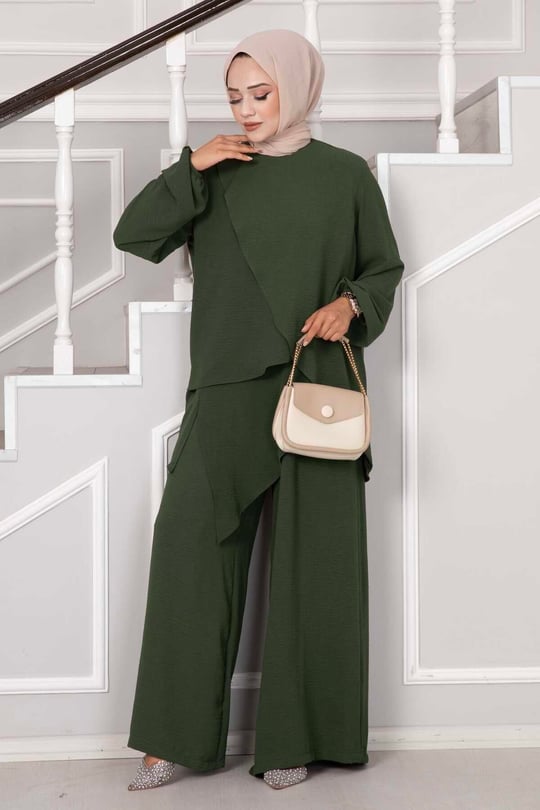 Ürün tunik ve pantolon olmak üzere iki parçadan oluşmaktadır. Tunik yakalıdır. Pantolon beli lastikli olup oldukça rahat bir takımdır.