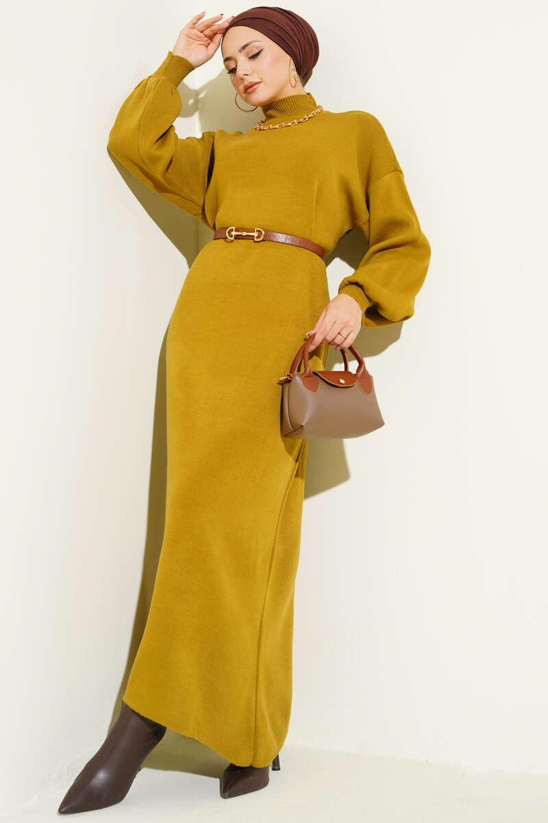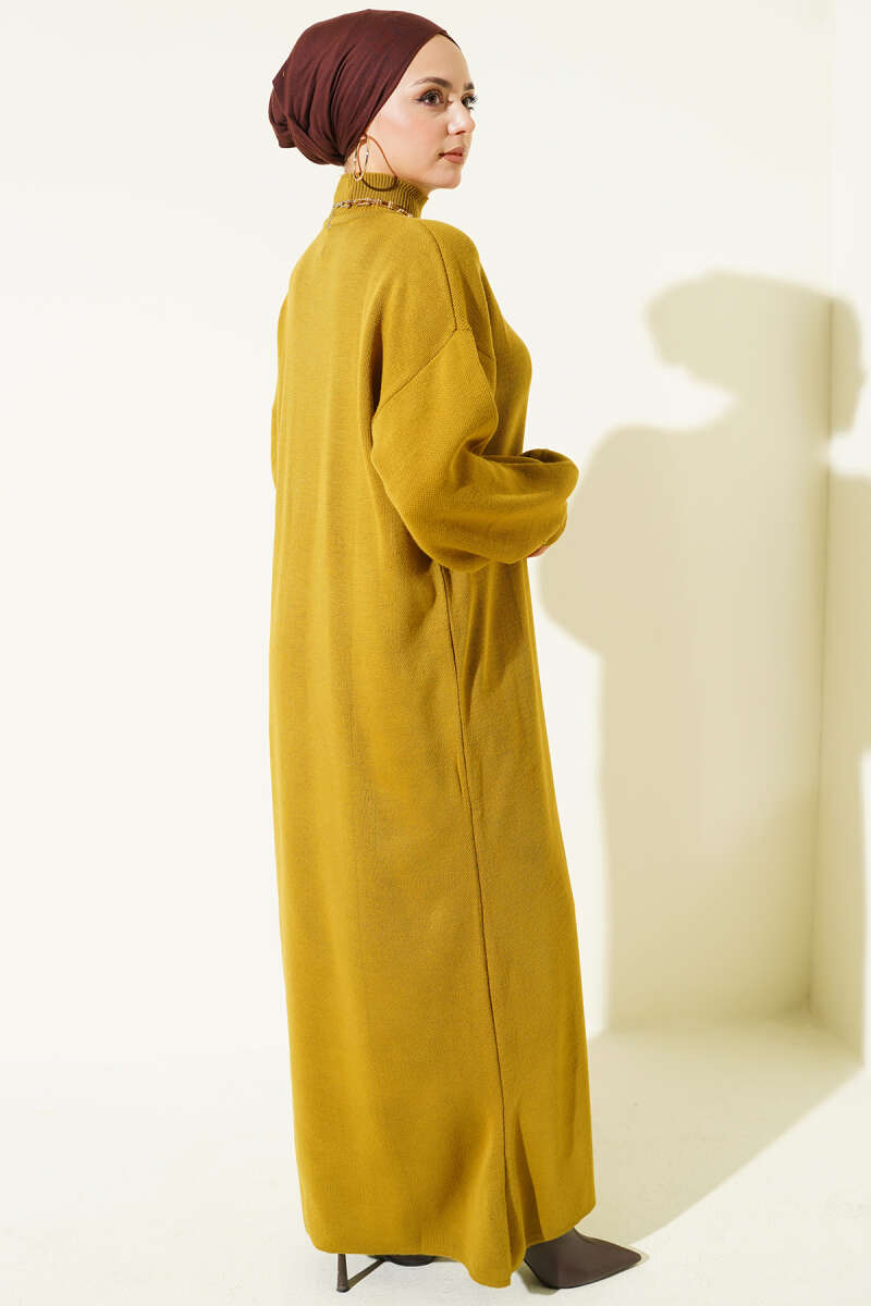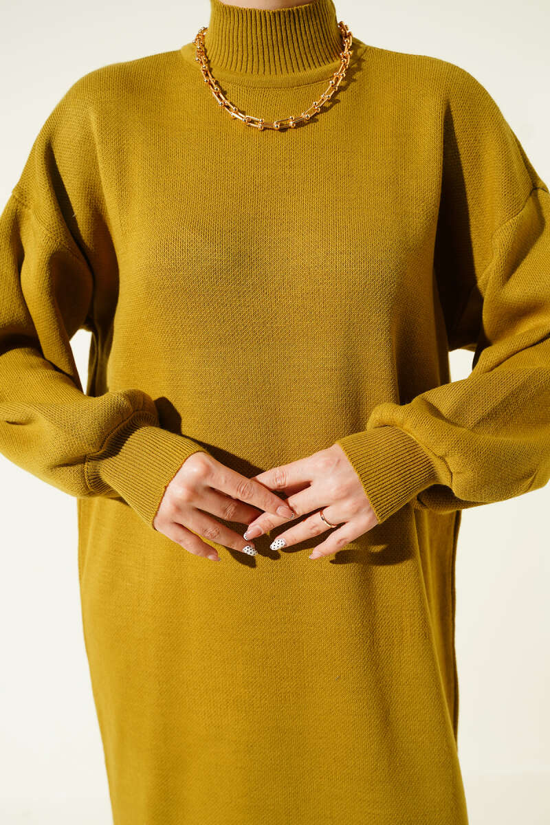 Balıkçı Yaka Düz Triko Elbise Yağ Yeşili