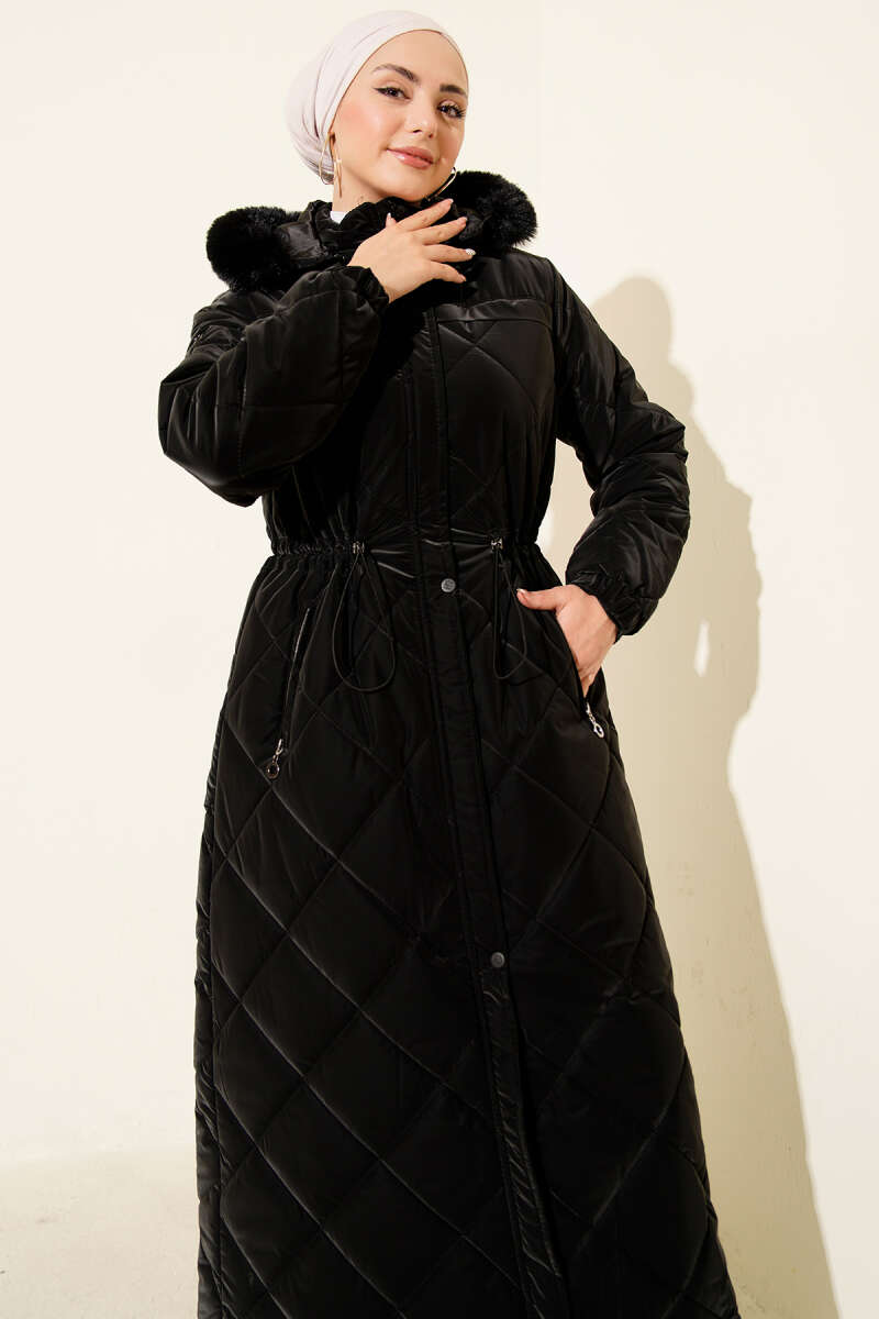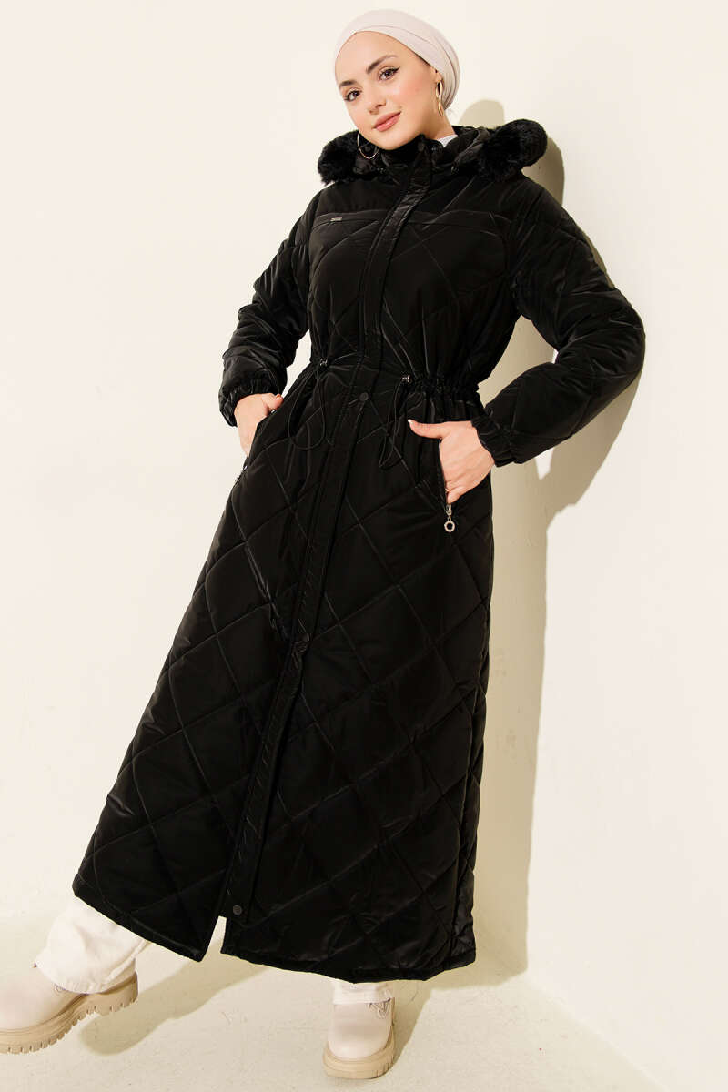 Bel Tünelli Kapüşonlu Kapitone Mont siyah