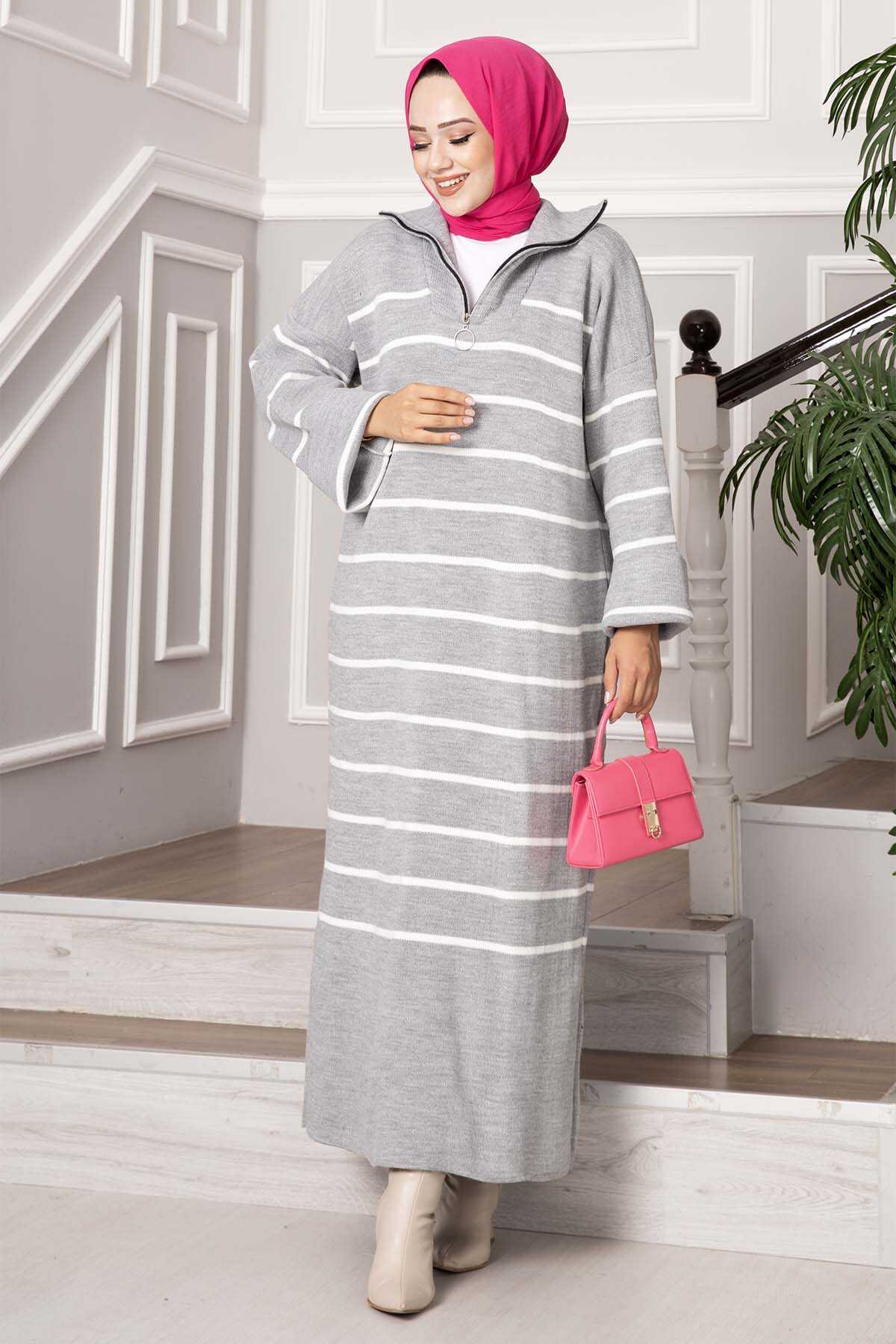 Boğazlı çizgili Triko Elbise gri