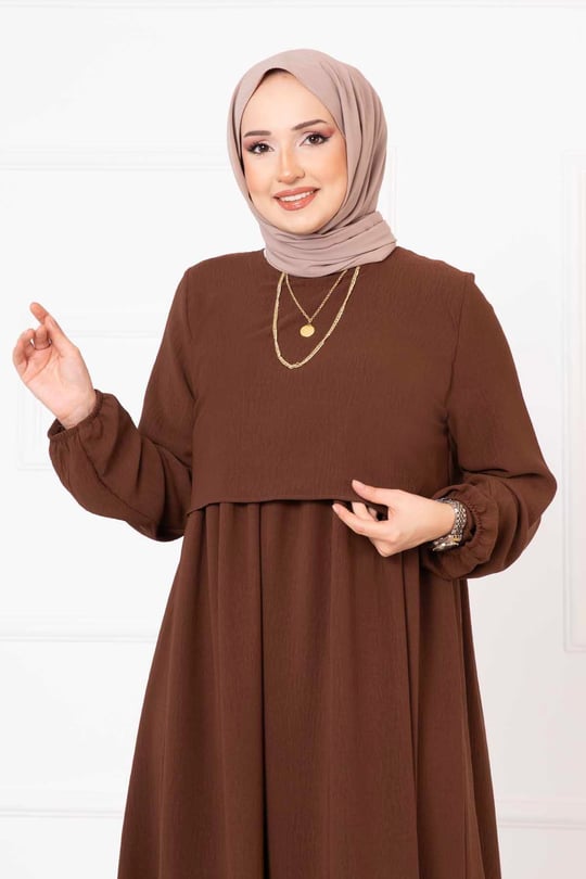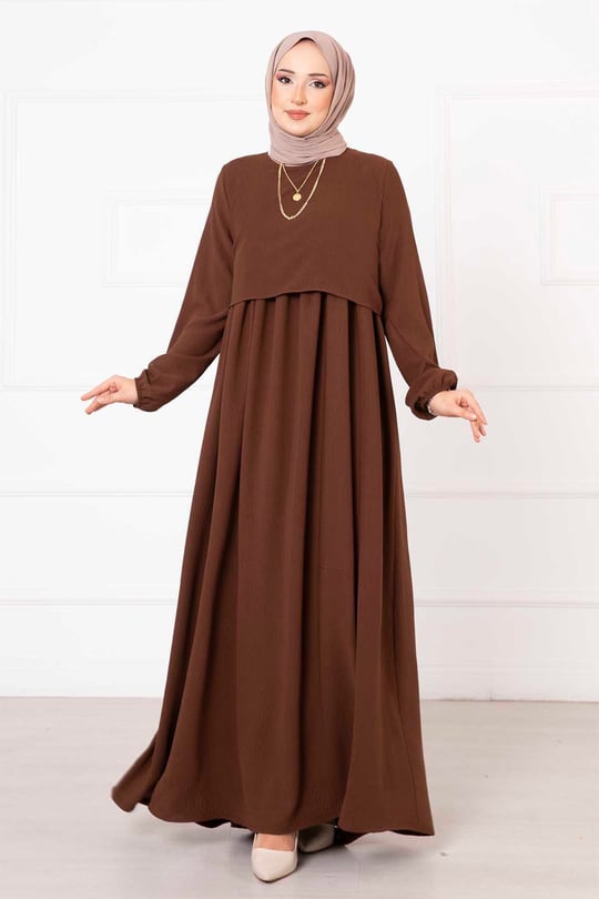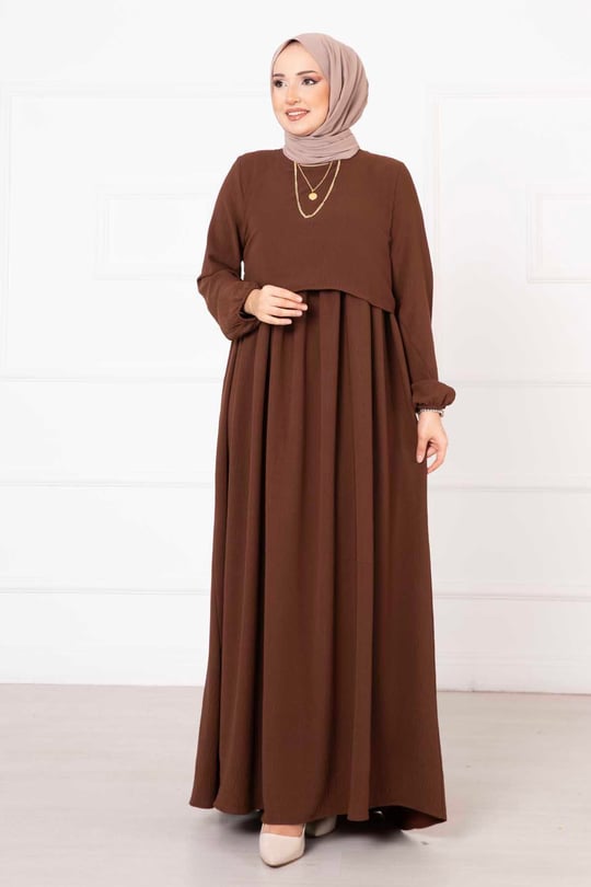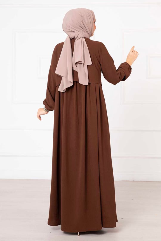 Le produit est saisonnier. La robe a un col rond, les manches sont élastiquées aux extrémités et le boléro est cousu à la robe, il ne se détache pas.