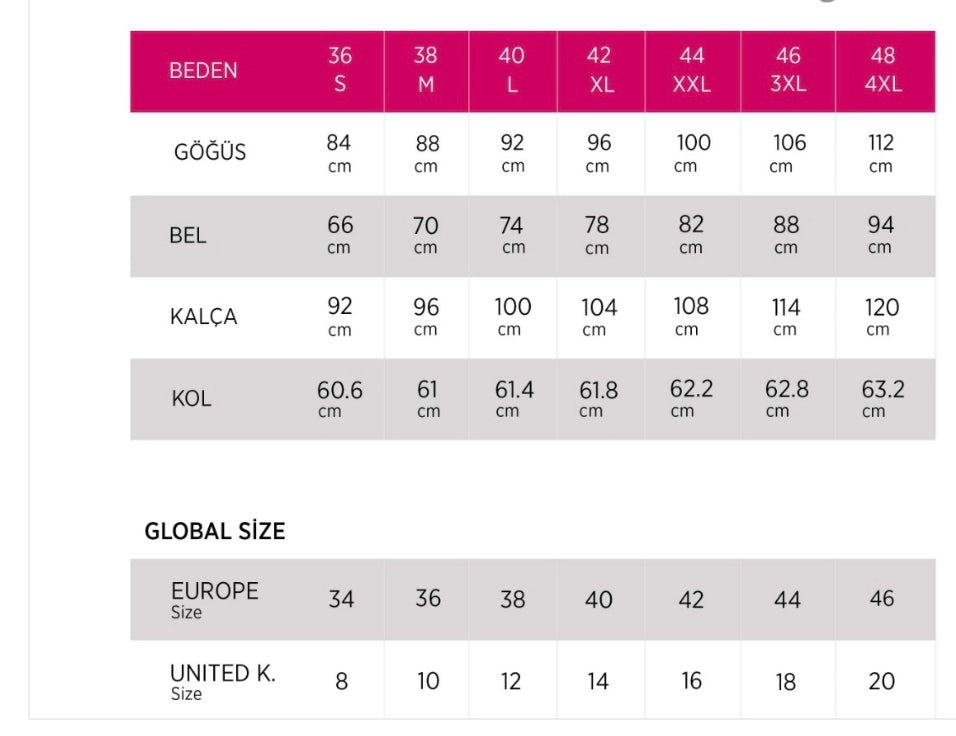 Model Ölçüleri: Beden 38 / Boy 1.66 cm / Kalça 90 cm / Bel 77 cm / Göğüs 90 cm
