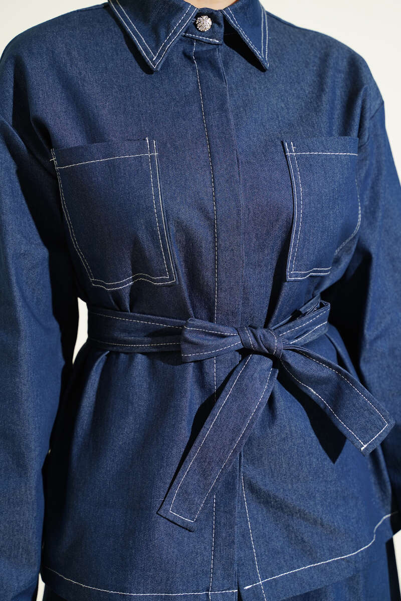 Çift Cepli Kuşaklı Etekli Kot İkili Takım indigo