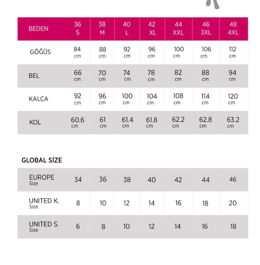 Manken Ölçüleri: Beden 38 / Boy 1.68cm / Basen 90cm / Bel 77cm / Göğüs 90cm