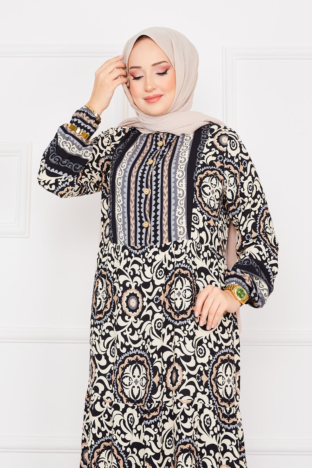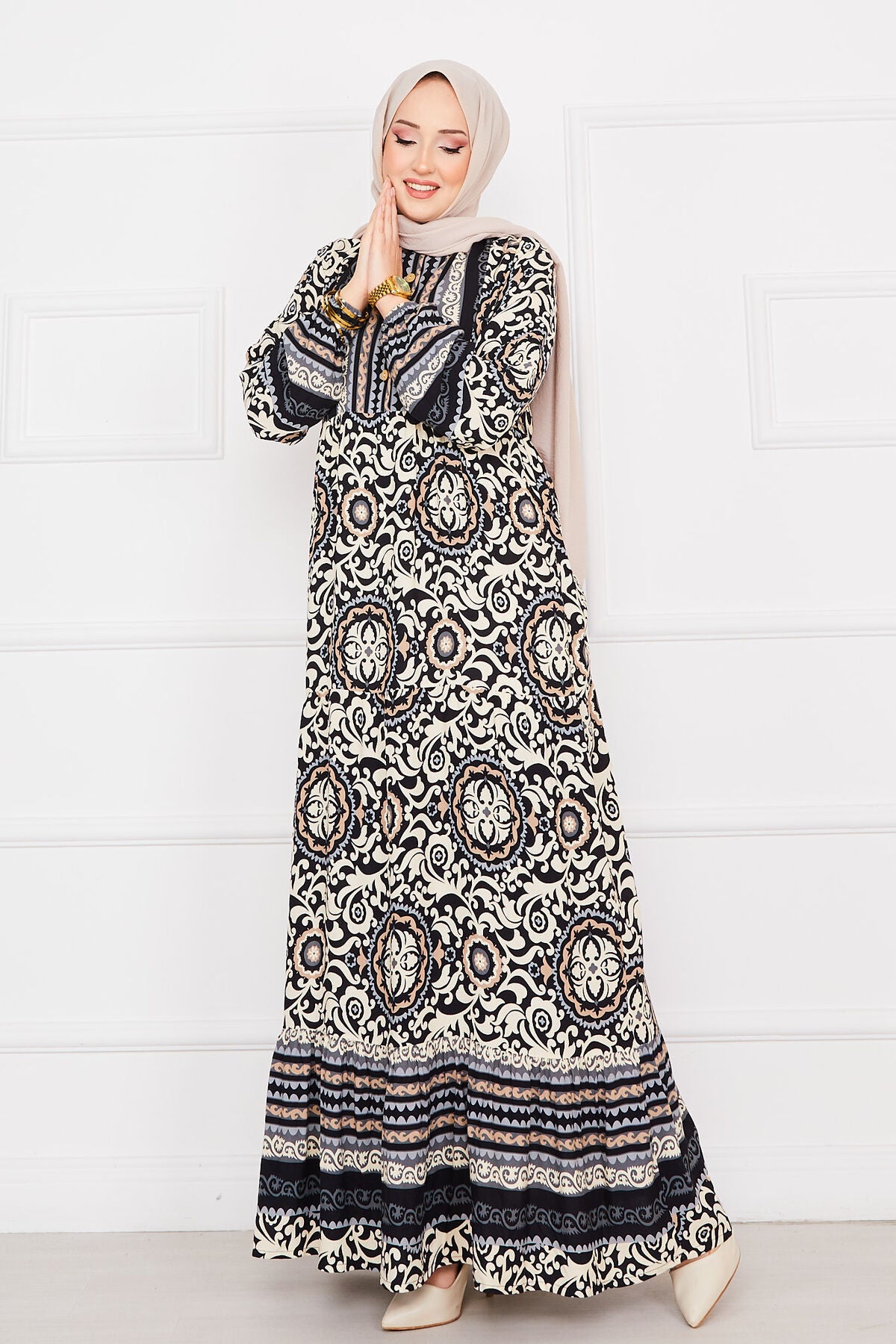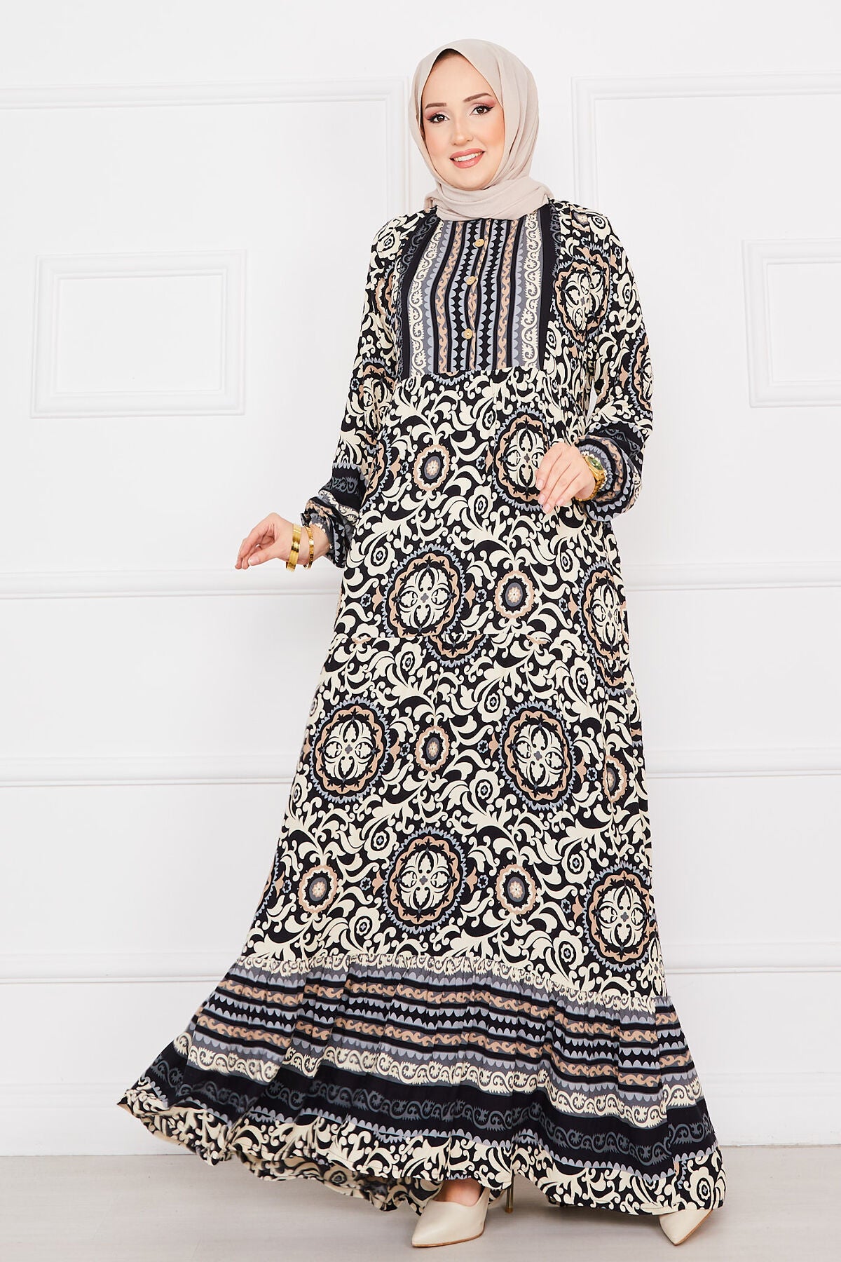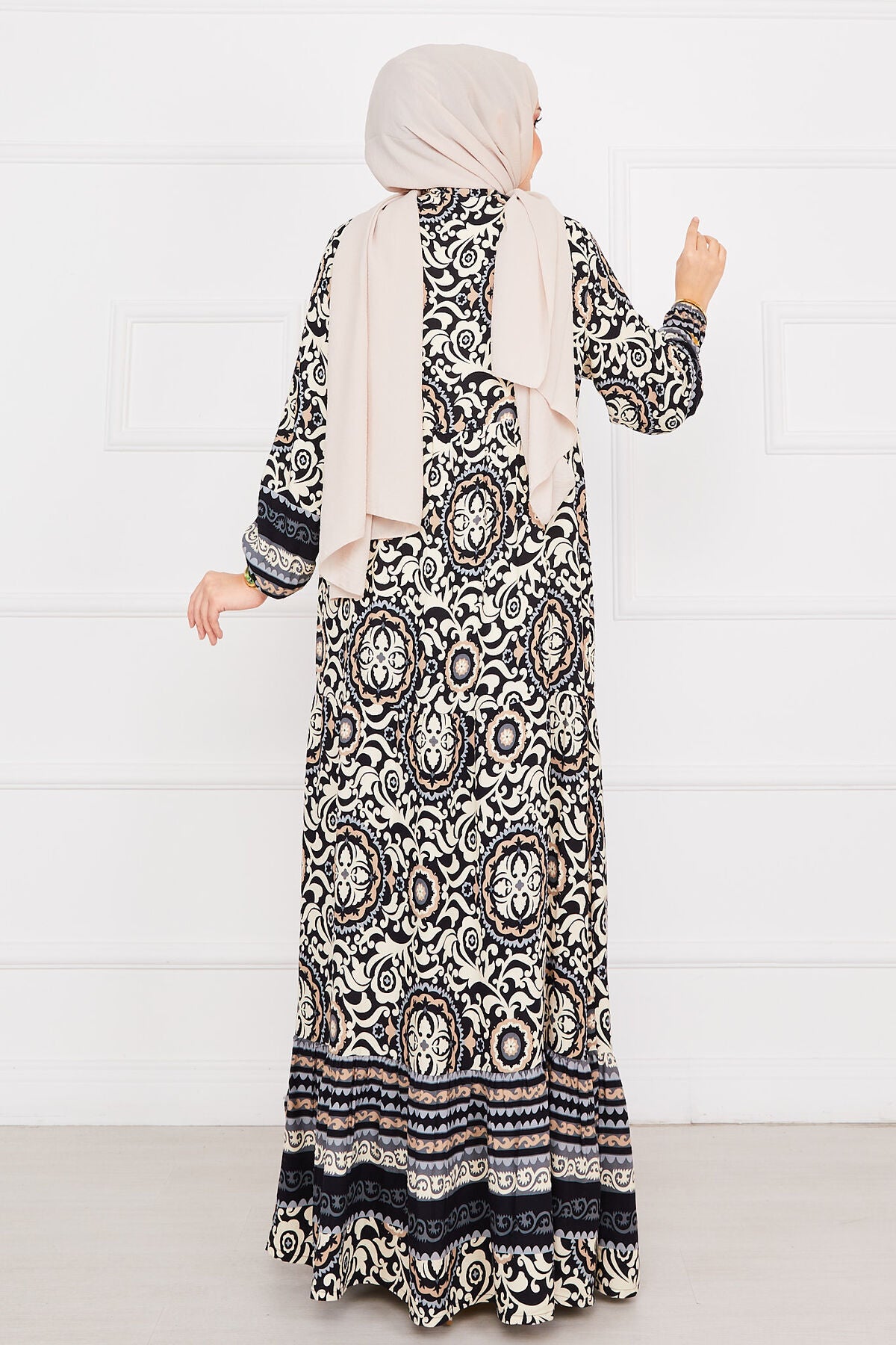 Desenli tesettur Elbise siyah