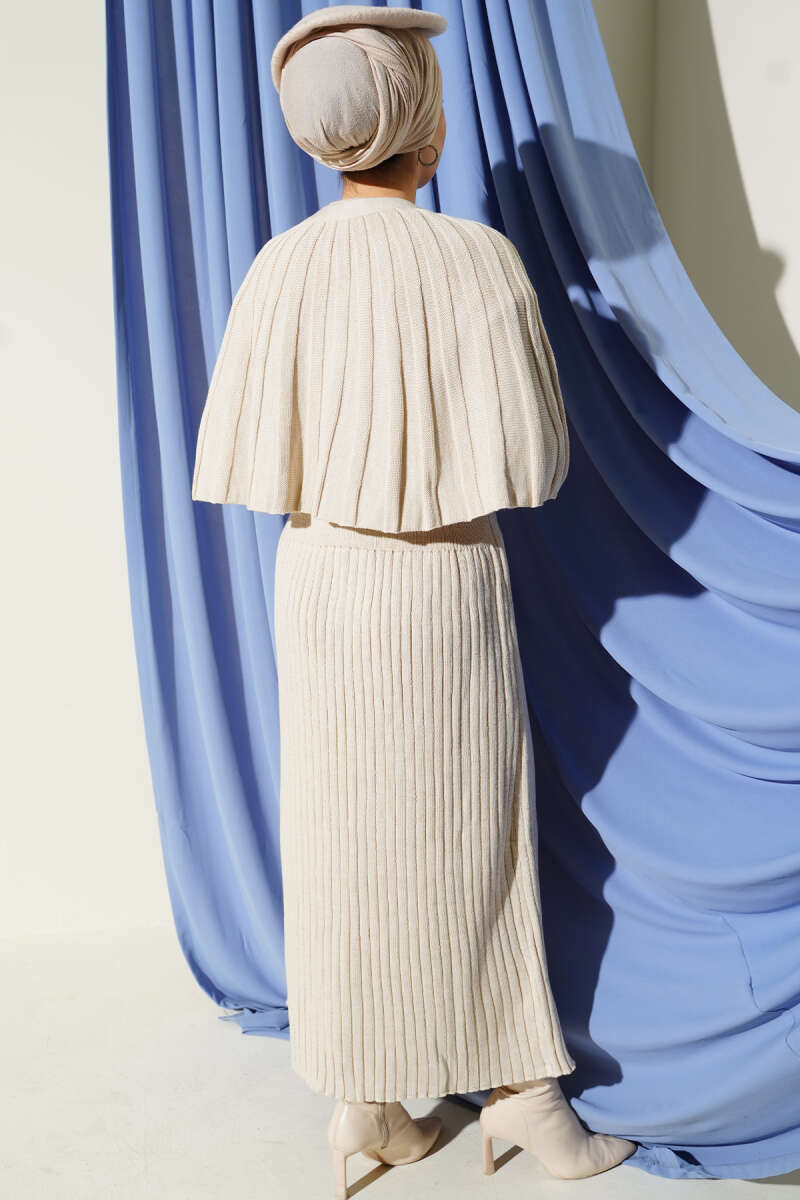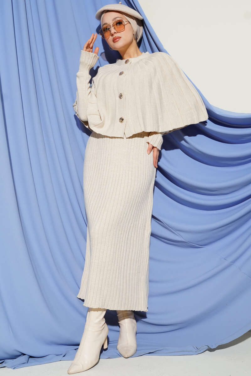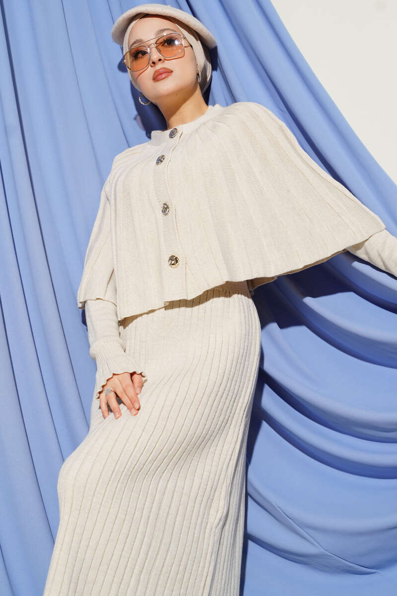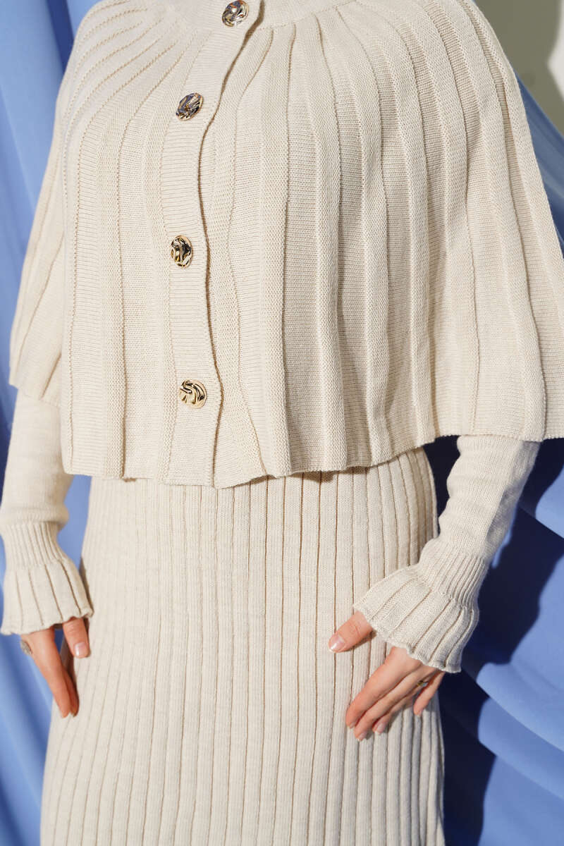 Düğmeli Pelerinli Triko Elbise Takım taş