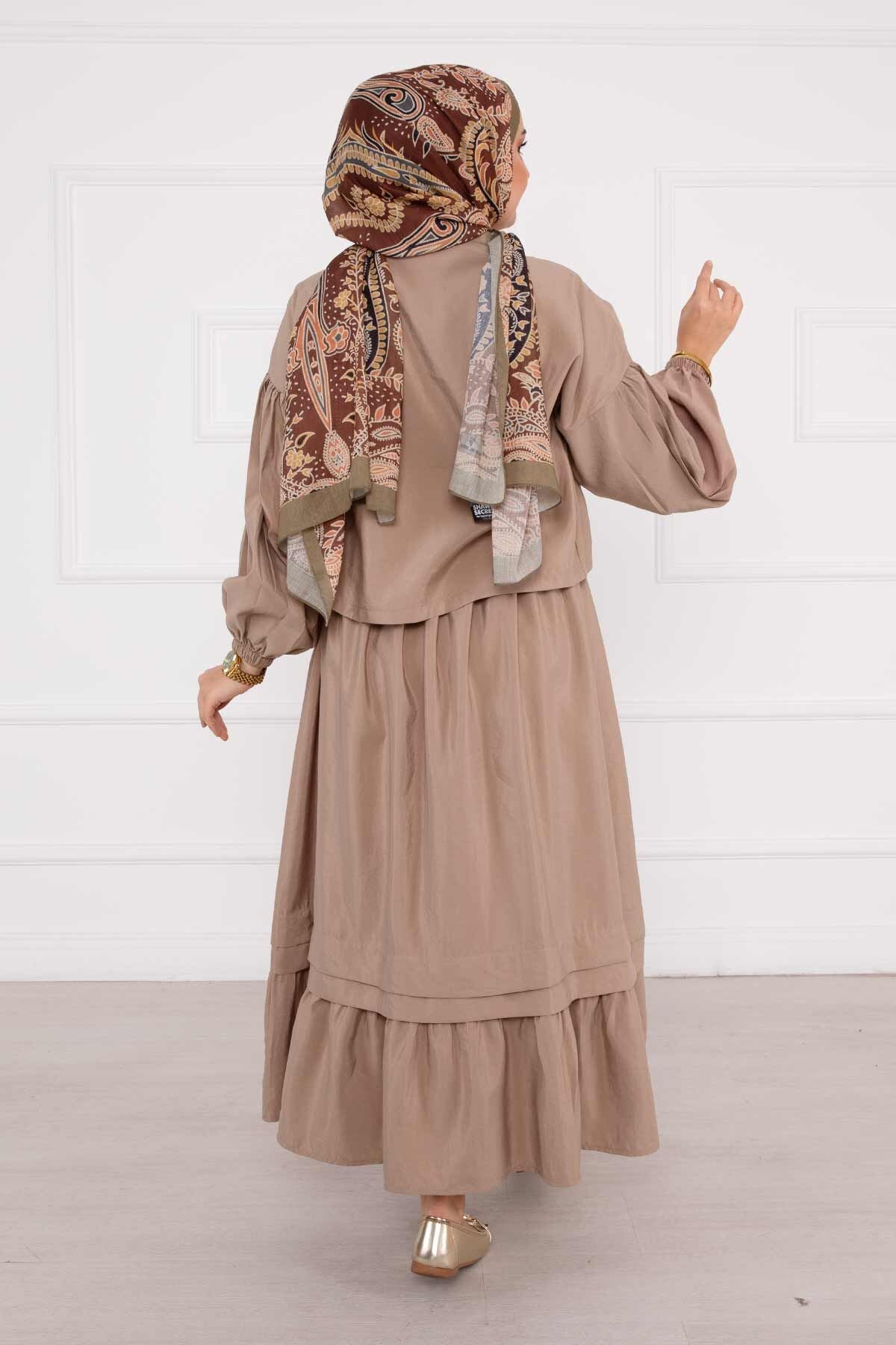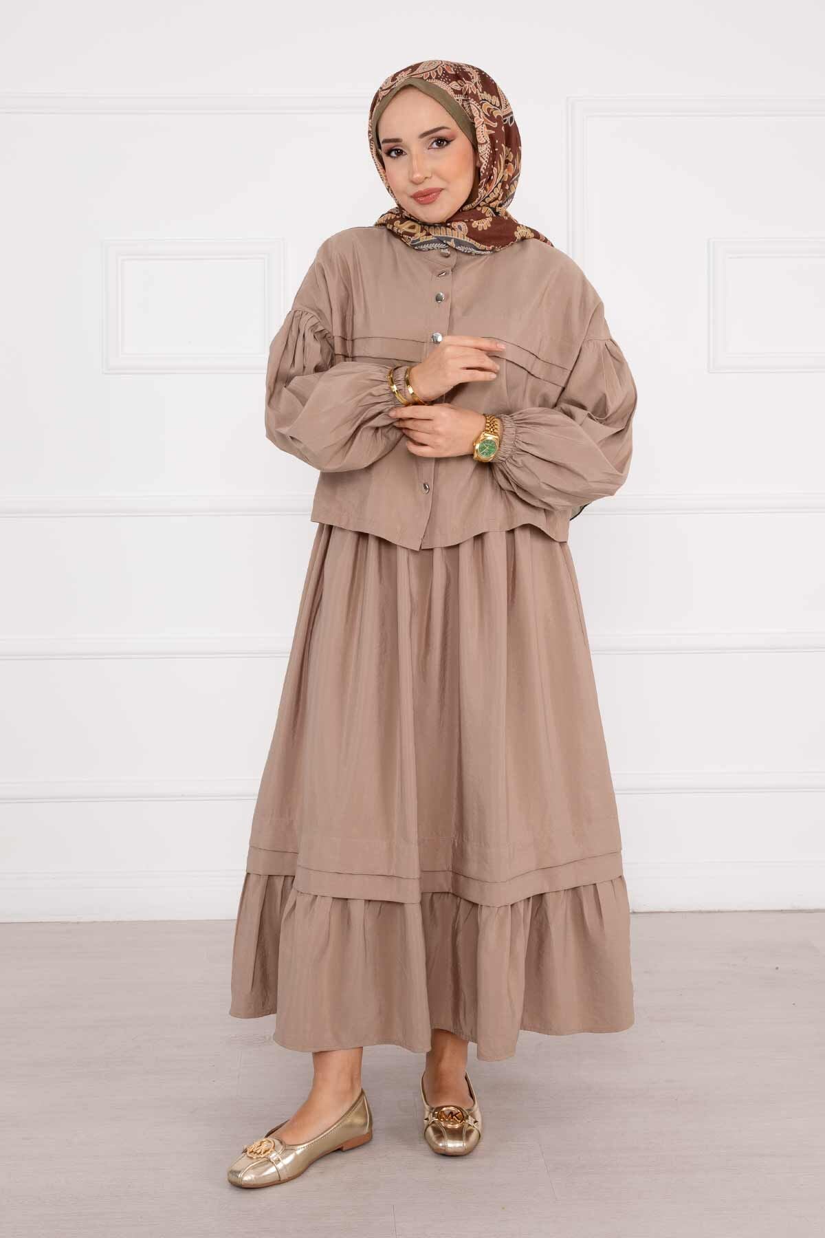 Ürün mevsimliktir. Etek ve ceket olarak iki parçadır. Etek beli lastikli olup alt kısmında nervür detayı bulunmaktadır. Crop aktif düğmelidir, kolları büzgü detaylıdır.