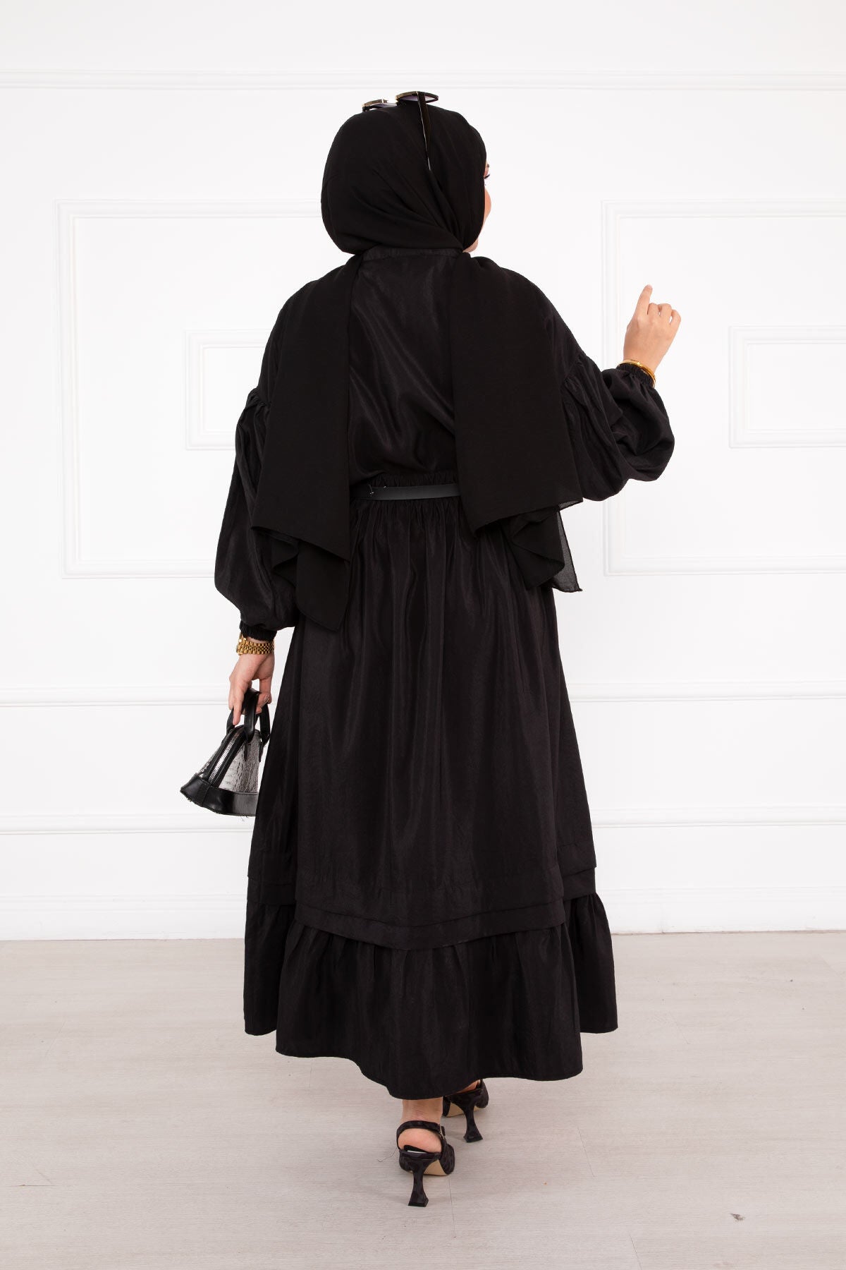 Ürün mevsimliktir. Etek ve ceket olarak iki parçadır. Etek beli lastikli olup alt kısmında nervür detayı bulunmaktadır. Crop aktif düğmelidir, kolları büzgü detaylıdır.