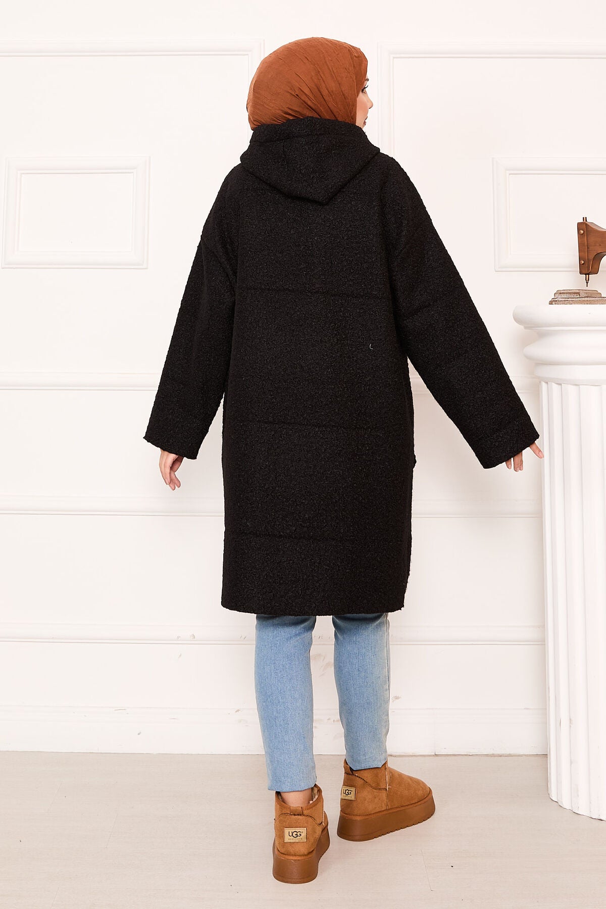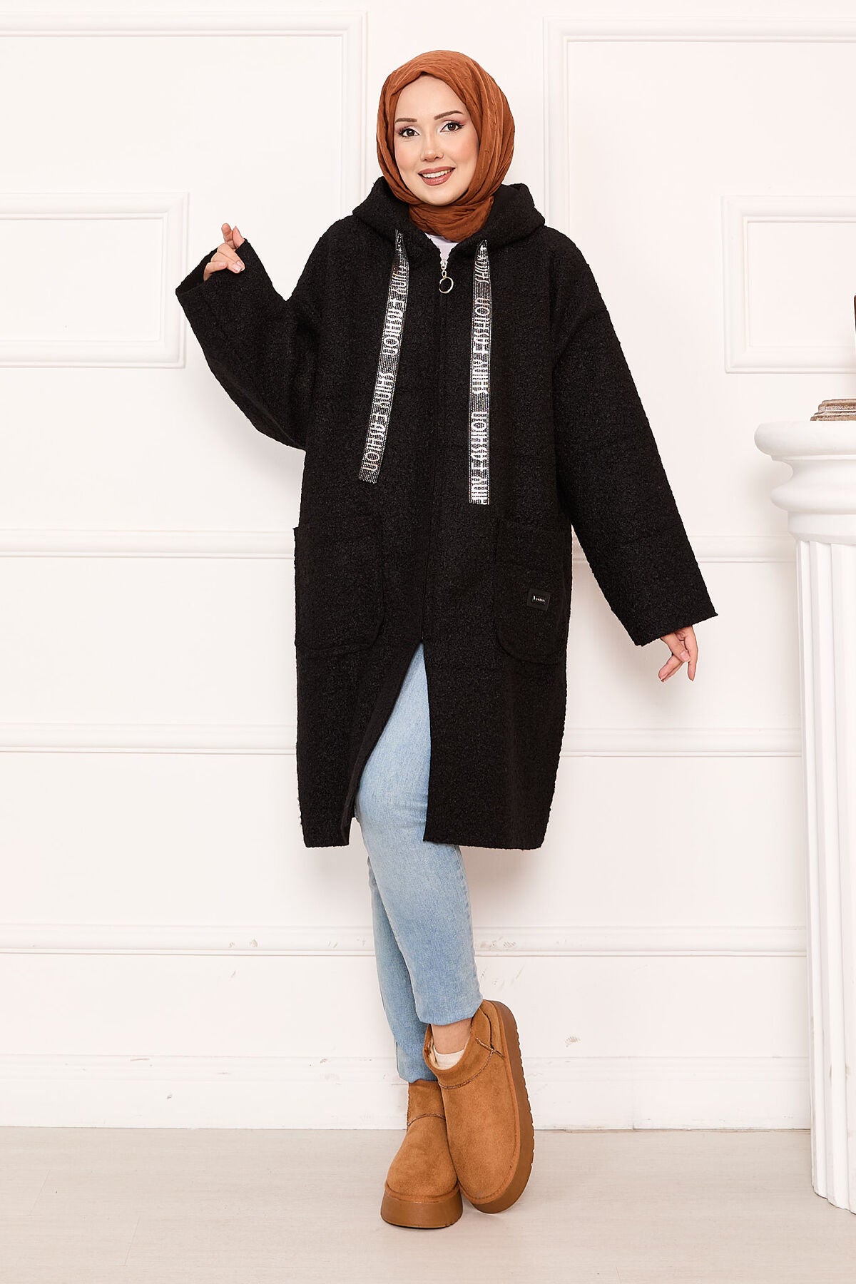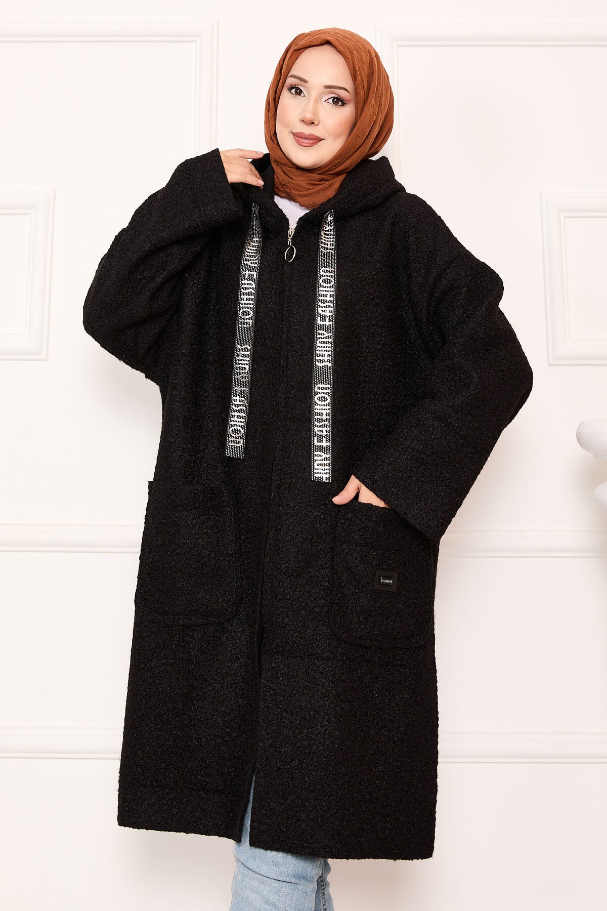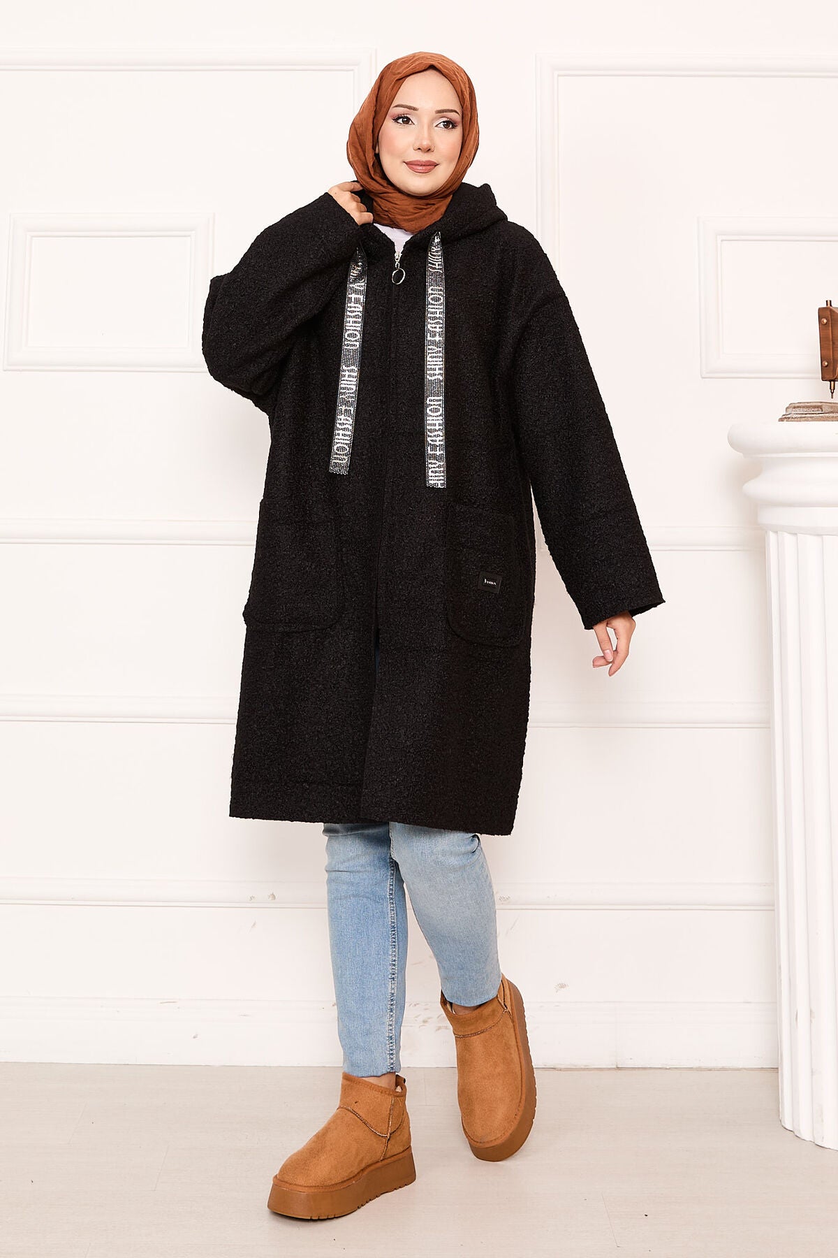 Ürün sonbahar-kışlıktır. Yeni sezon fermuarlı kapüşonlu ve simli şerit detaylıdır. Sağ ve sol taraf olmka üzere ön ceplidir.