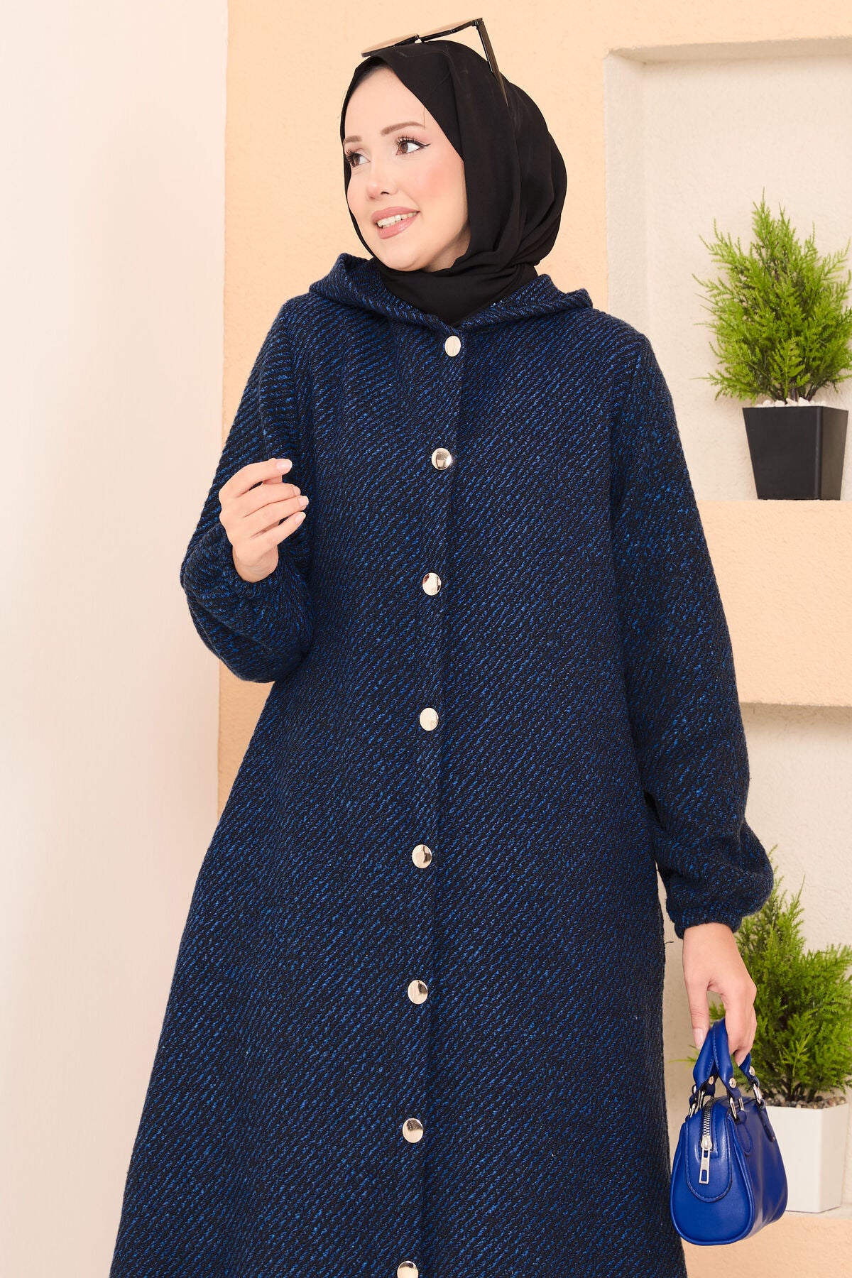 Ürün sonbahar-kışlıktır. Kapüşon detaylı boydan gold düğmeli balıksırtı desenli kaşe tesettür kap. Kap modelimizin önü kısa arkası uzun olup kol manşetleri lastik detaylıdır. Sağ ve sol olmak üzere çift ceplidir.
