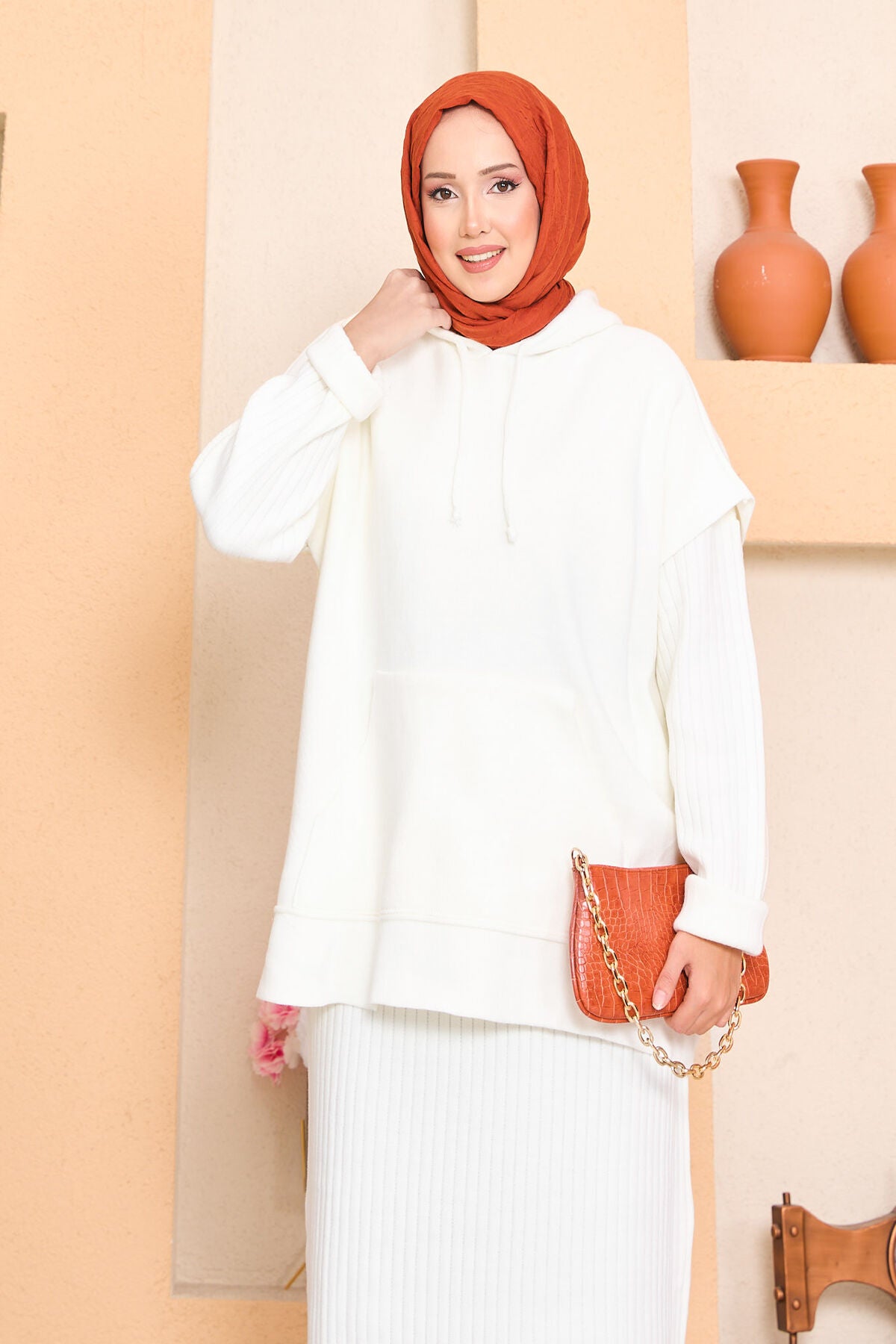 Kapüşonlu Süveter Detaylı İkili Elbise Takım beyaz