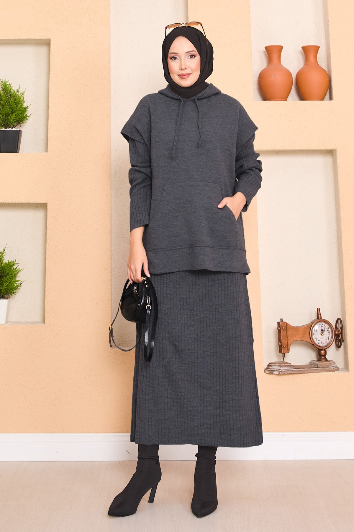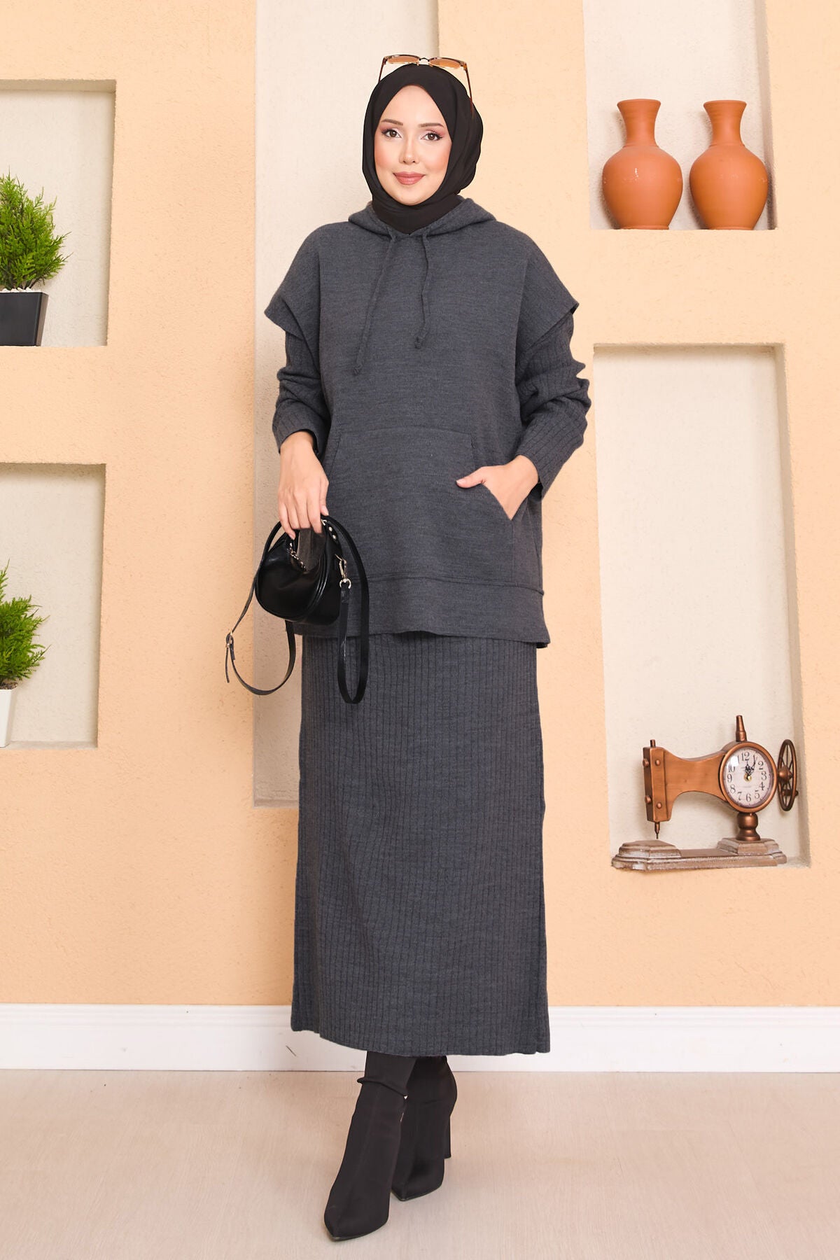 Ürün sonbahar-kış mevsimi içindir. Kapüşonlu süveter ve elbise olmak üzere iki parçadan oluşmaktadır.Elbisemiz boydan çizgilidir. Süveterimizin önünde kanguru cep bulunmaktadır.