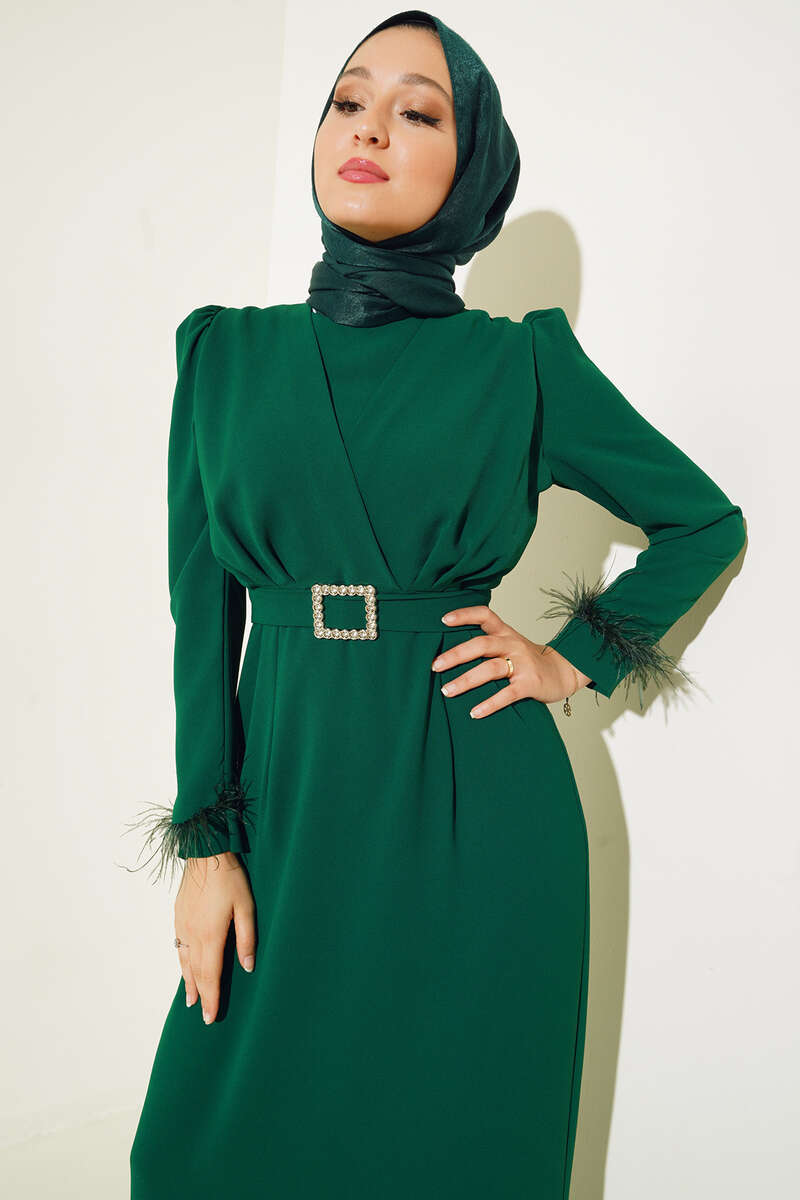 Yeni sezon elbisemiz dikkat çeken şık tasarımıyla sizler için geldi. Elbisemizin kol uçları tüylüdür. Kemer tokası ve kuşağı bulunmaktadır. Sırtı fermuarlıdır. Her ortamda rahatlıkla giyebilirsiniz. Farklı renk seçenekleri mevcuttur.
