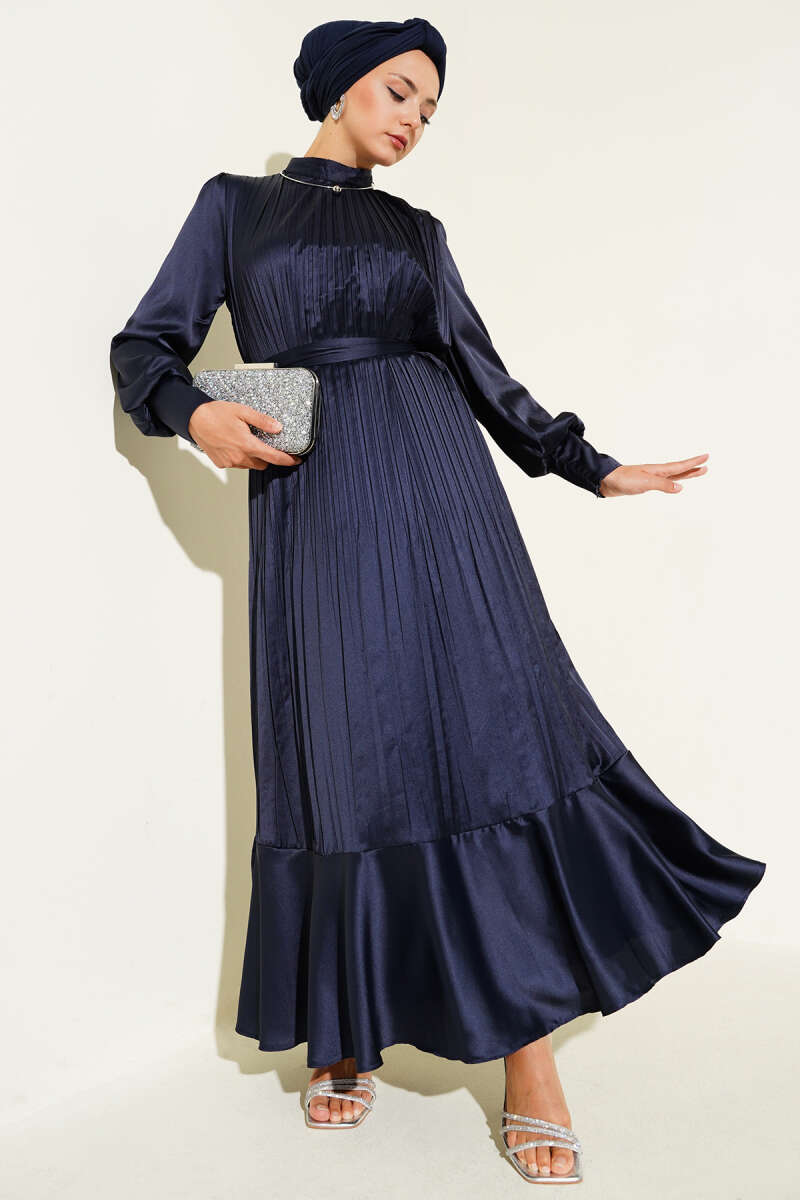 Kol Fermuarlı Piliseli Abiye Elbise Lacivert