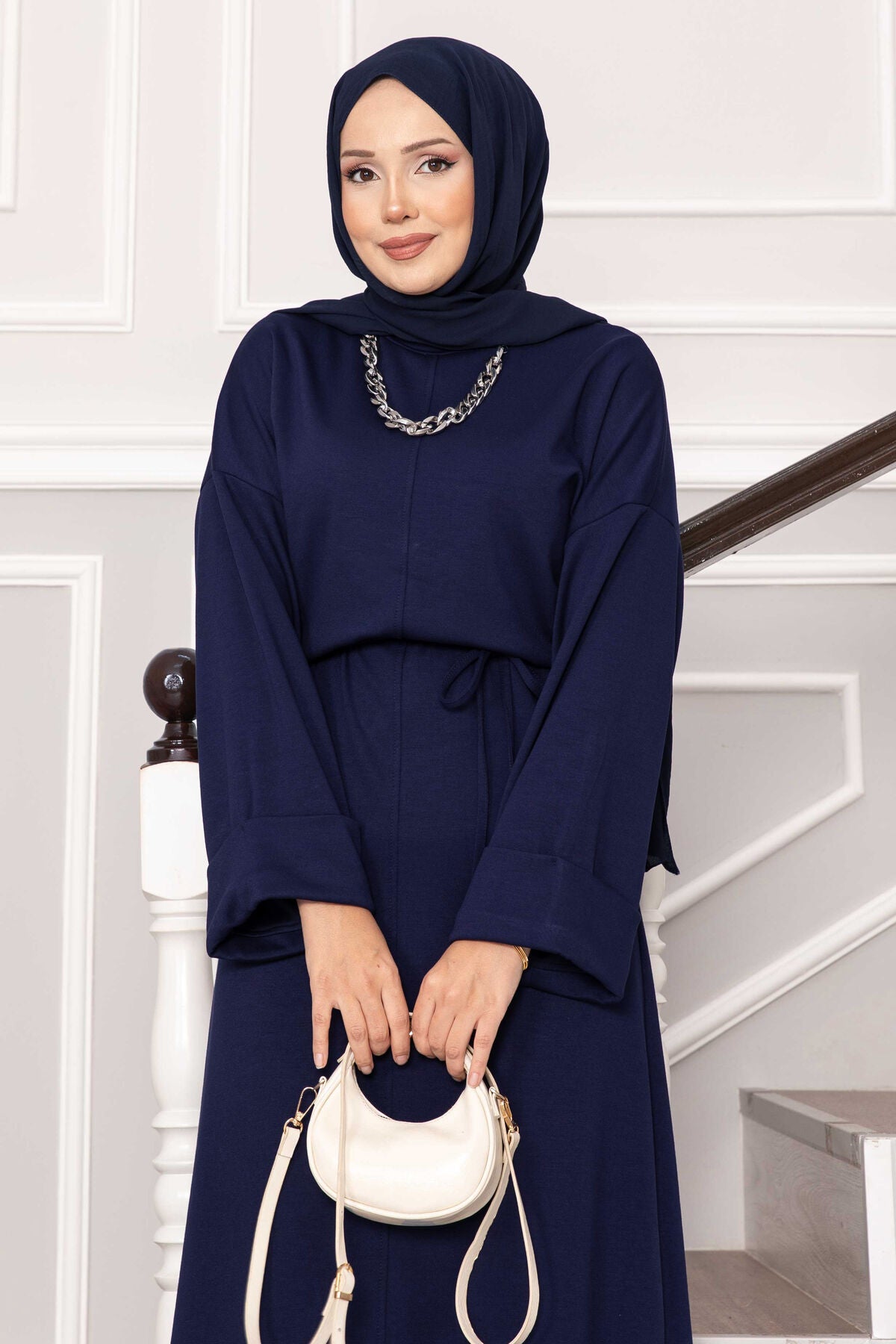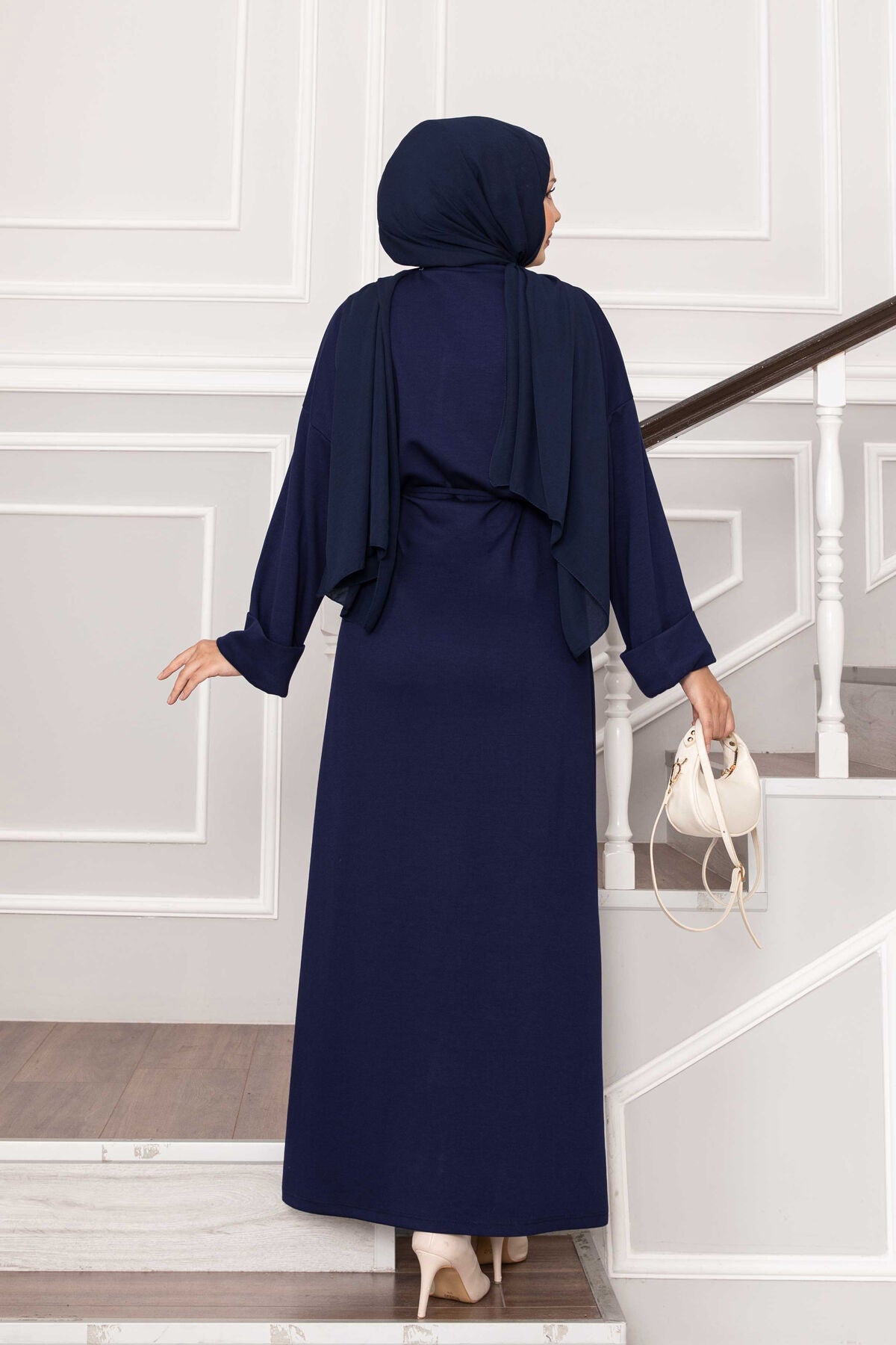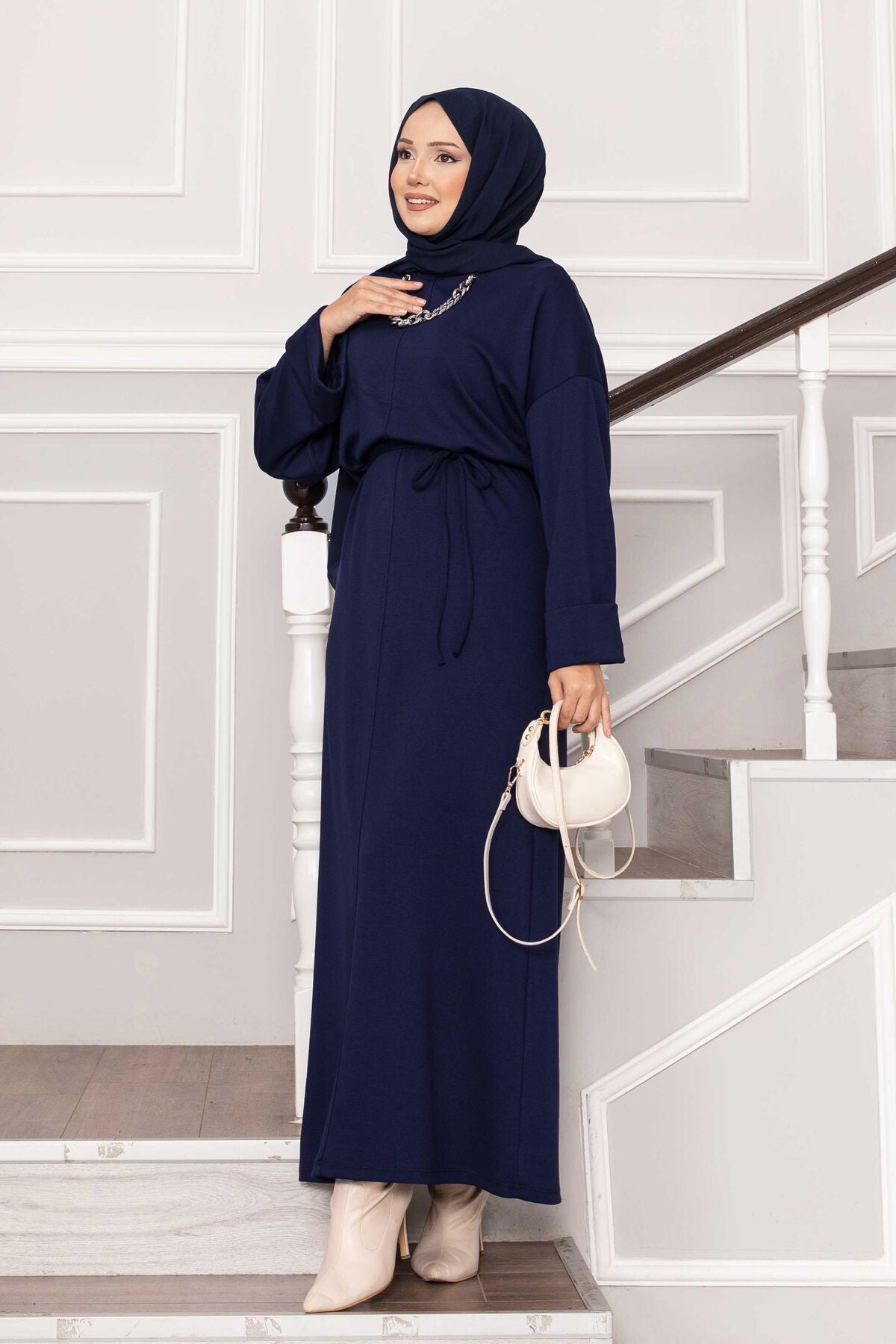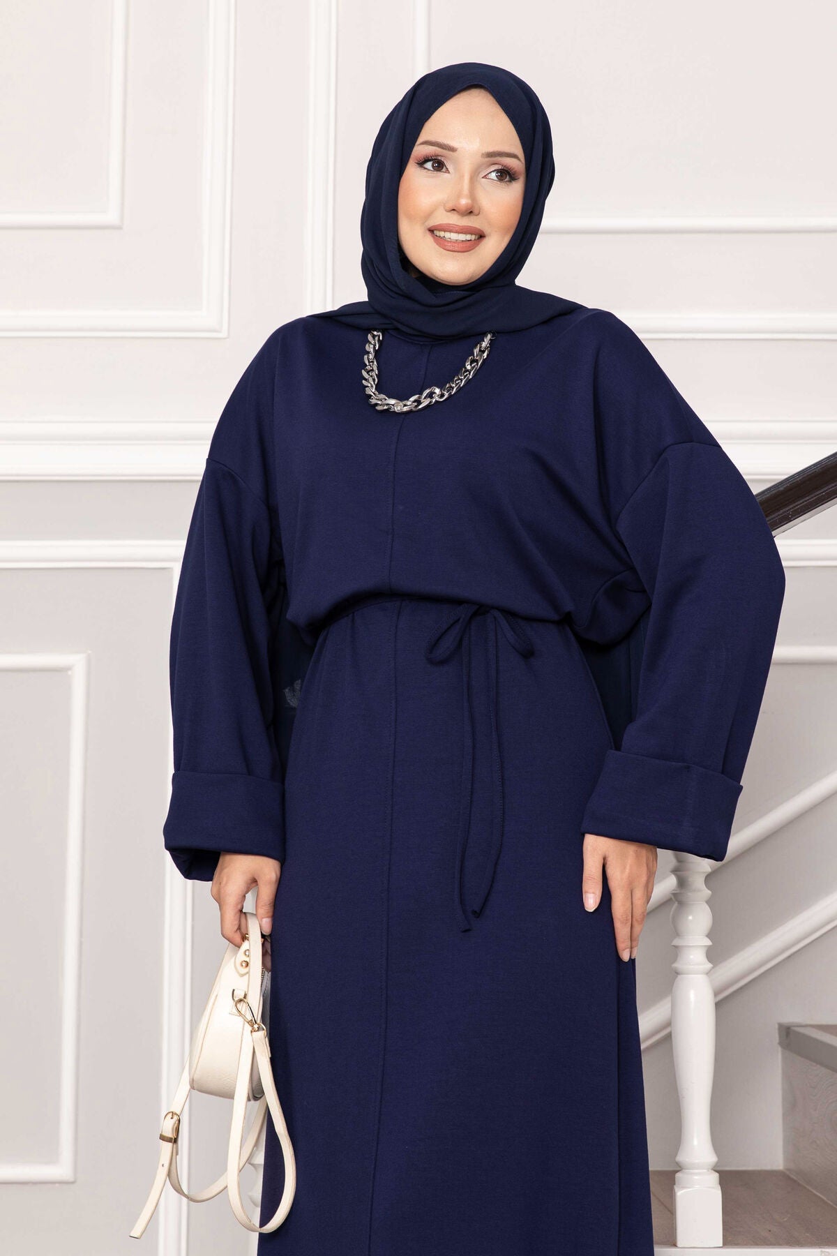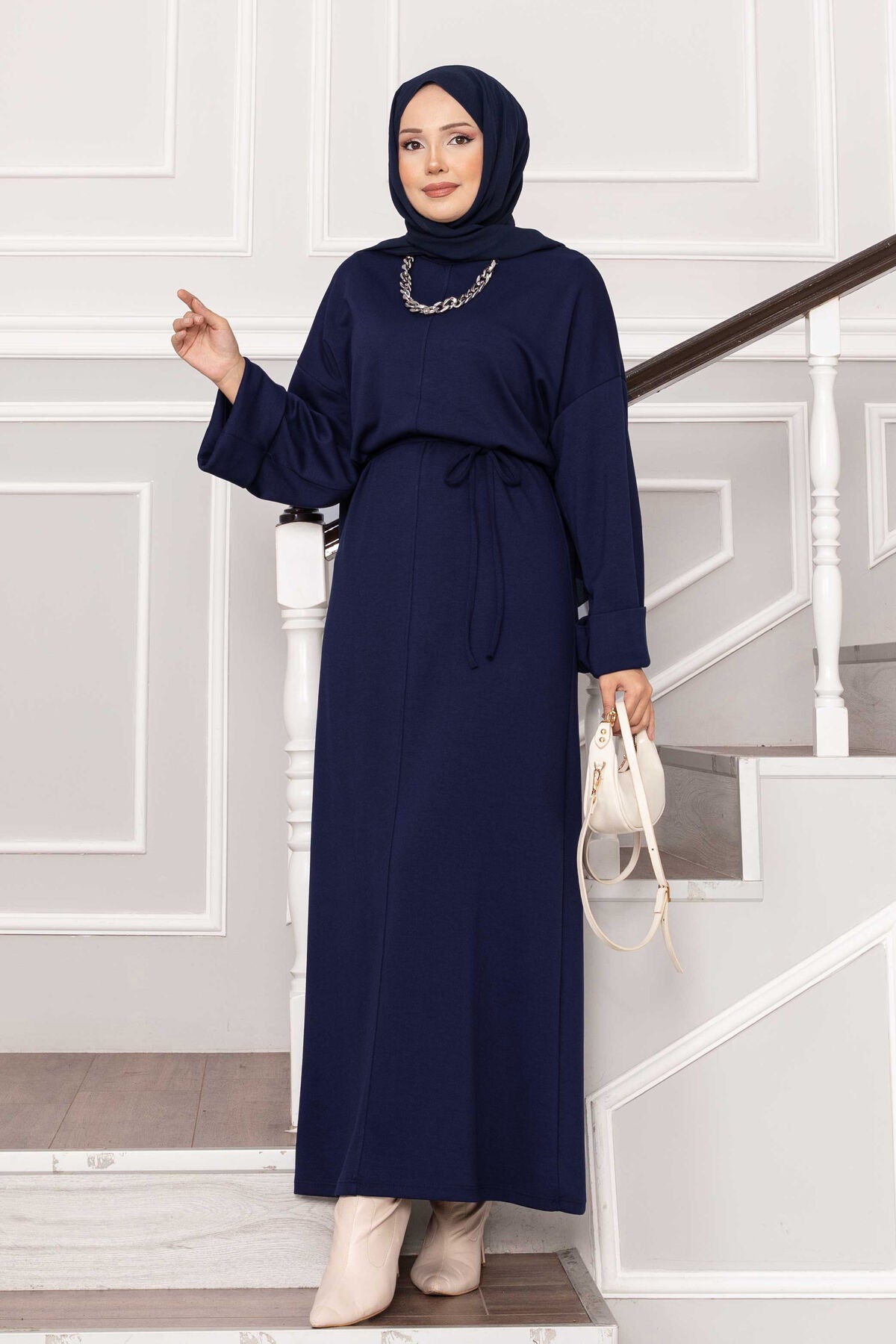 Ürün Sonbahar & Kış modasıdır. Kolu katlana bilir seyyar ip kuşaklı tam boy tesettür elbise"
