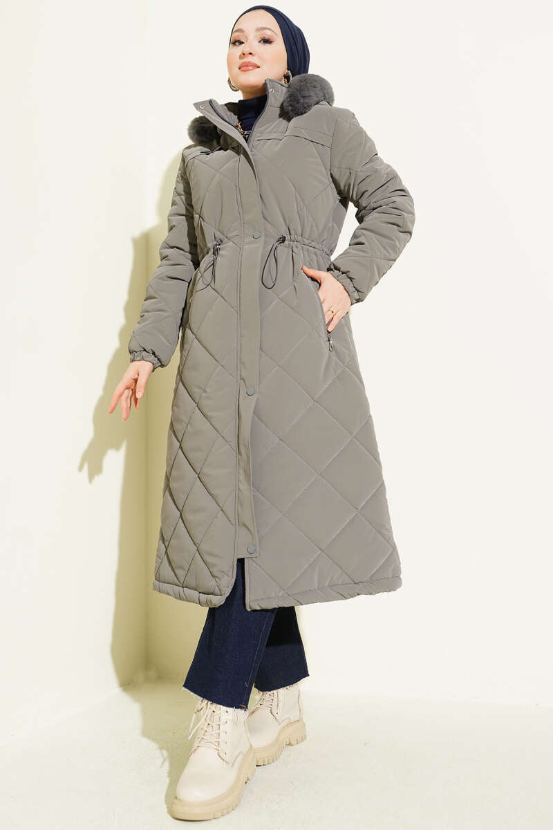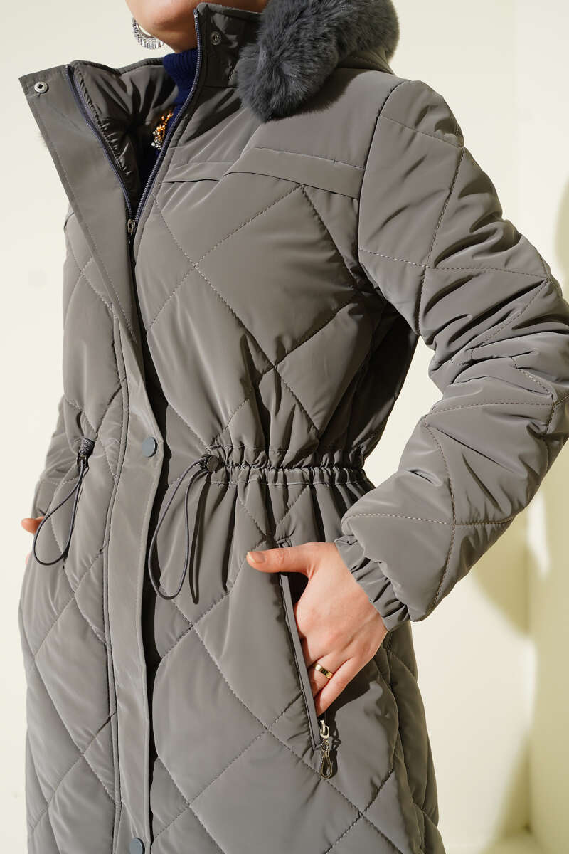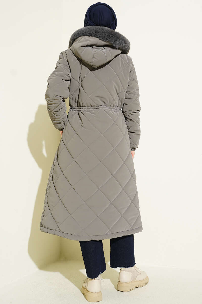 Kürk Kapüşonlu Kapitone Uzun Mont gri