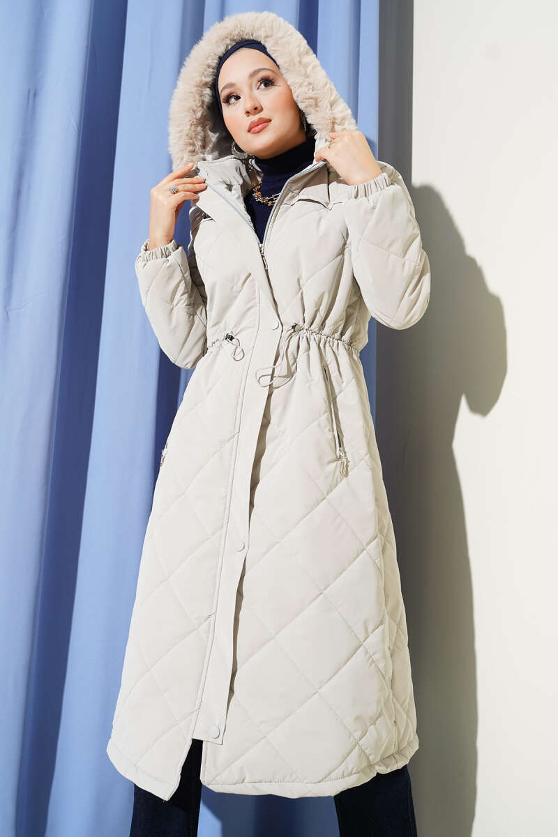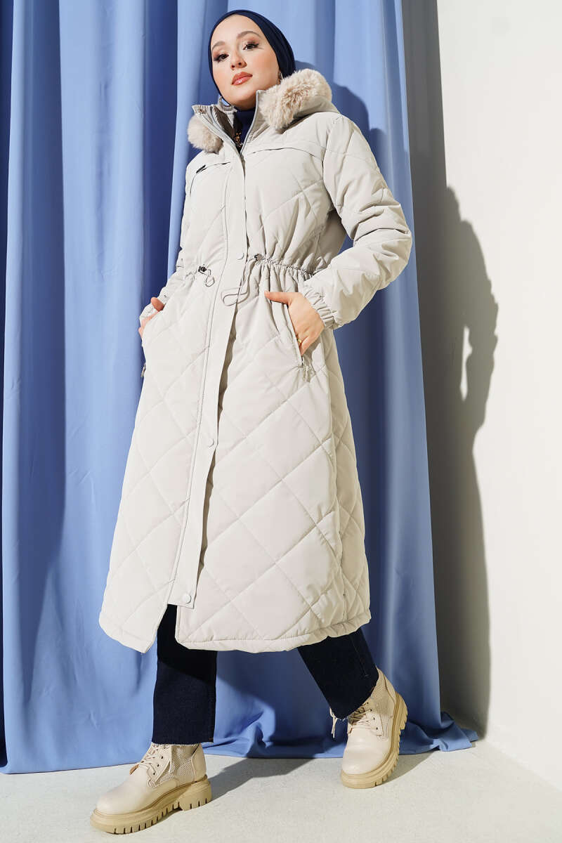 Kürk Kapüşonlu Kapitone Uzun Mont Taş
