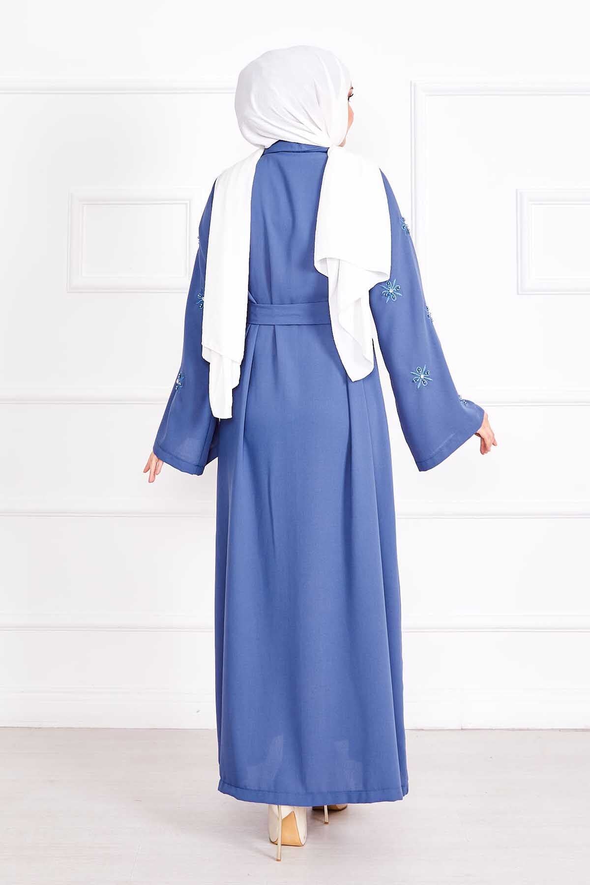 Ürün mevsimliktir. Kolları nakışlı ve düşmey yapmayan inci ve kristal taşlı belden seyyar kuşaklı gizli düğmeli şık ferace