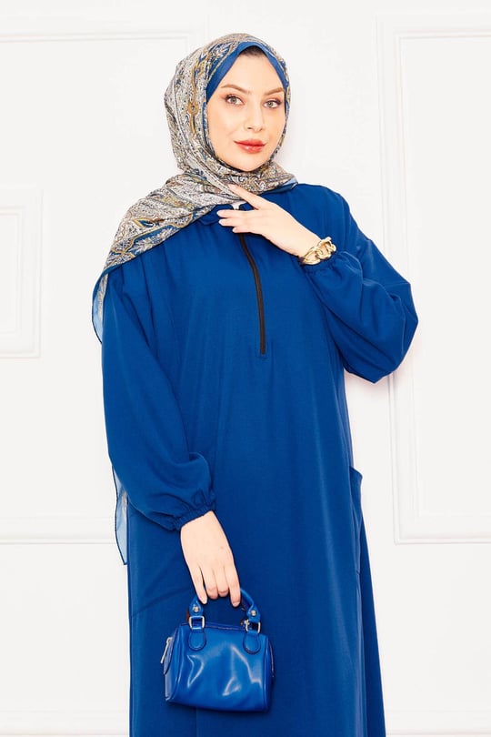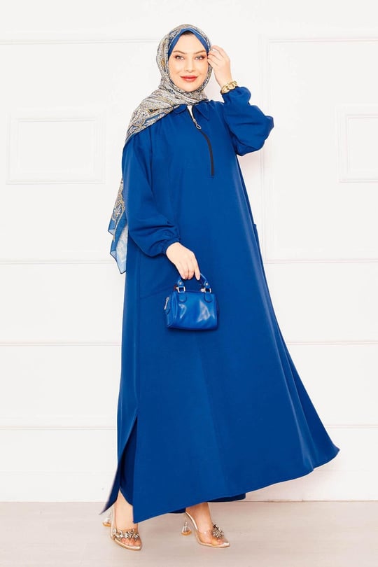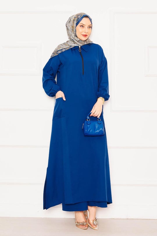 Önü Yarım Fermuarlı, Rahat Kalıp Tesettür Takım saks