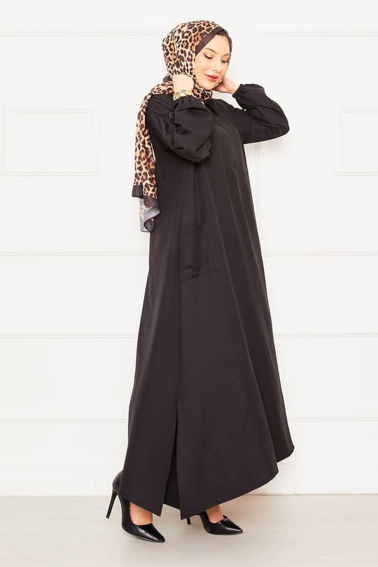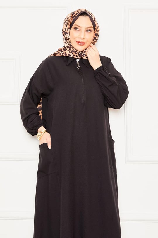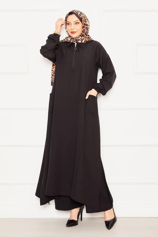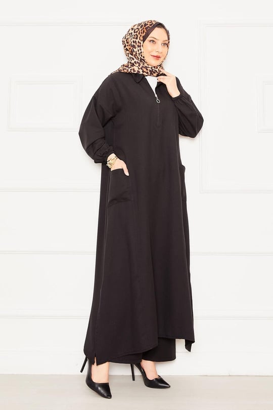 Önü Yarım Fermuarlı, Rahat Kalıp Tesettür Takım Siyah