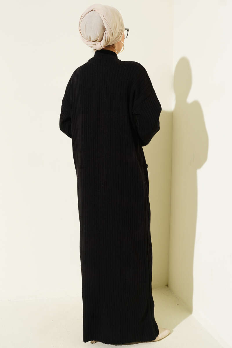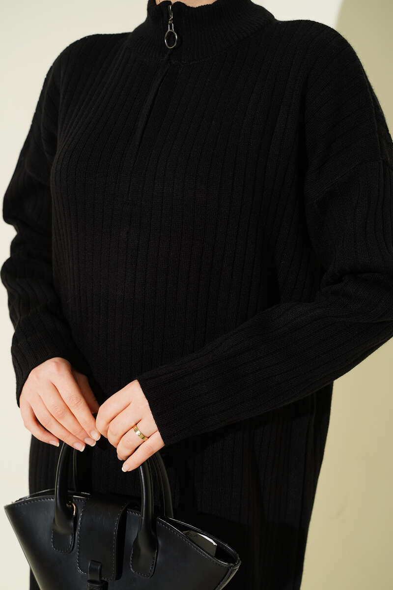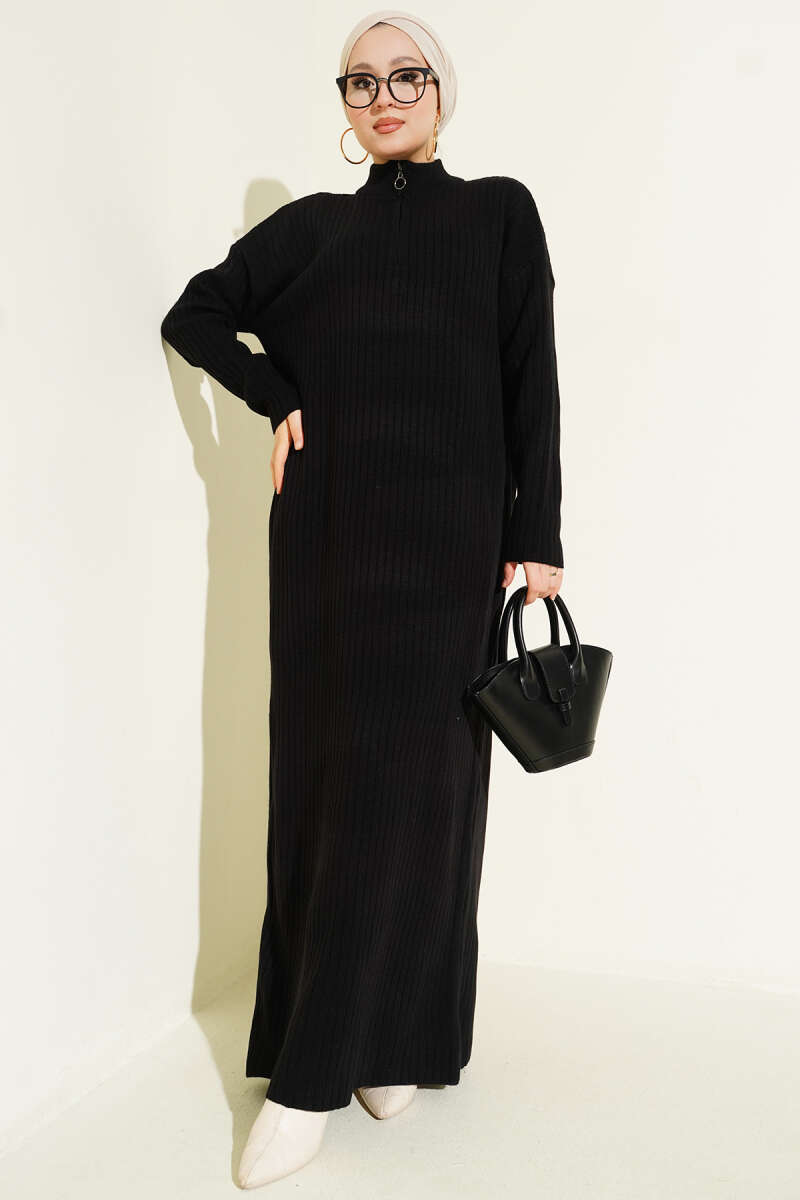 Yarım Fermuarlı Dik Fitilli Triko Elbise siyah