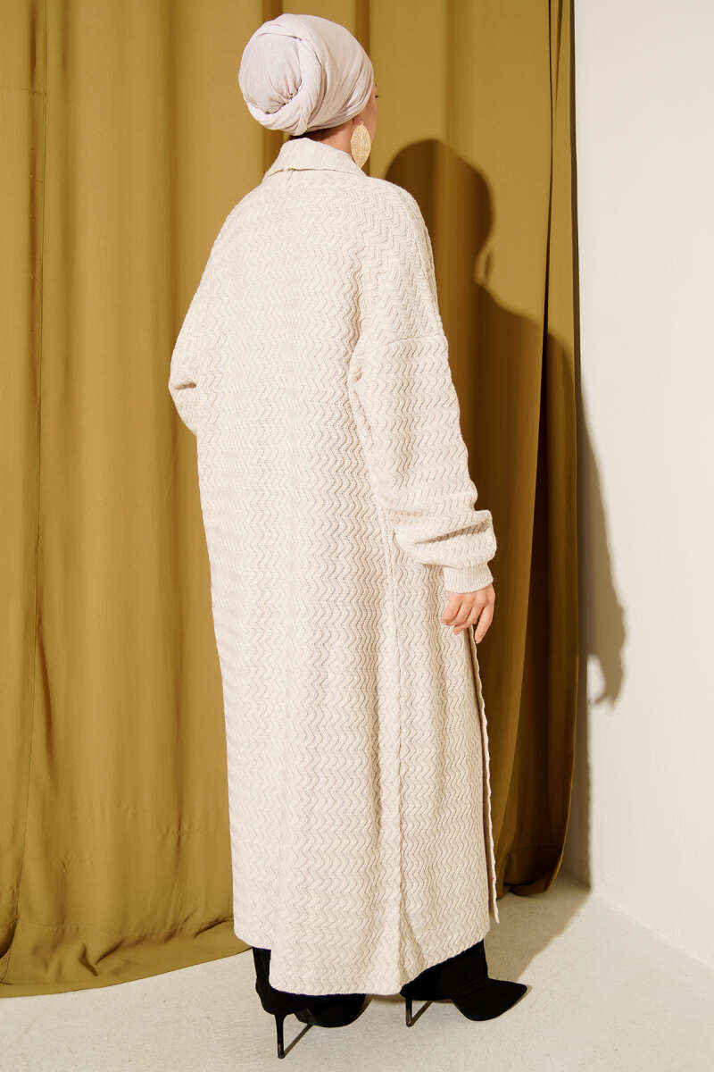 Zigzag Kabartmalı Triko Uzun Hırka ekru