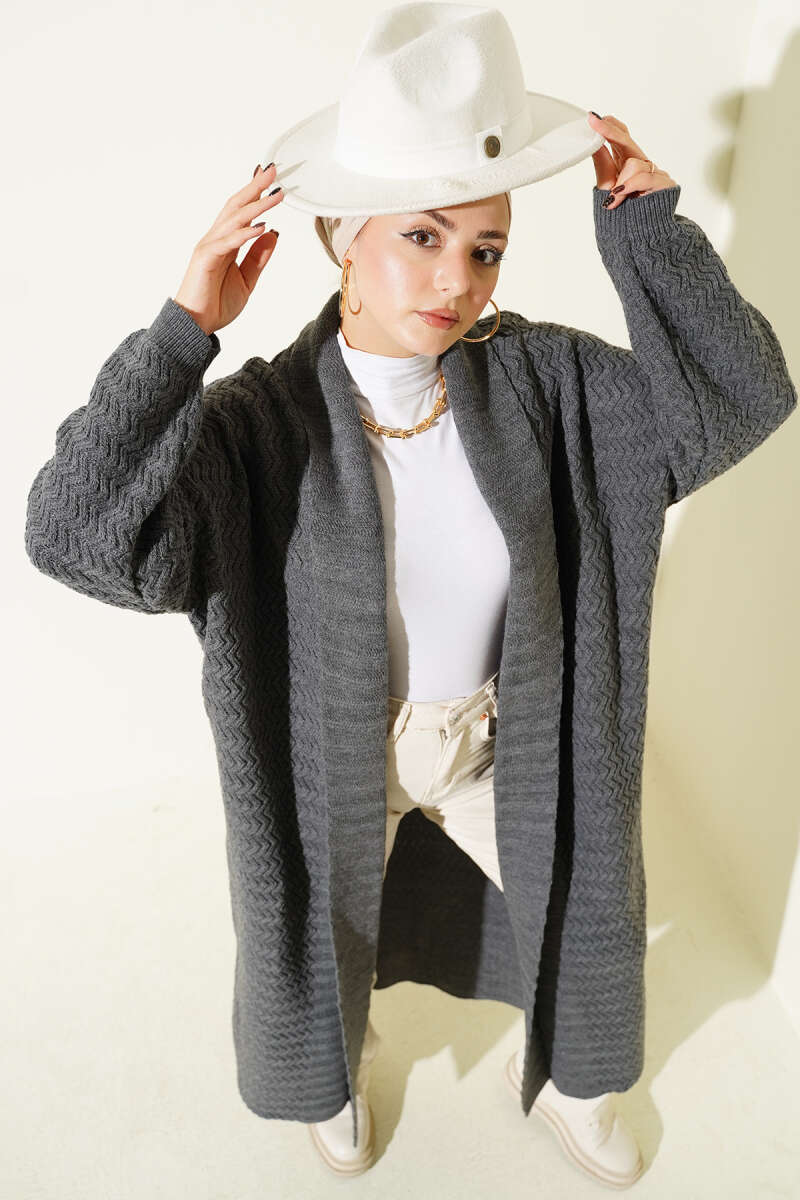 Zigzag Kabartmalı Triko Uzun Hırka gri