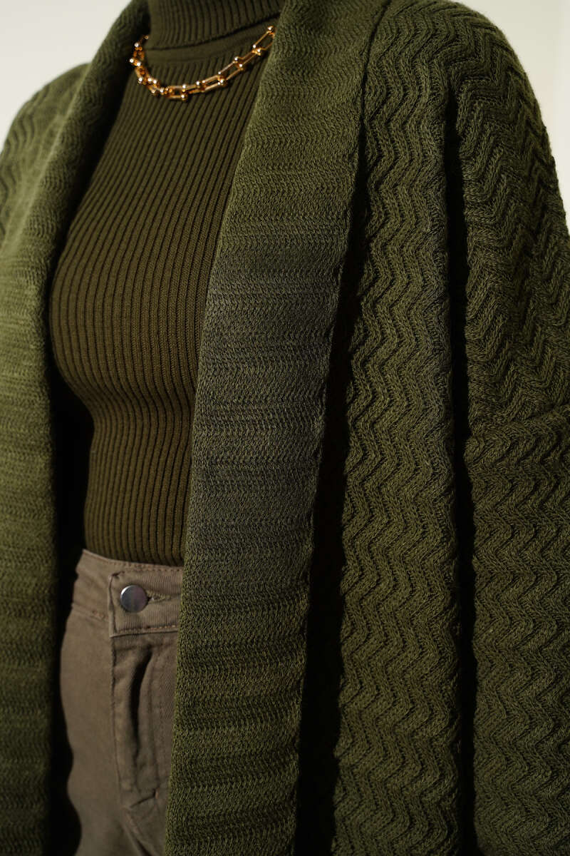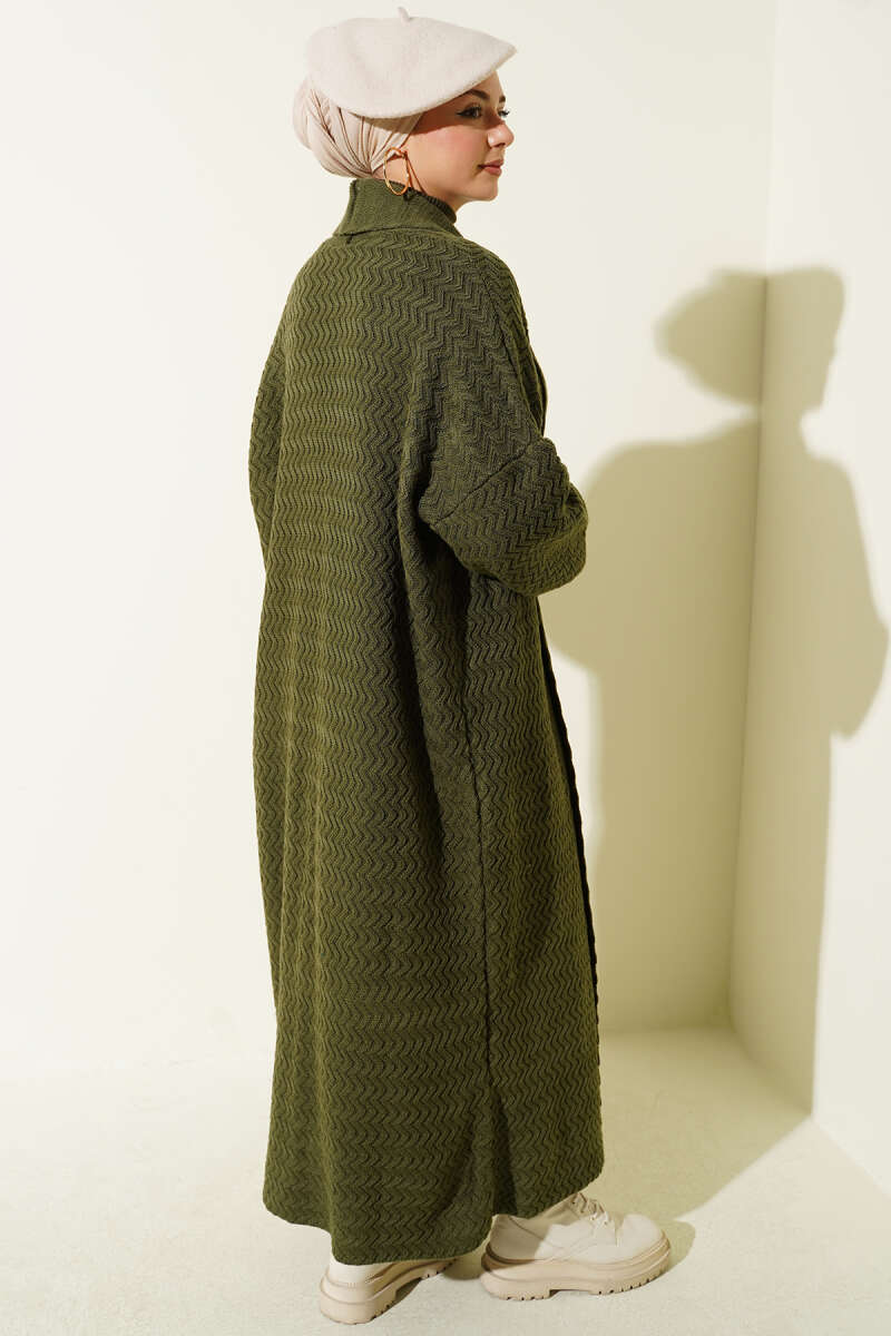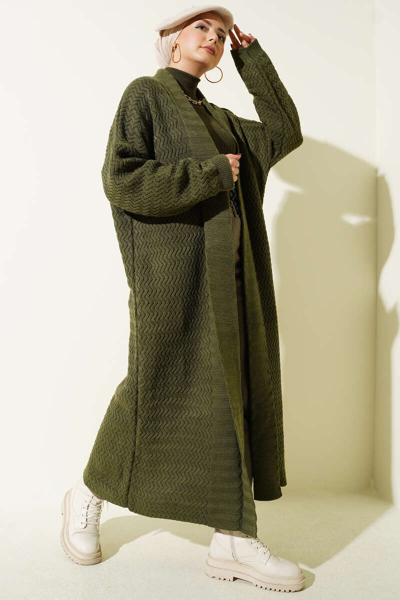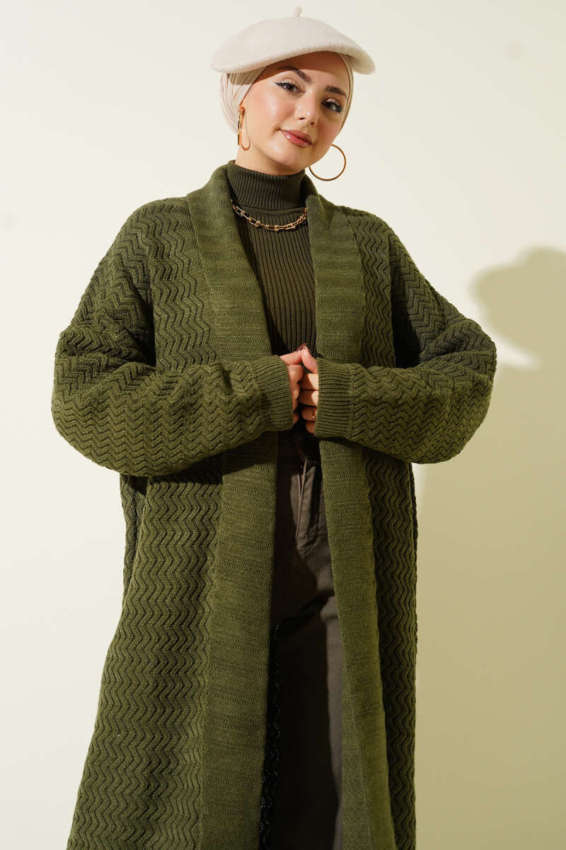Zigzag Kabartmalı Triko Uzun Hırka haki