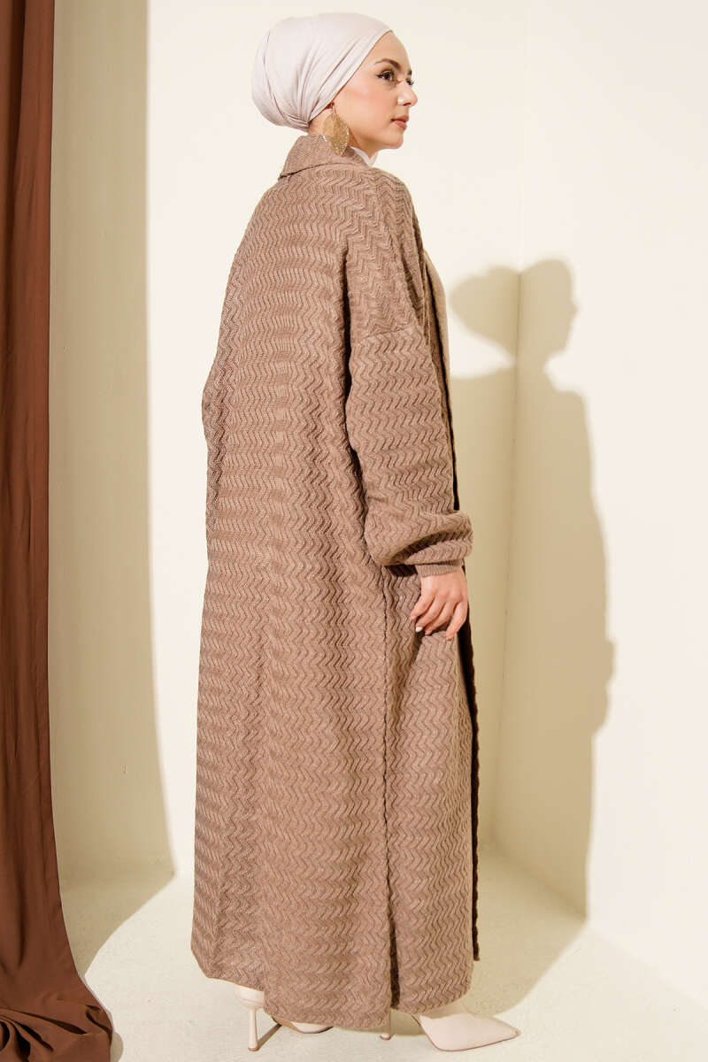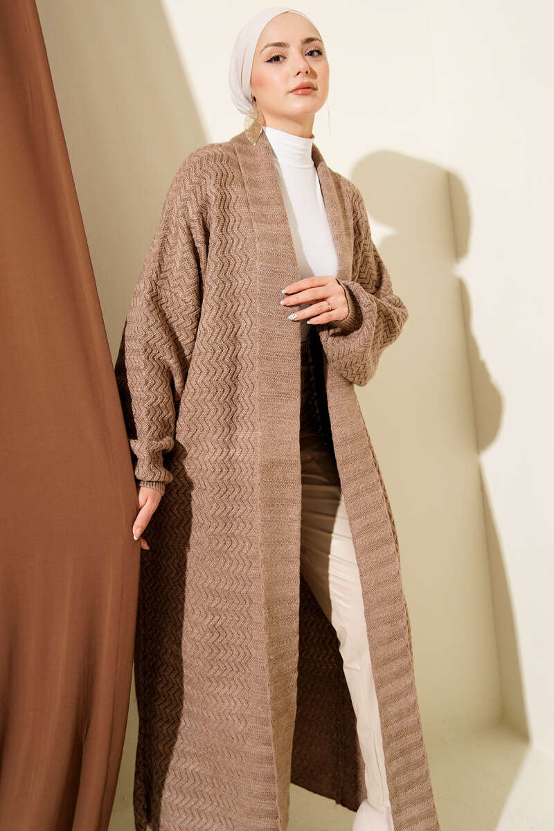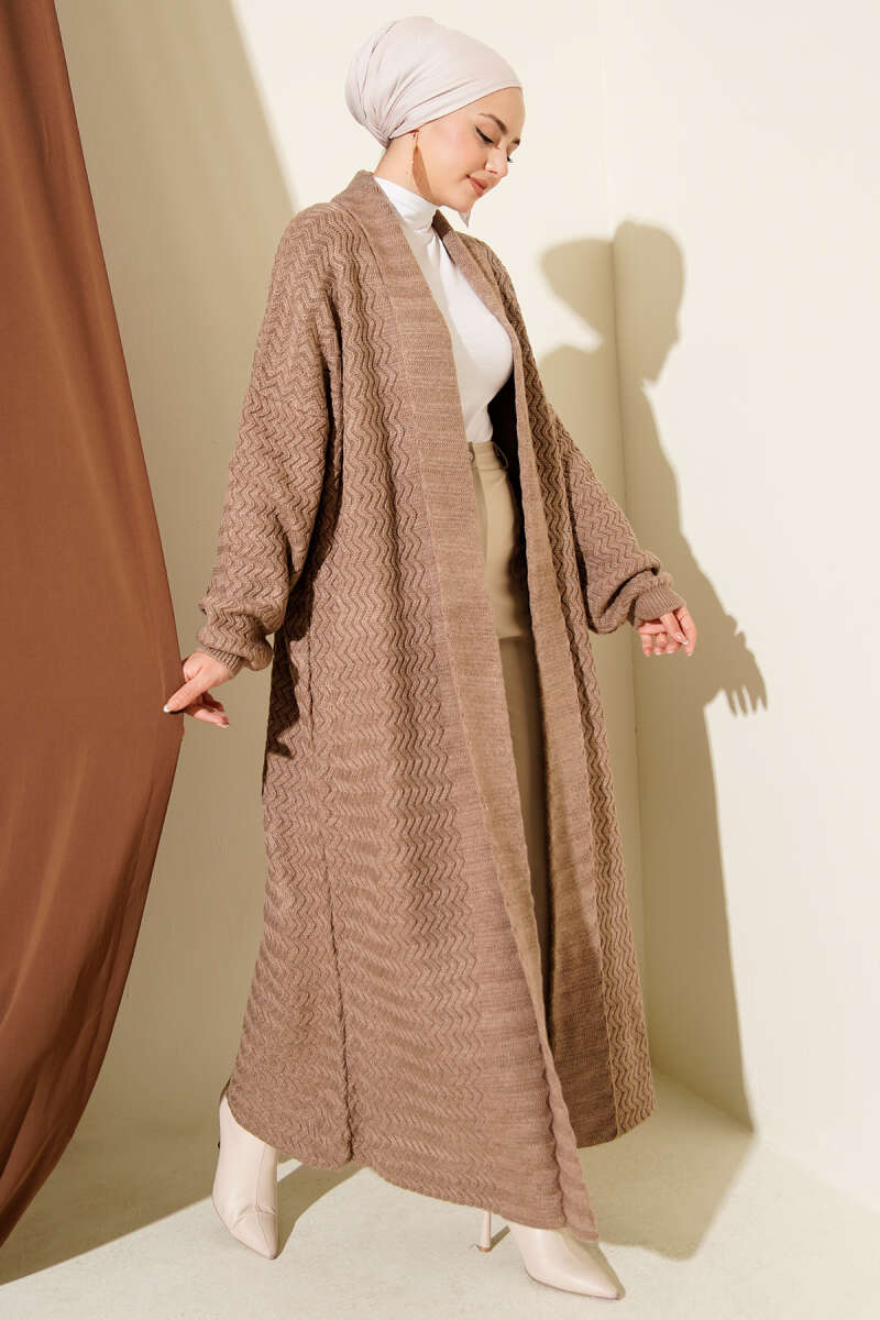 Zigzag Kabartmalı Triko Uzun Hırka vizon