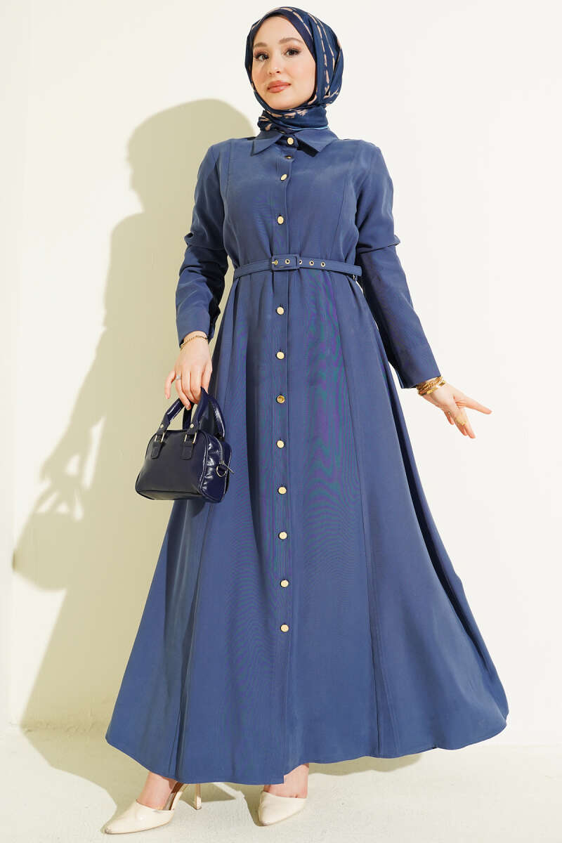 Boydan Düğmeli Kemerli Tensel Elbise mavi