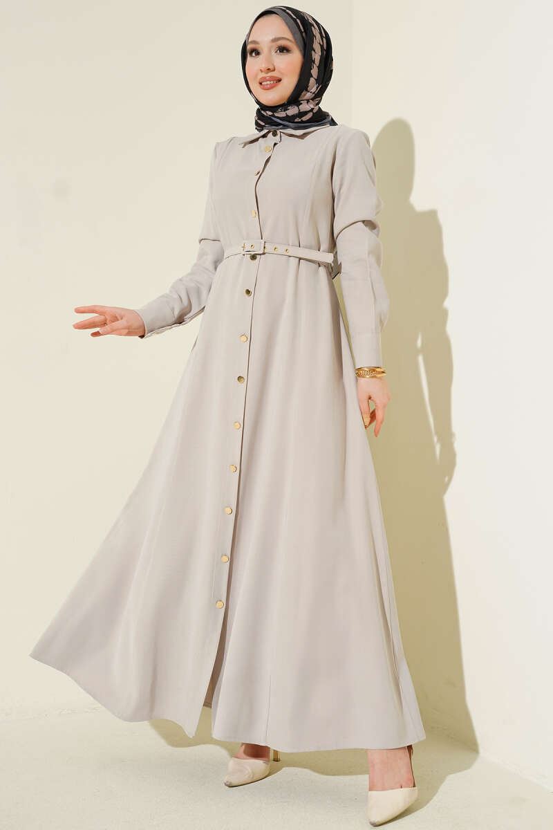 Boydan Düğmeli Kemerli Tensel Elbise taş