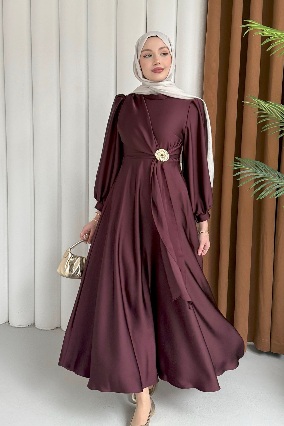 Broş Detaylı Premium Kumaş Saten Tesettür Abiye-bordo