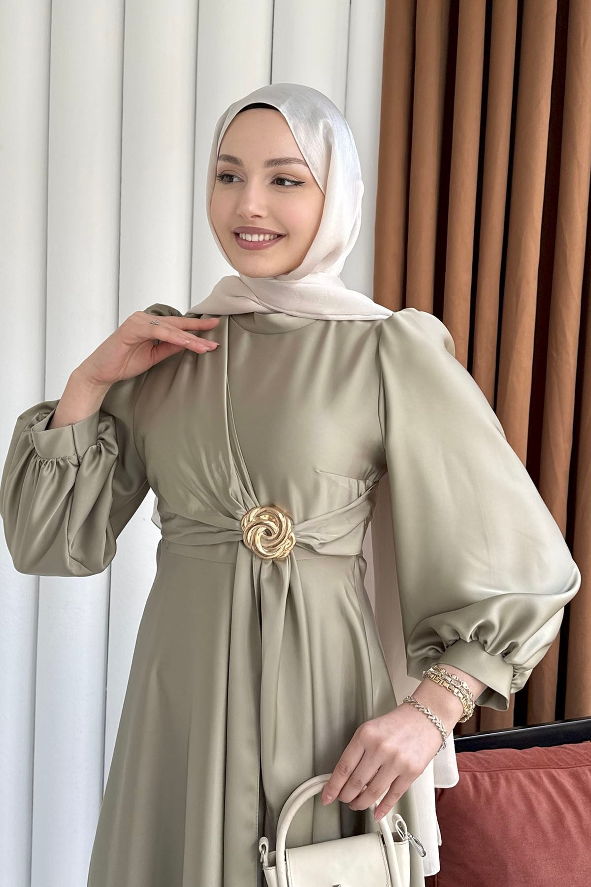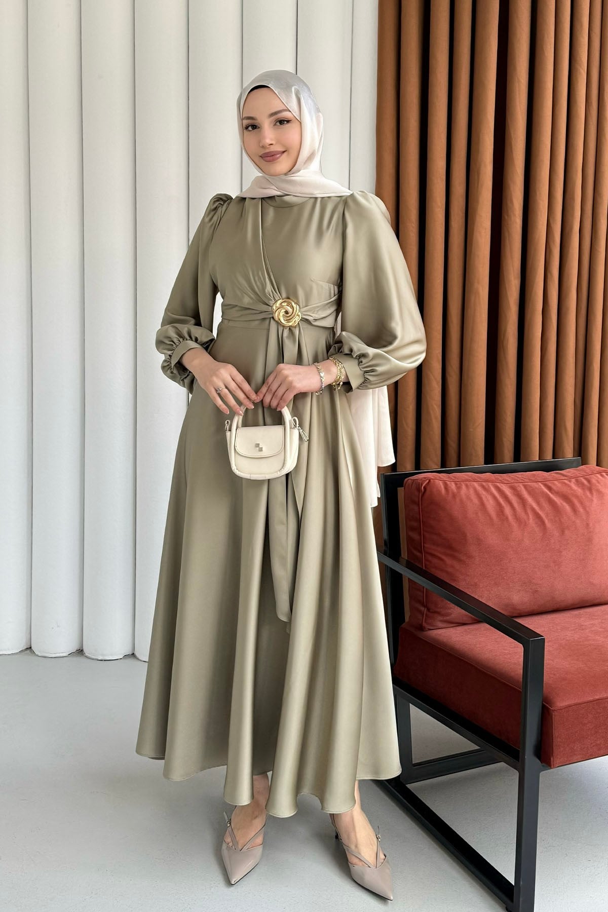 Broş Detaylı Premium Kumaş Saten Tesettür Abiye- haki