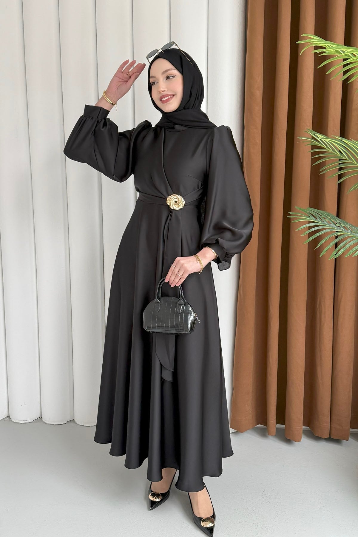 Broş Detaylı Premium Kumaş Saten Tesettür Abiye-siyah