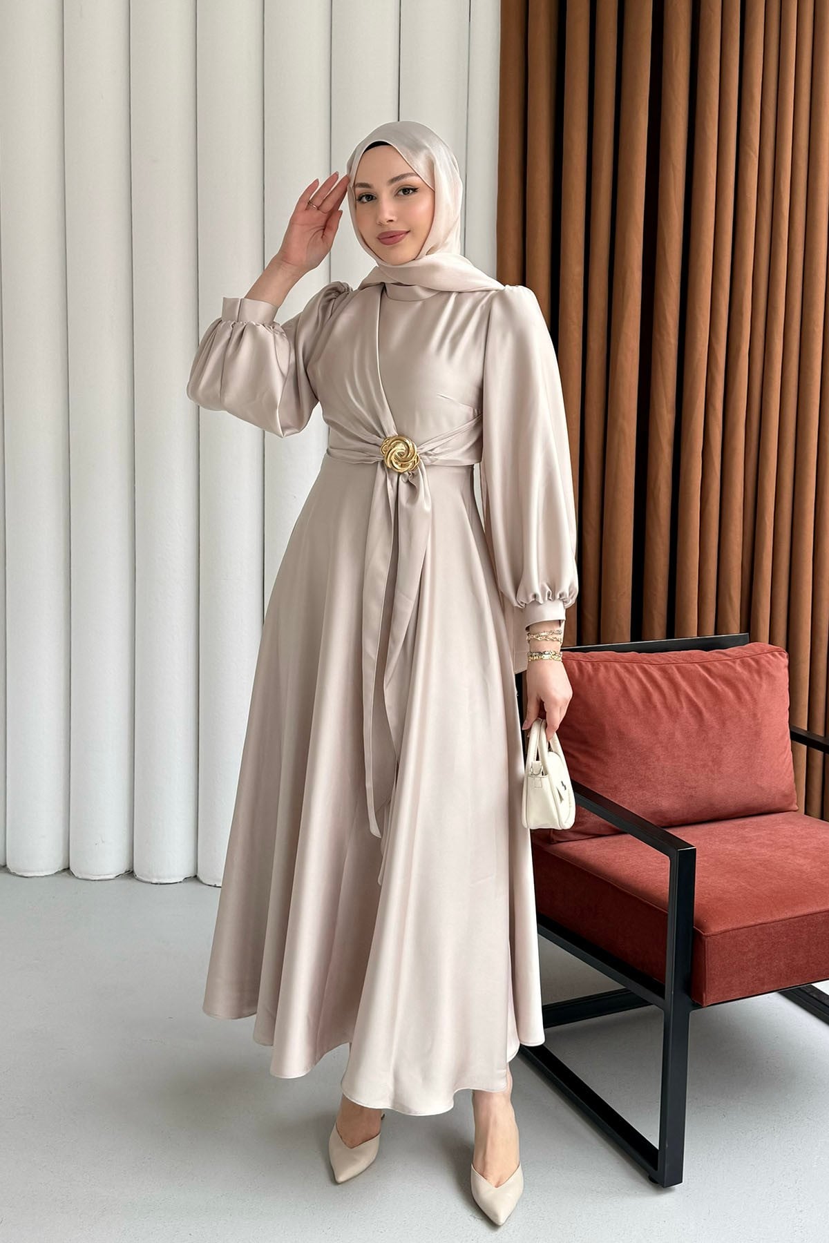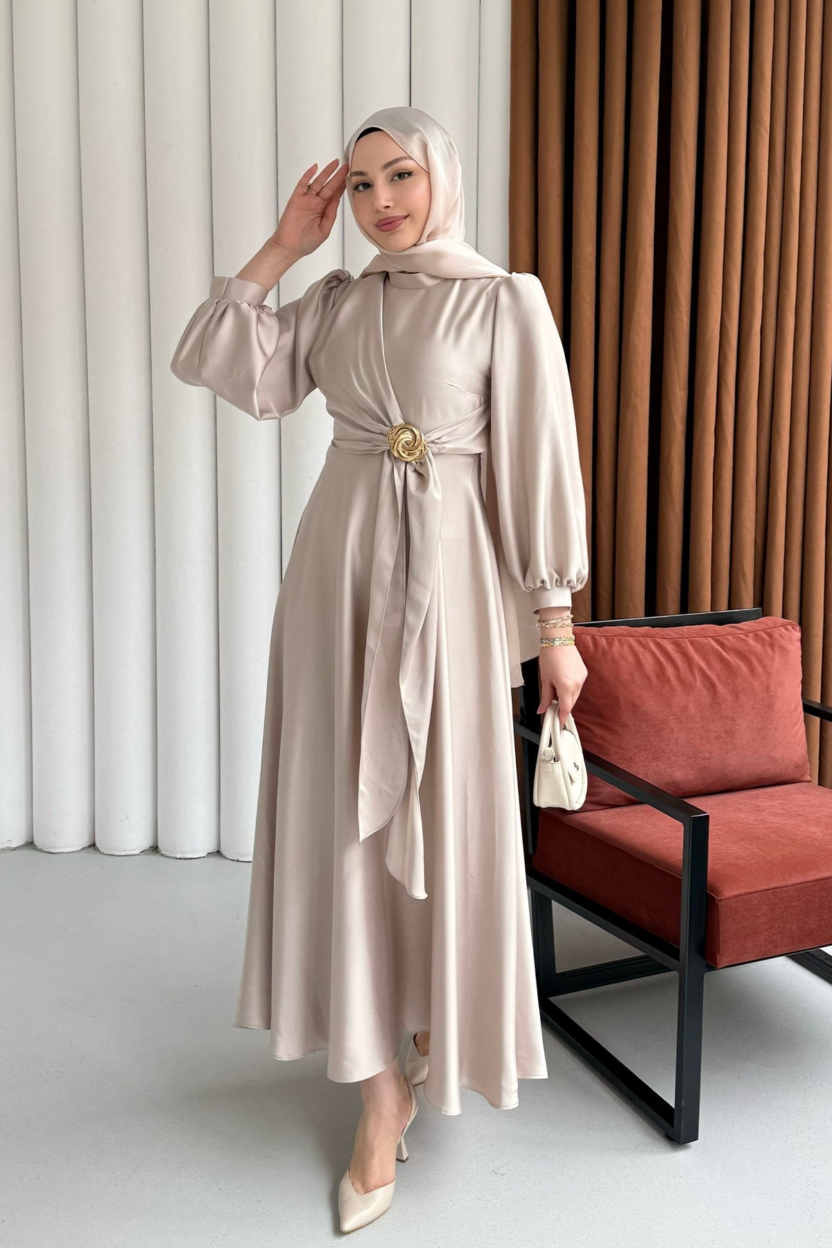 Broş Detaylı Premium Kumaş Saten Tesettür Abiye-taş