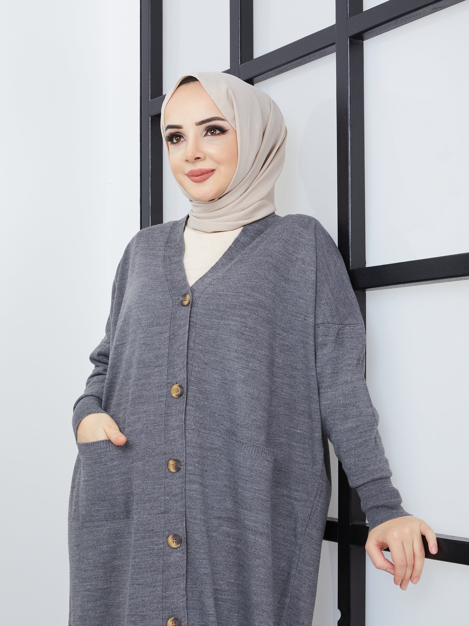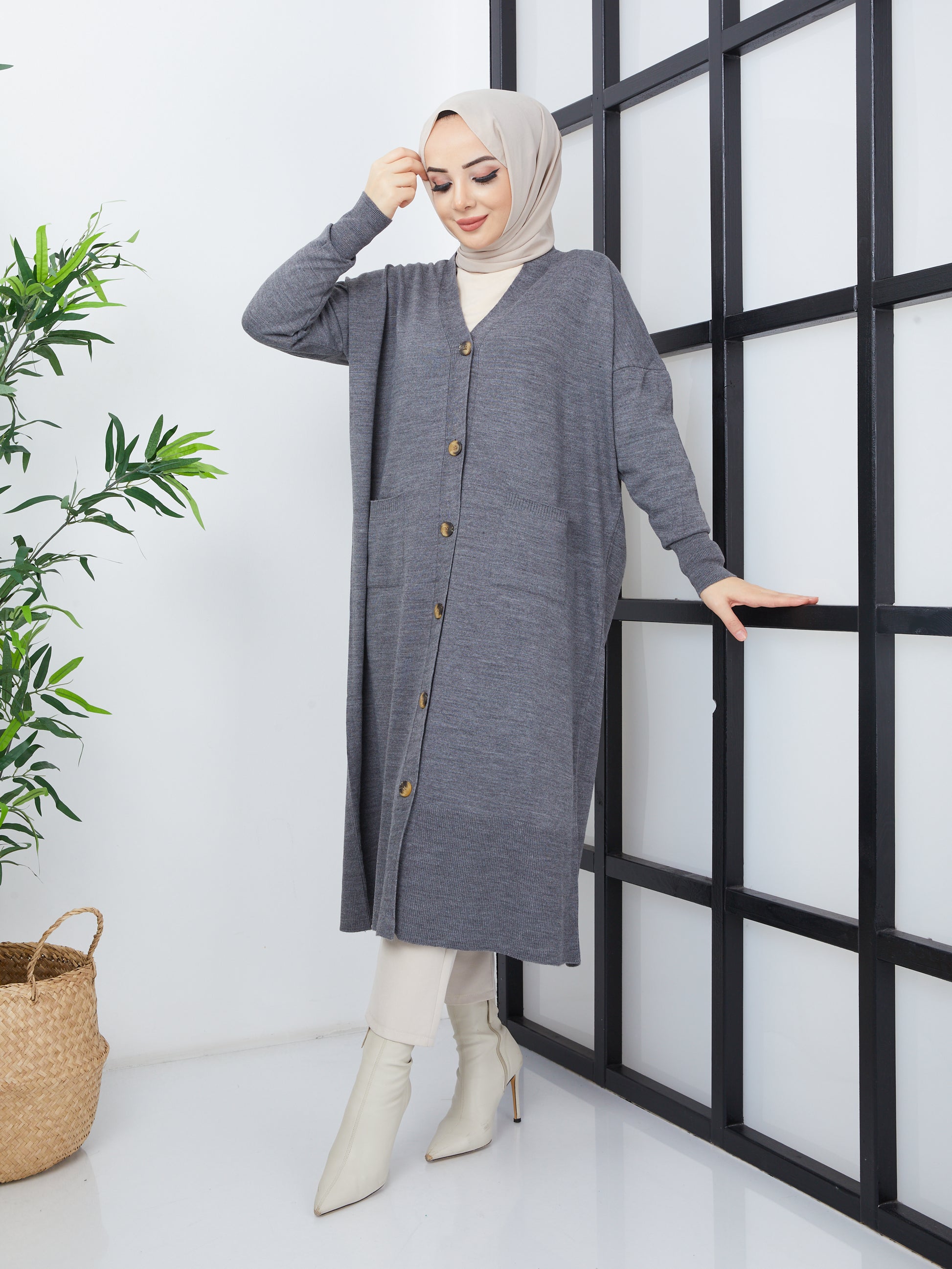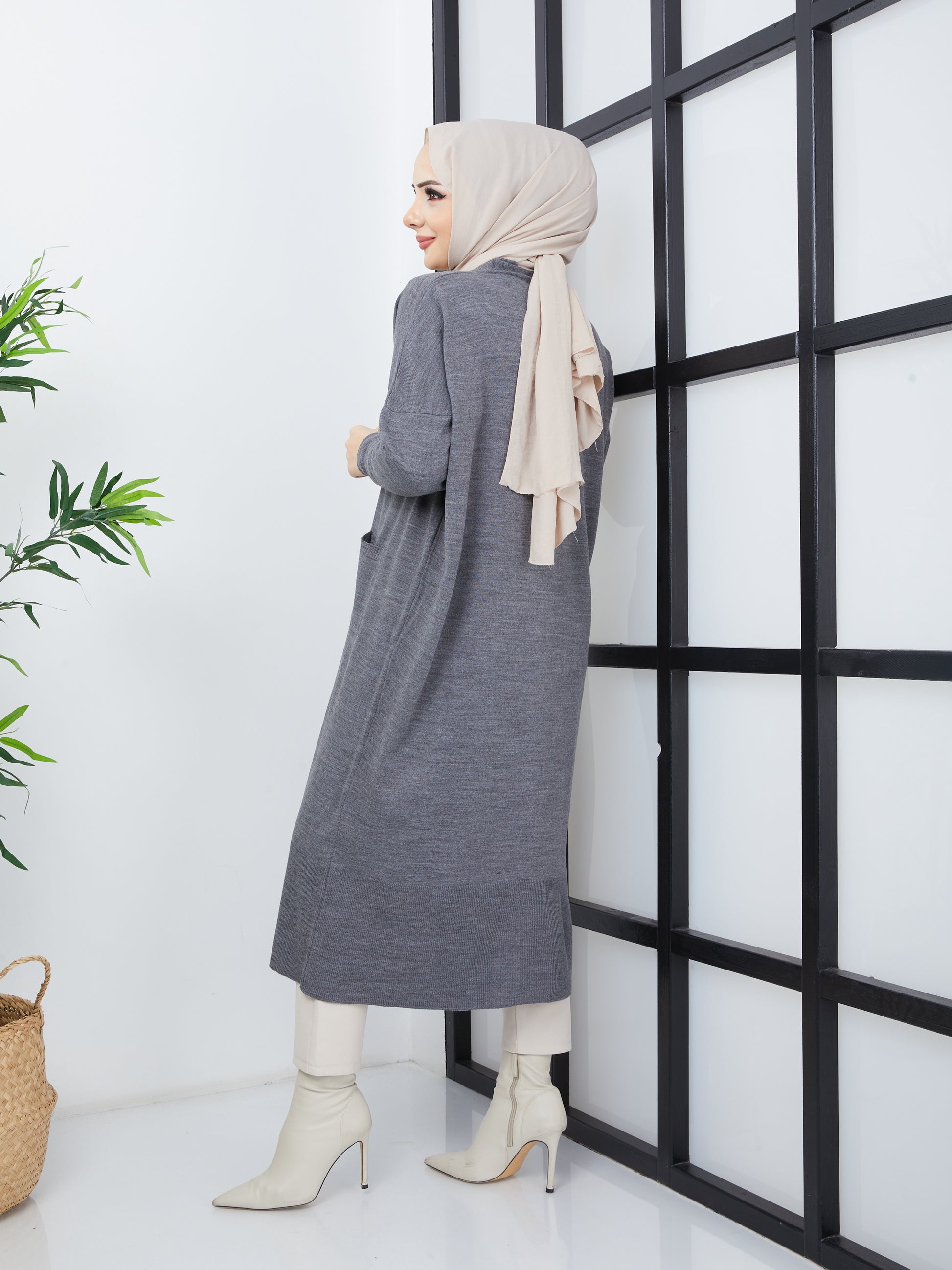 Cepli Uzun Tesettür Triko Hırka - Gri