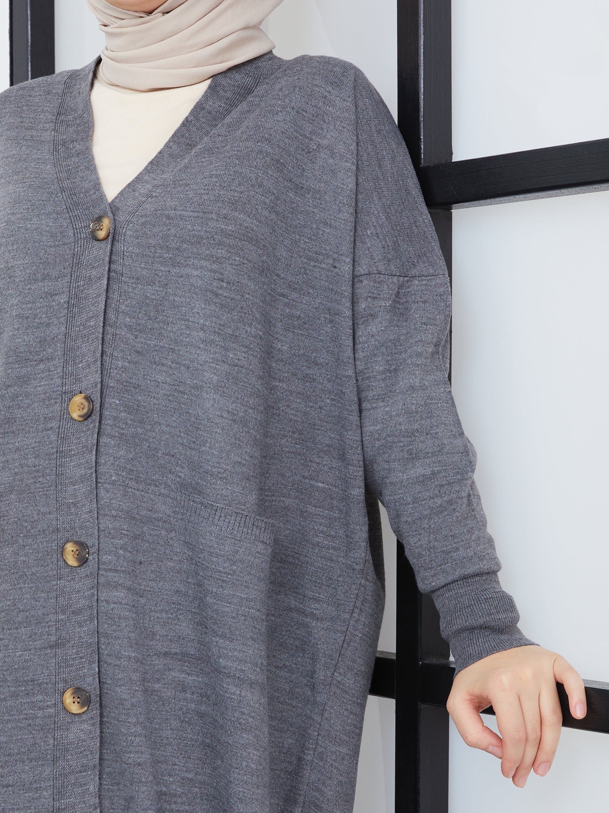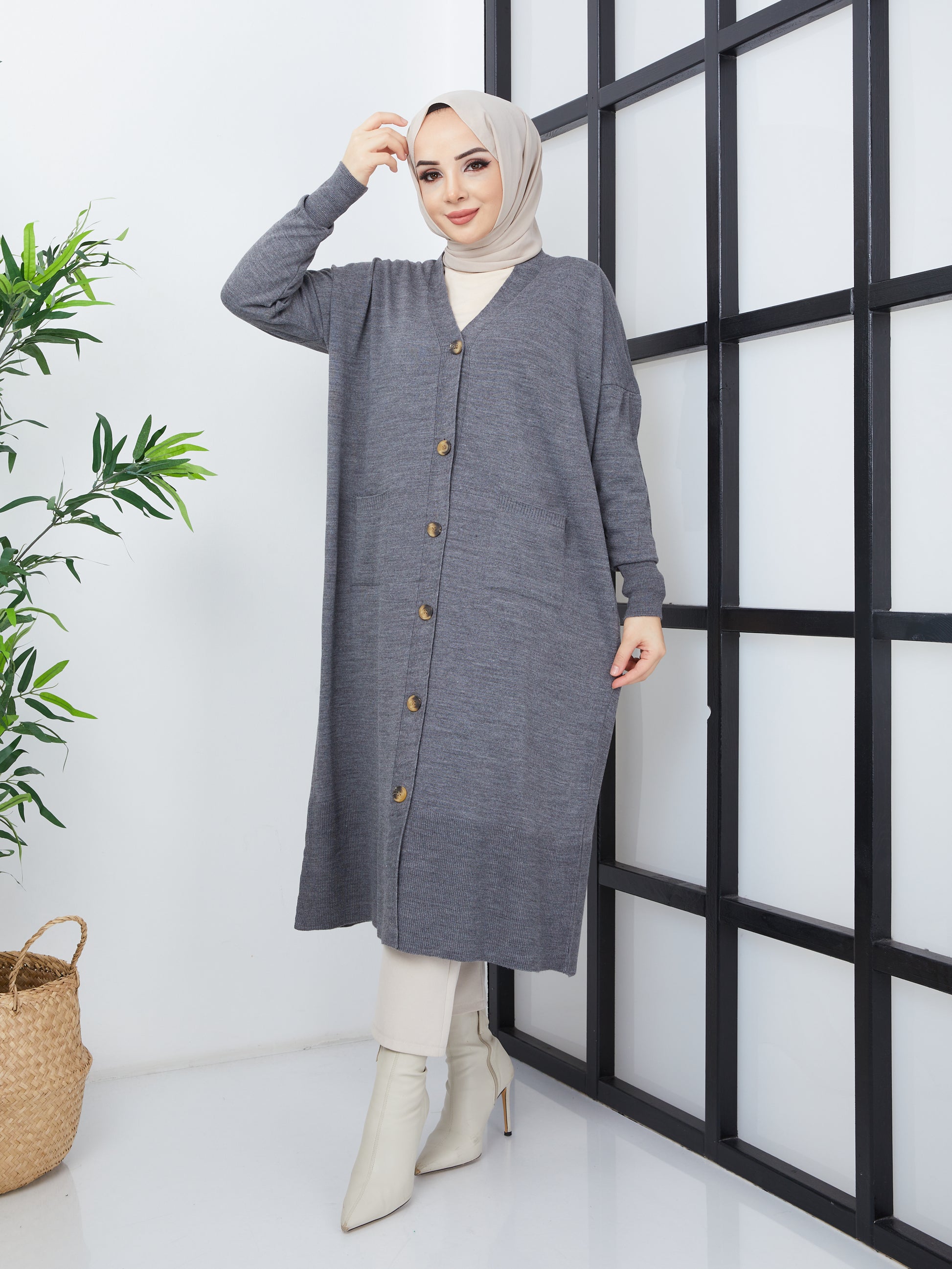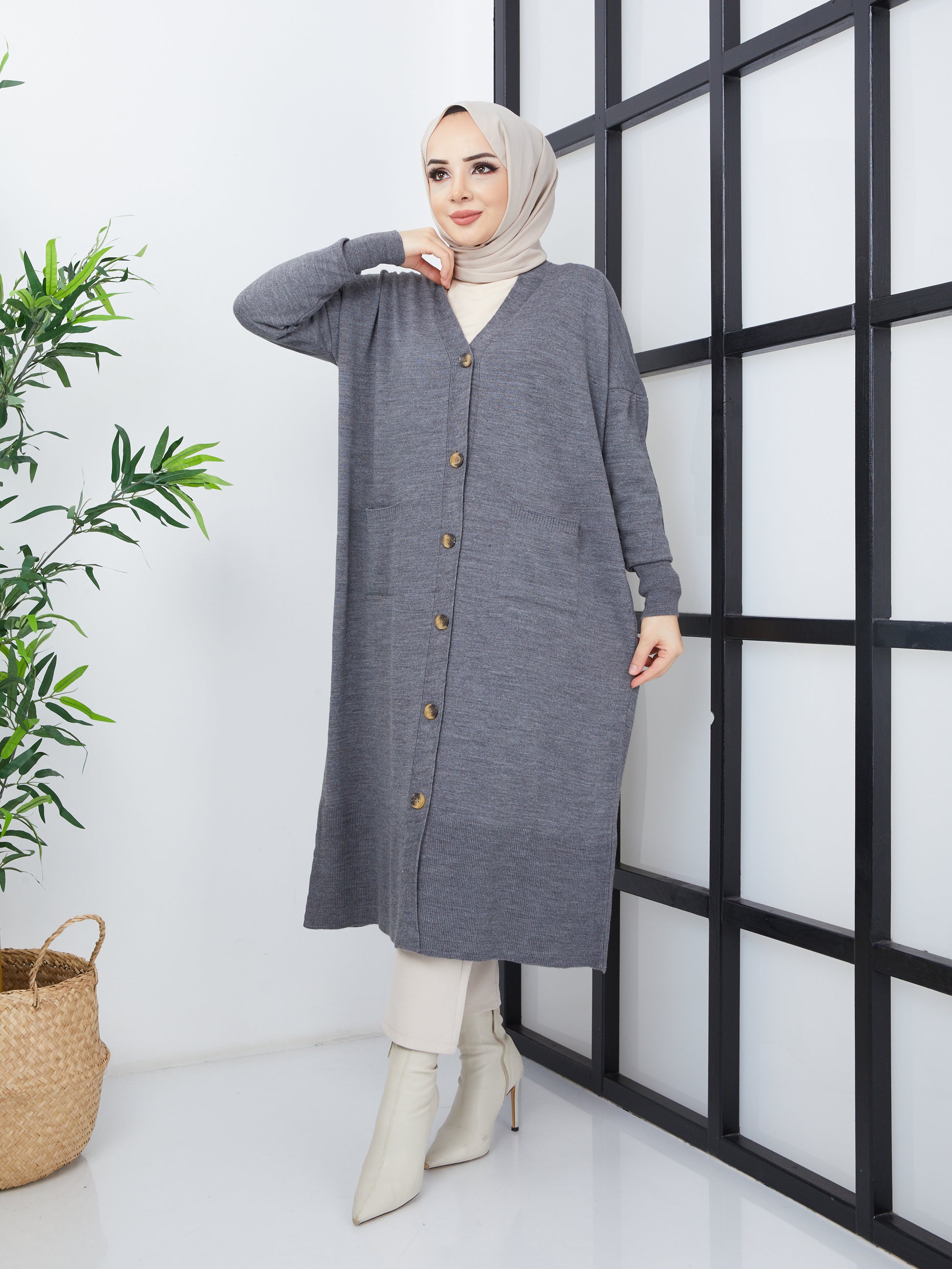 Cepli Uzun Tesettür Triko Hırka - Gri