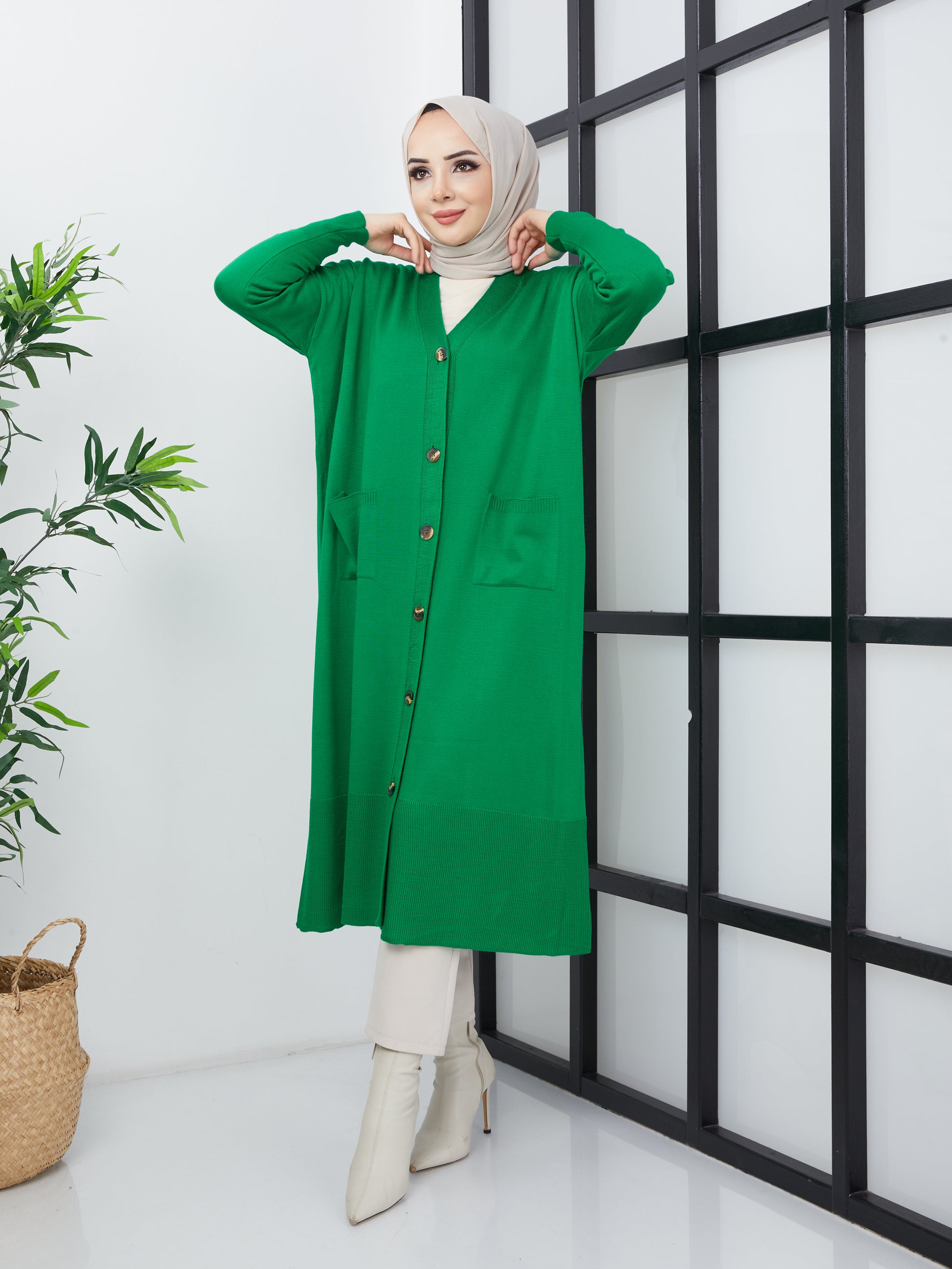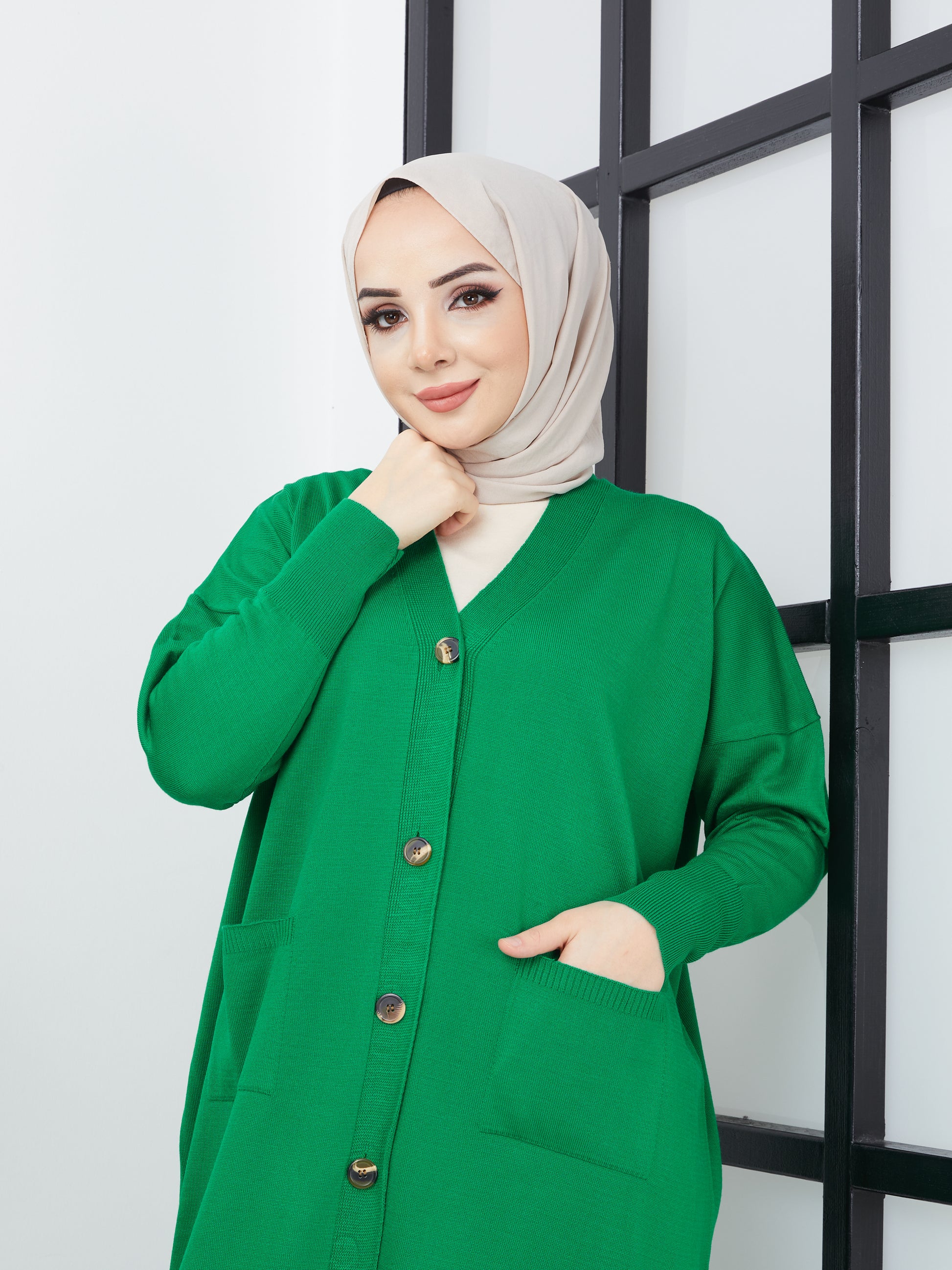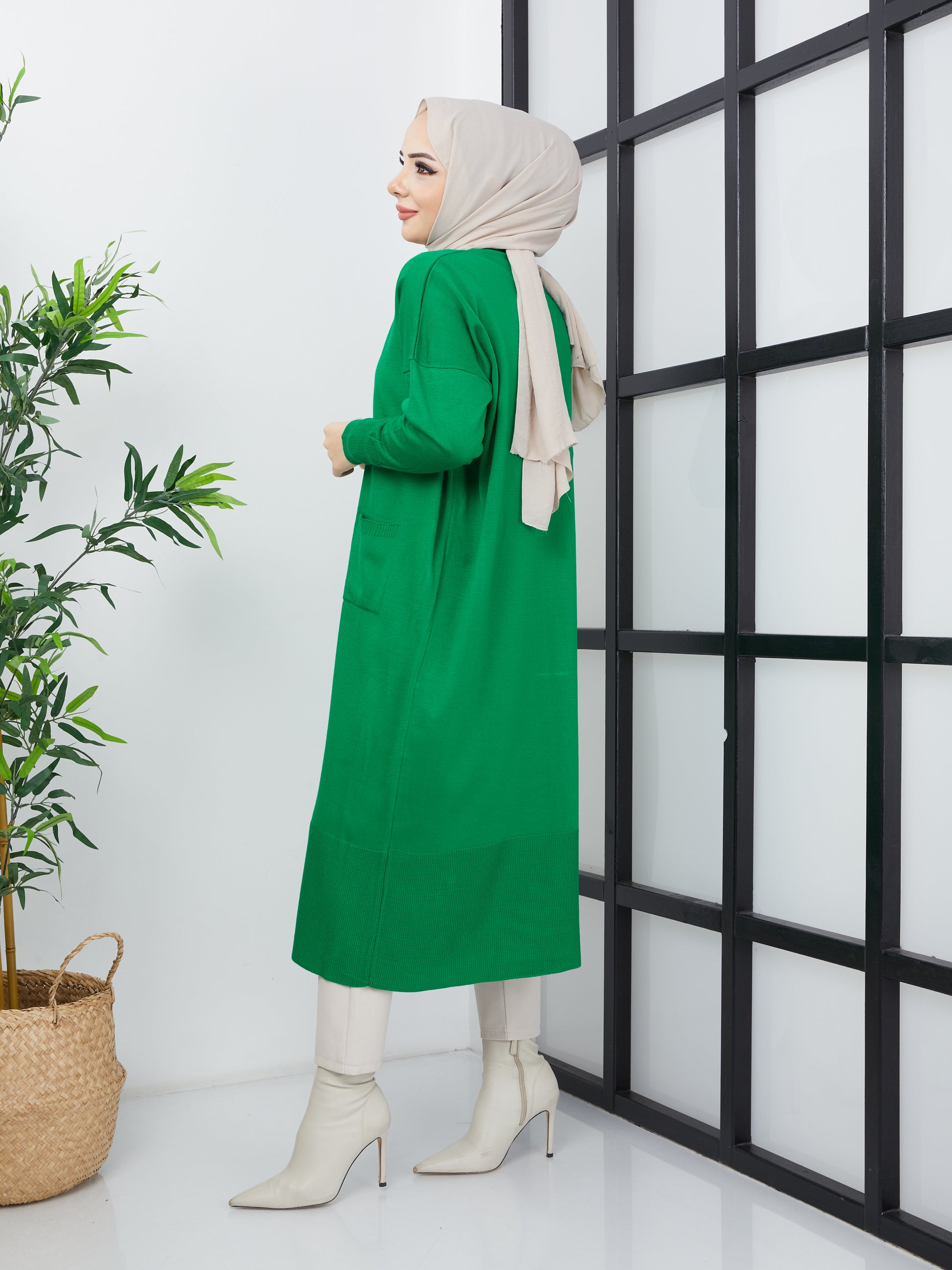 Cepli Uzun Tesettür Triko Hırka - Yeşil