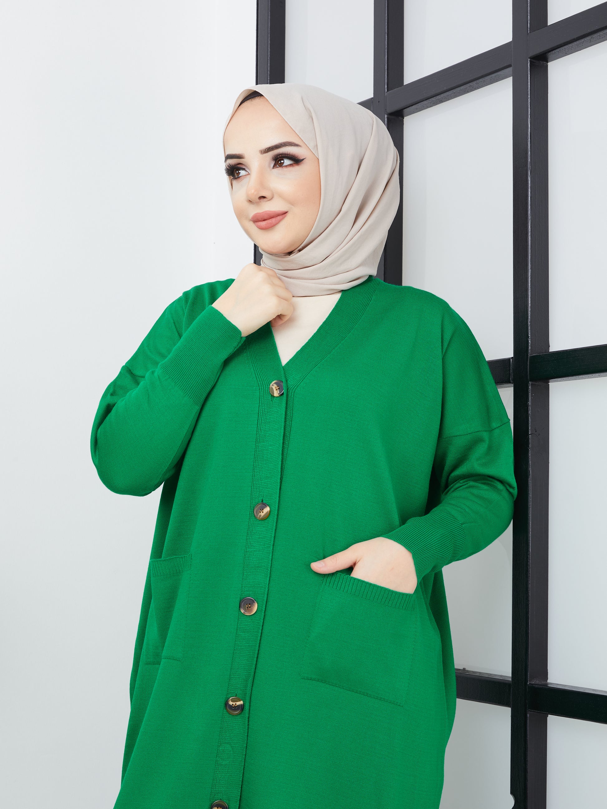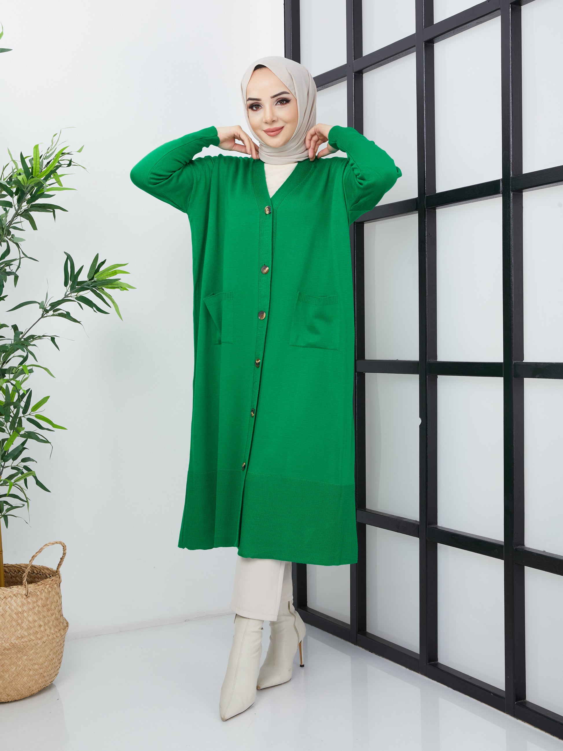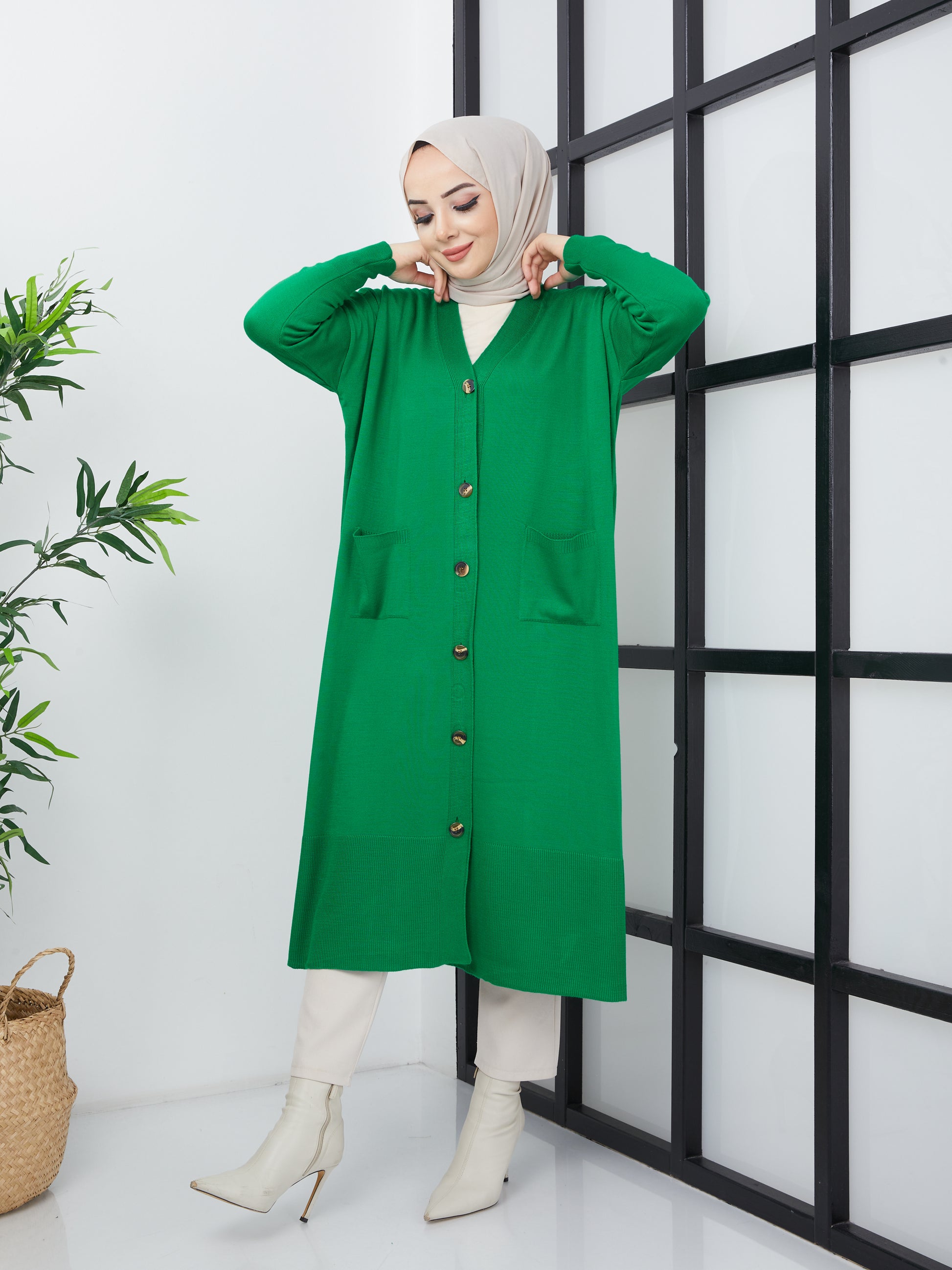 Cepli Uzun Tesettür Triko Hırka - Yeşil