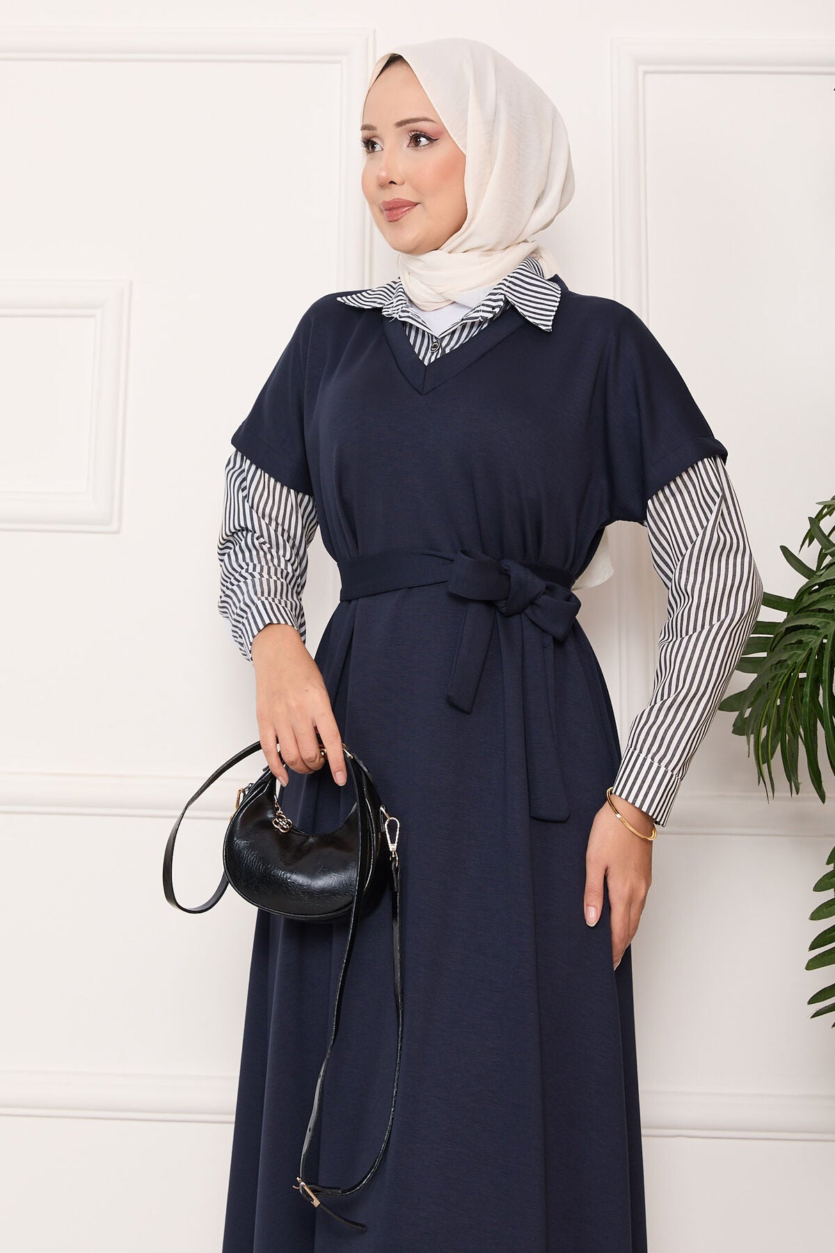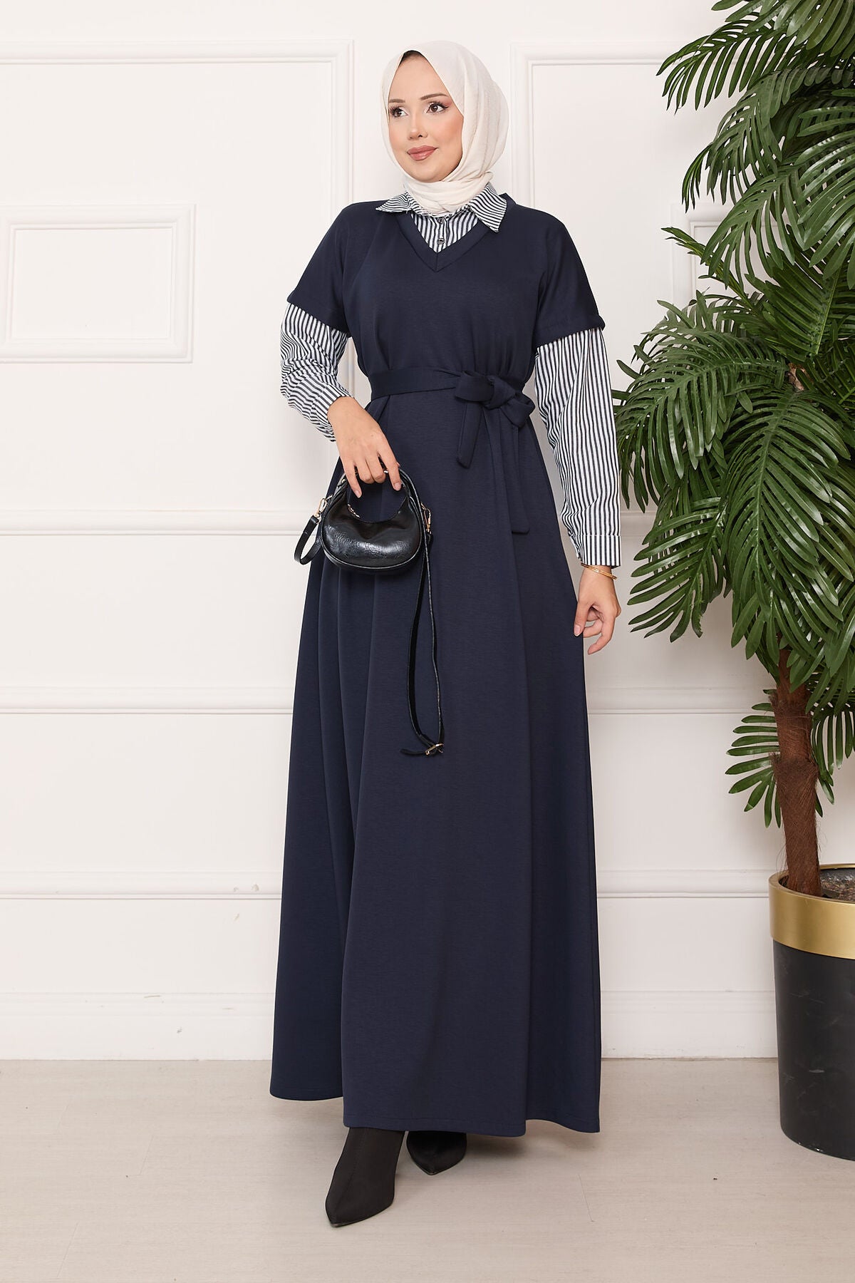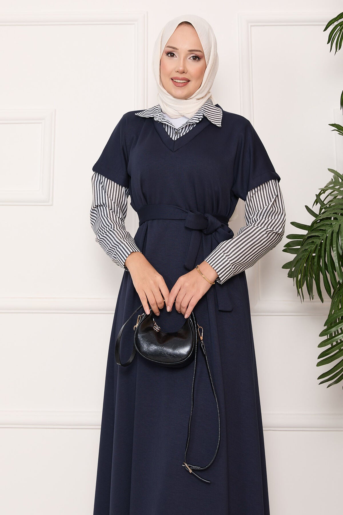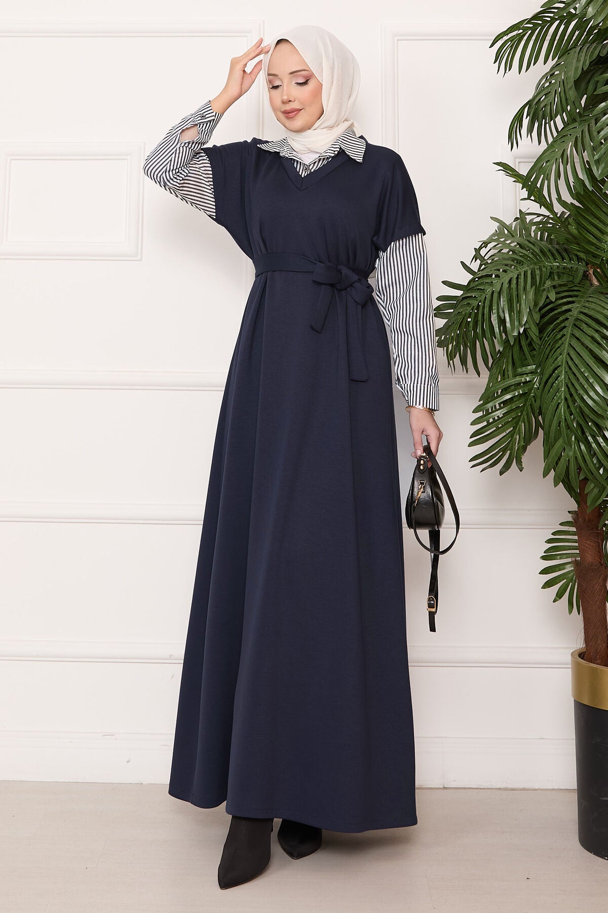 Ürün mevsimliktir. Kolu ve yakası çizgili seyyar kuşaklı tessettür elbise.Kol manşetlerinde düğme detayı vardır.