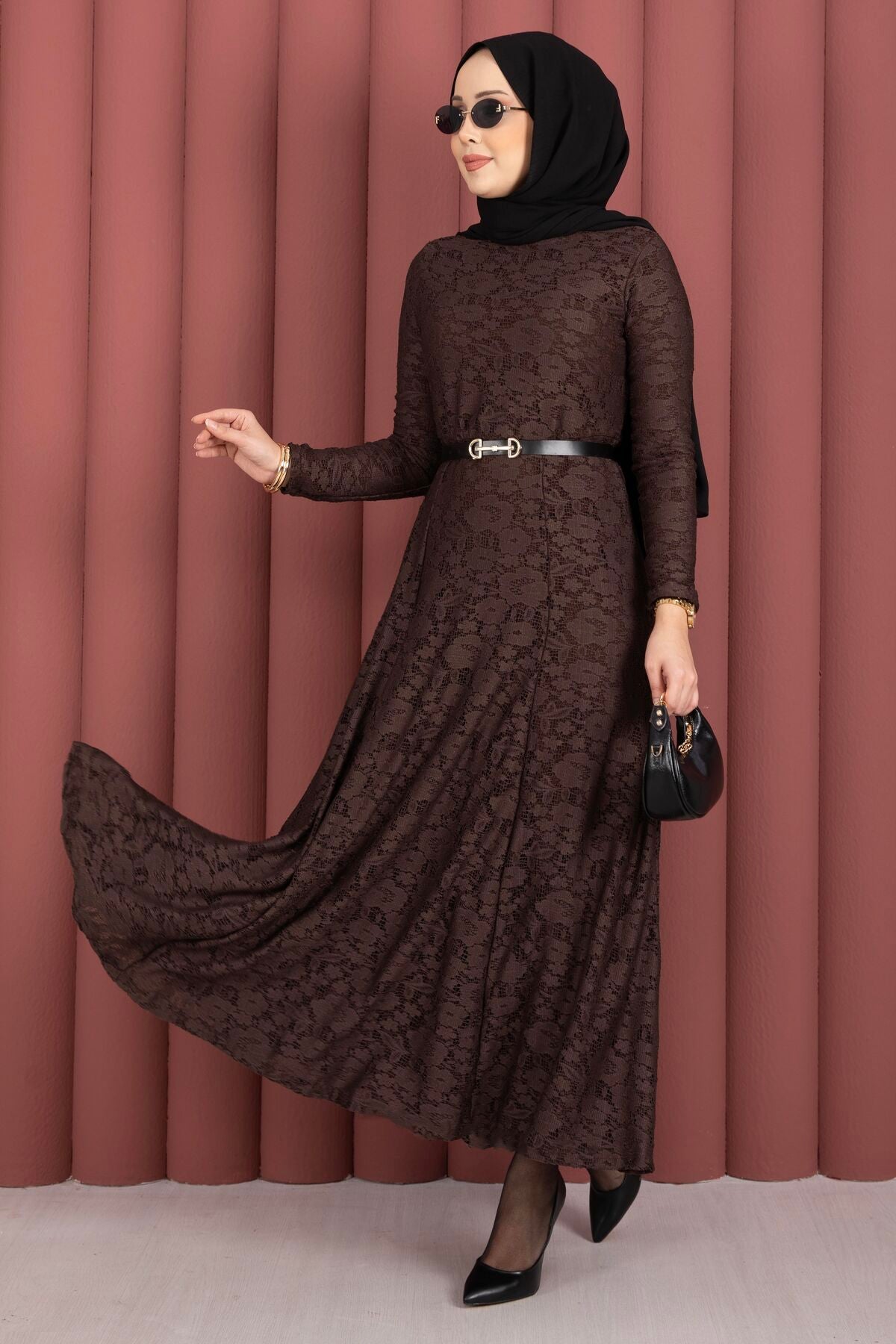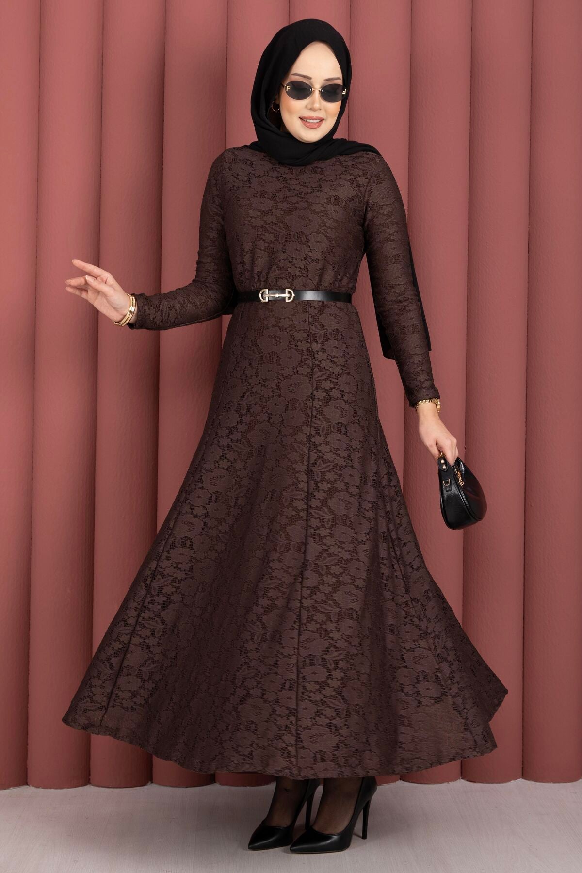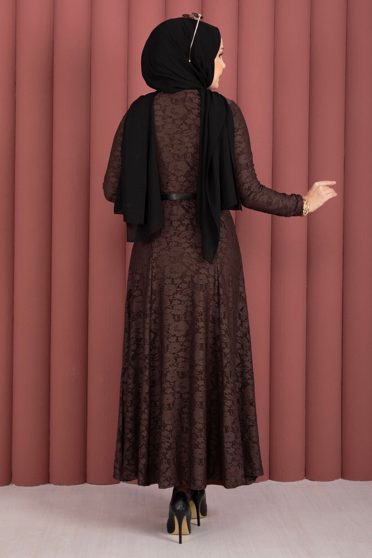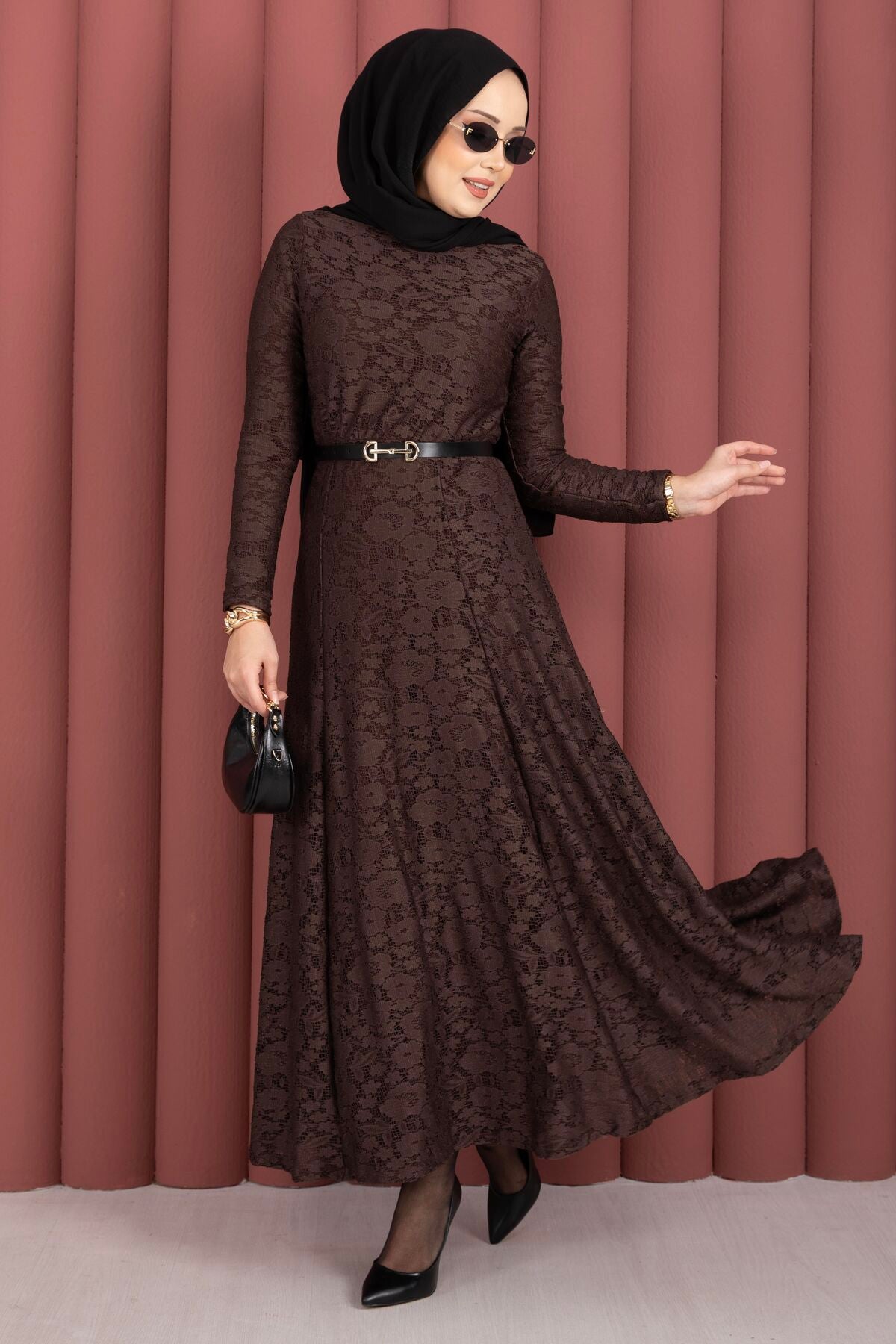 Dantel Detaylı Kemerli Tesettür Elbise kahverengi