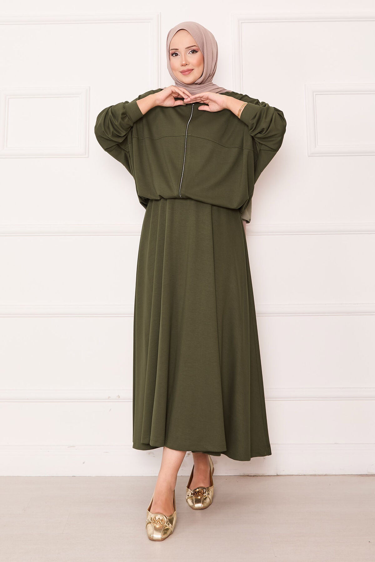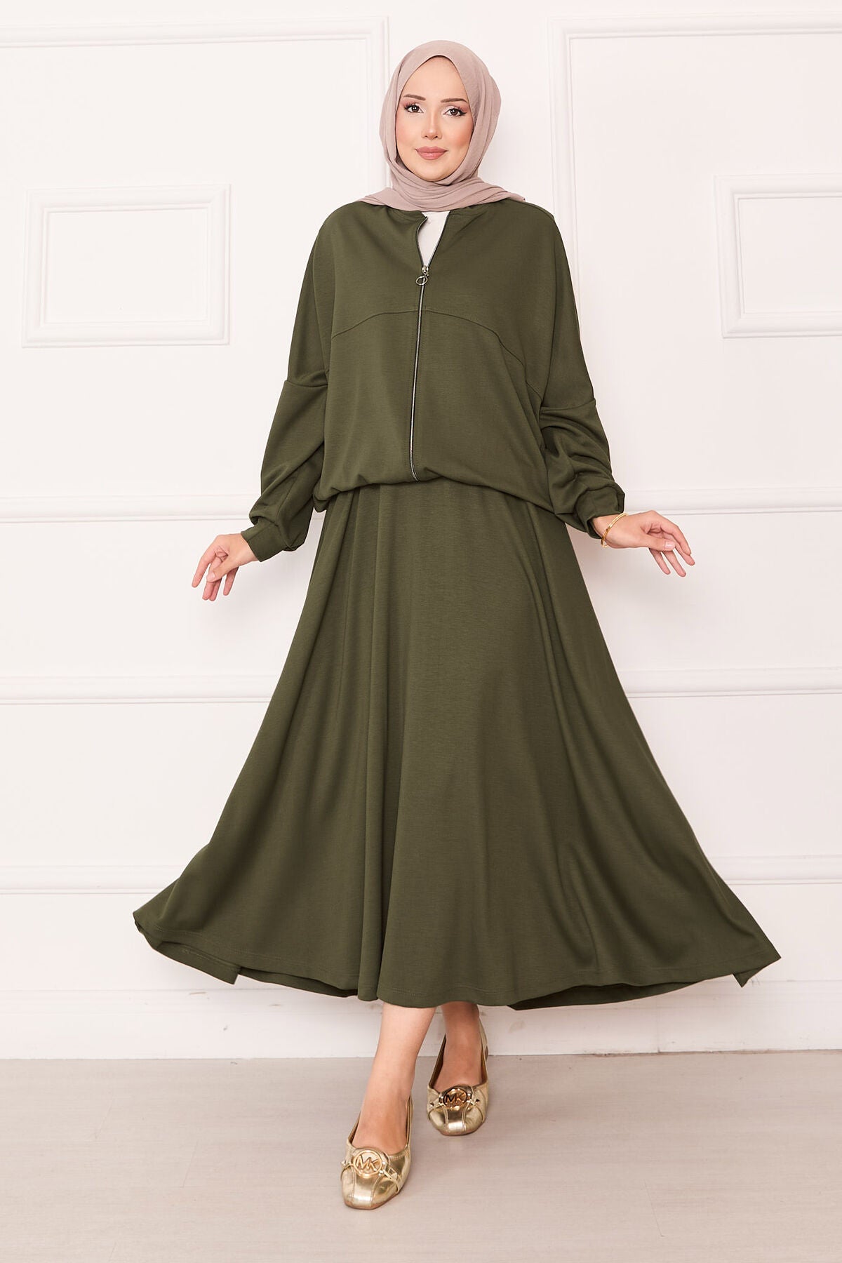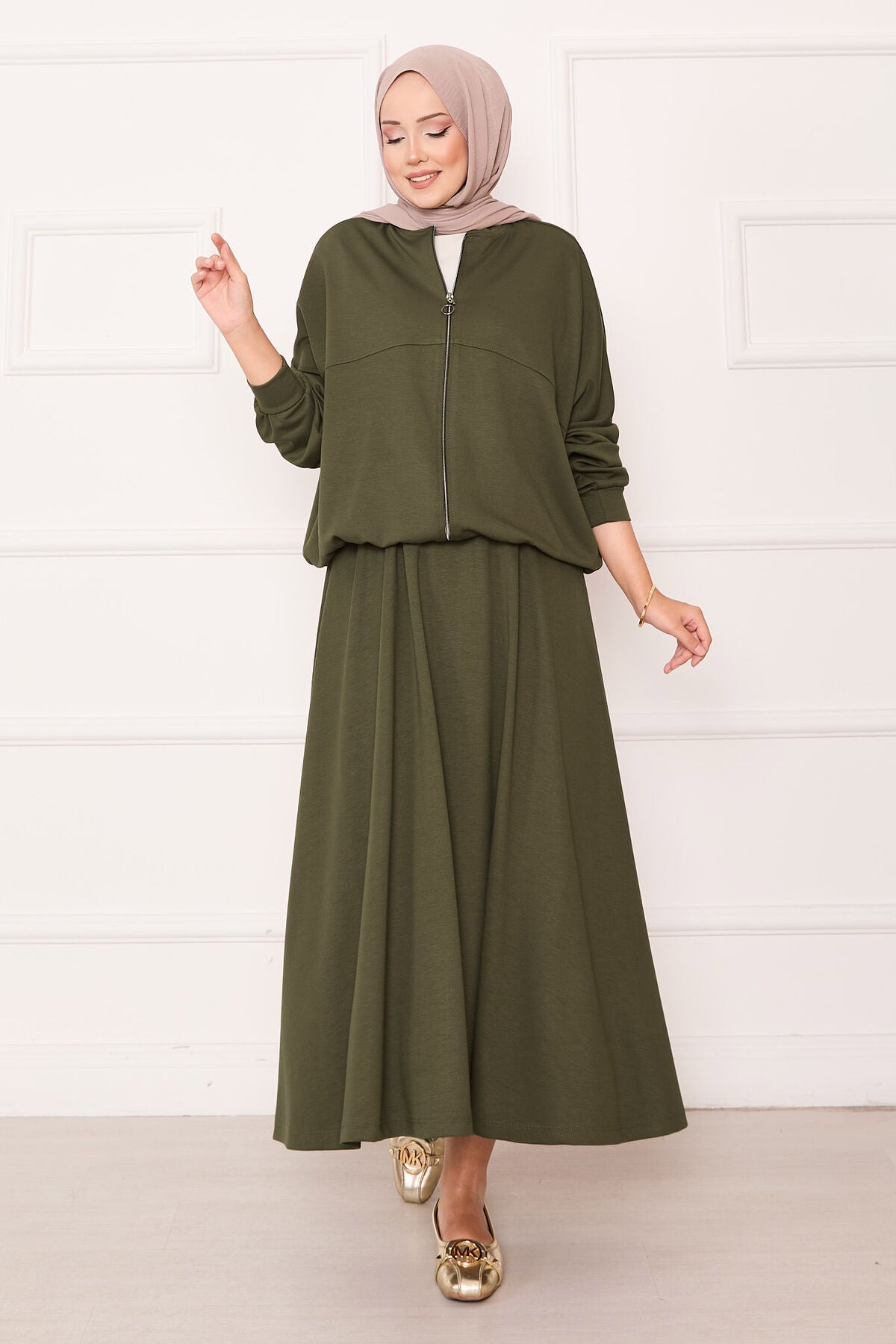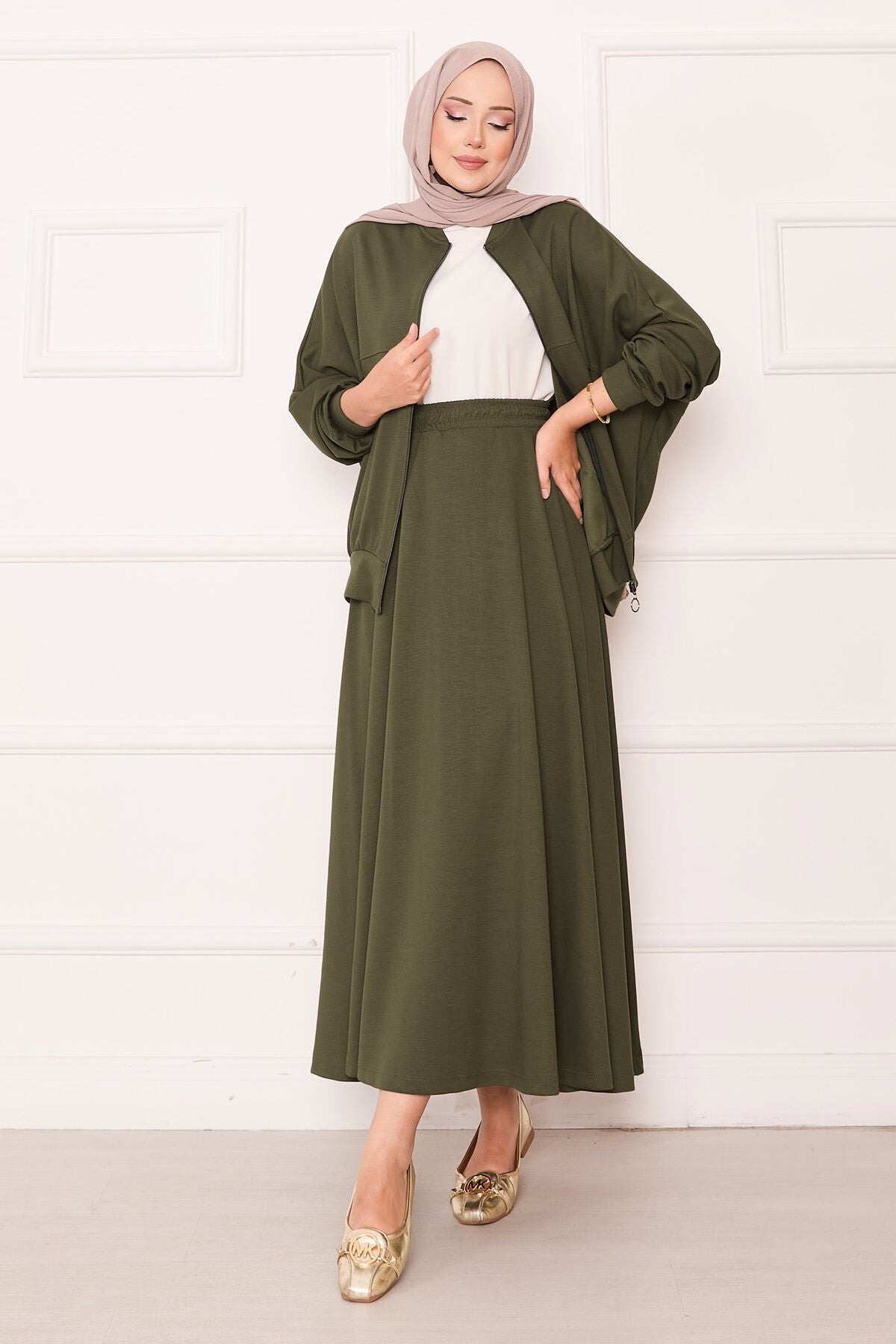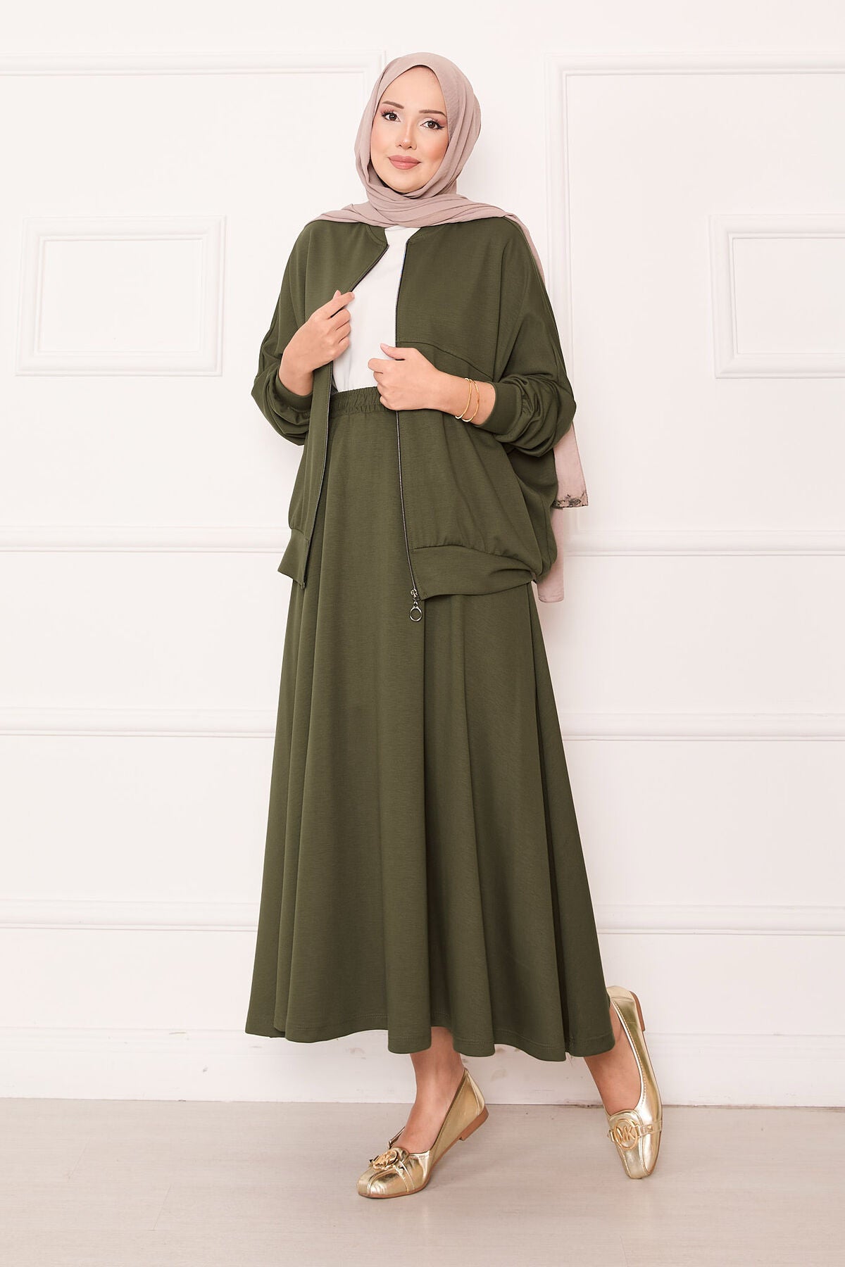 Ürün mevsimliktir. Yeni sezon bomber ceketli ve etekli ikili takım. Bomber ceket boydan fermuarlı salaş ve yarasa kol etek belden lastikli.
