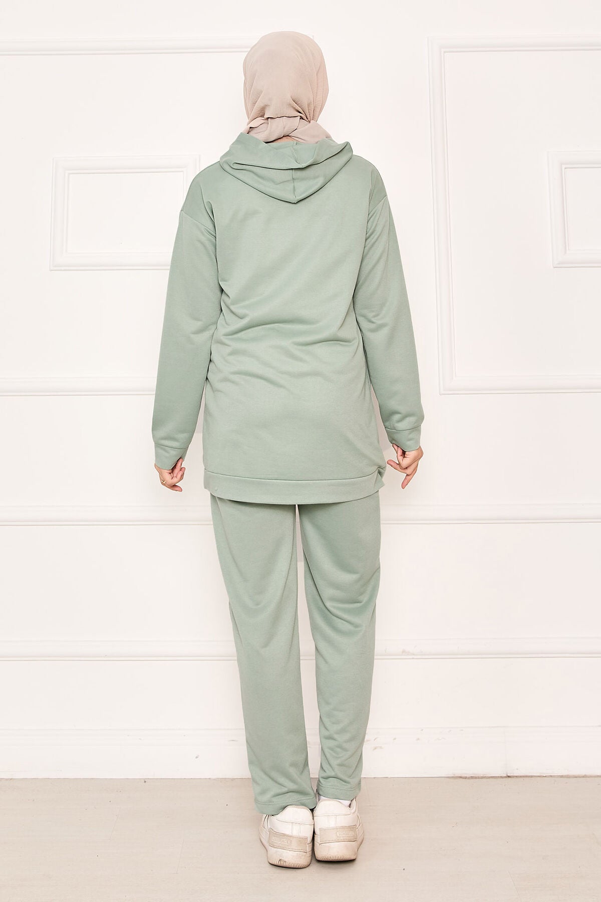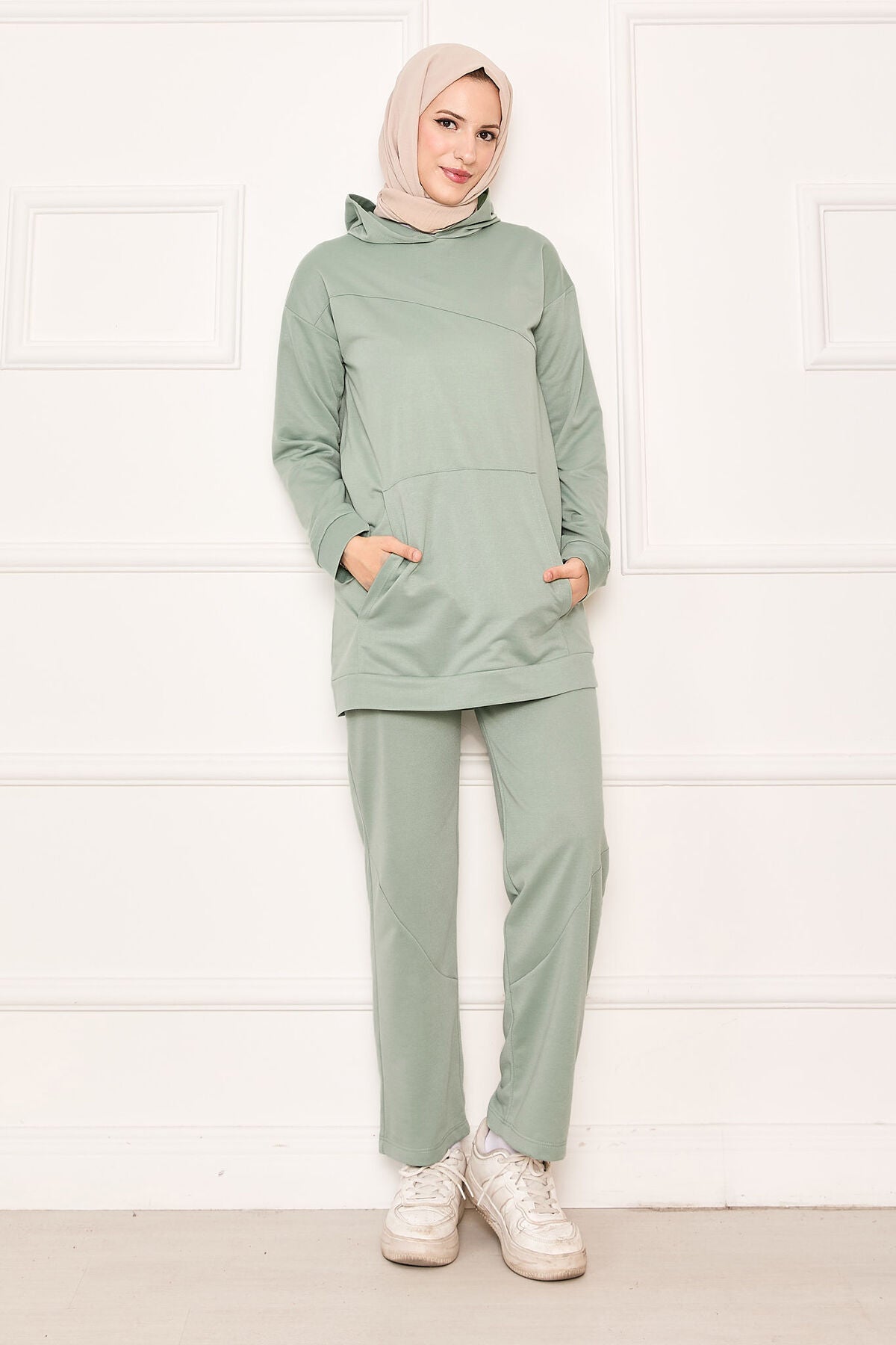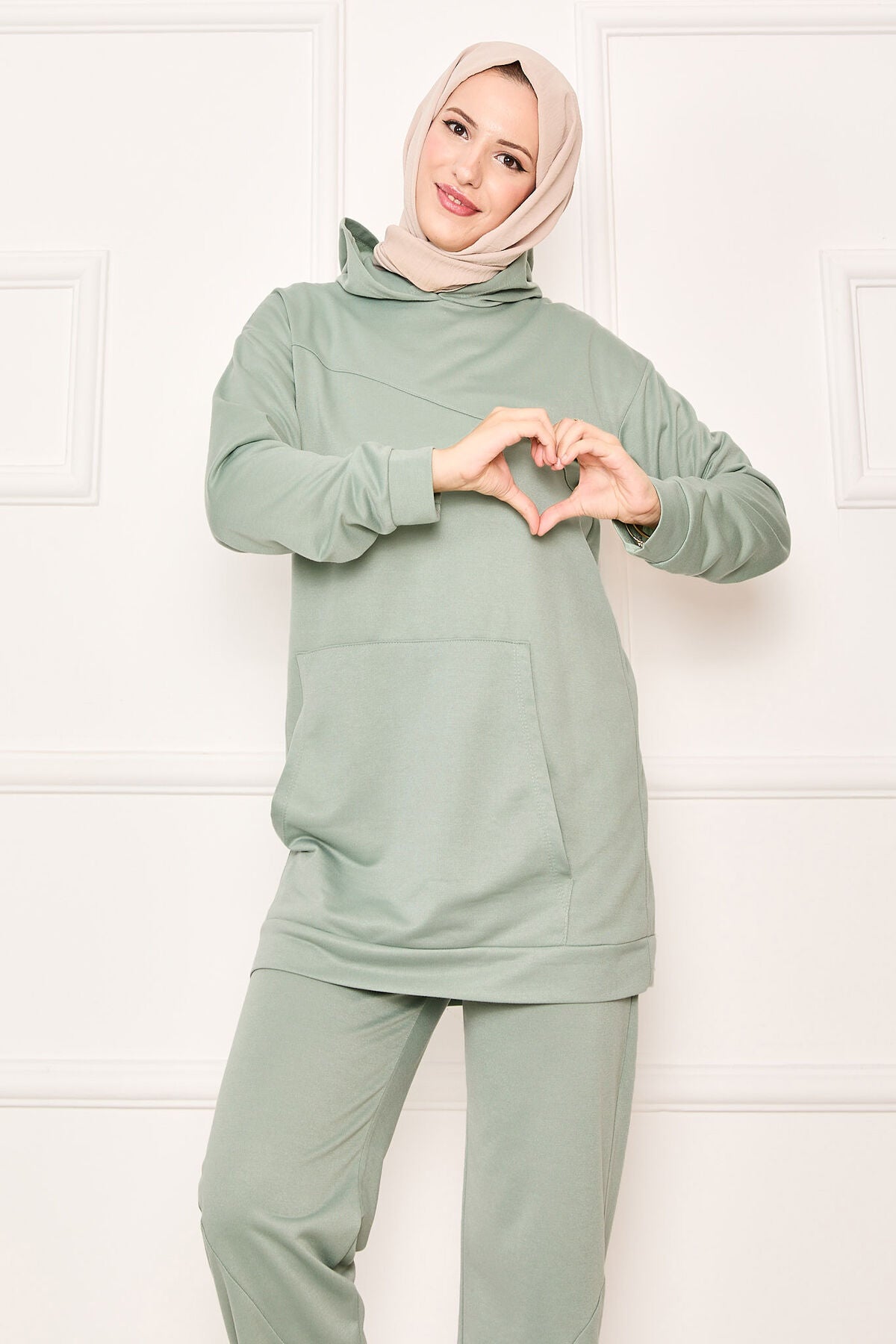 Ürün mevsimliktir. Tunik pantolon olmak üzere kombin iki parçadan oluşmaktadır. Tunik kapüşonlu kanguru cepli pantolon belden lastikli spor ikili takım iç göstermez.
