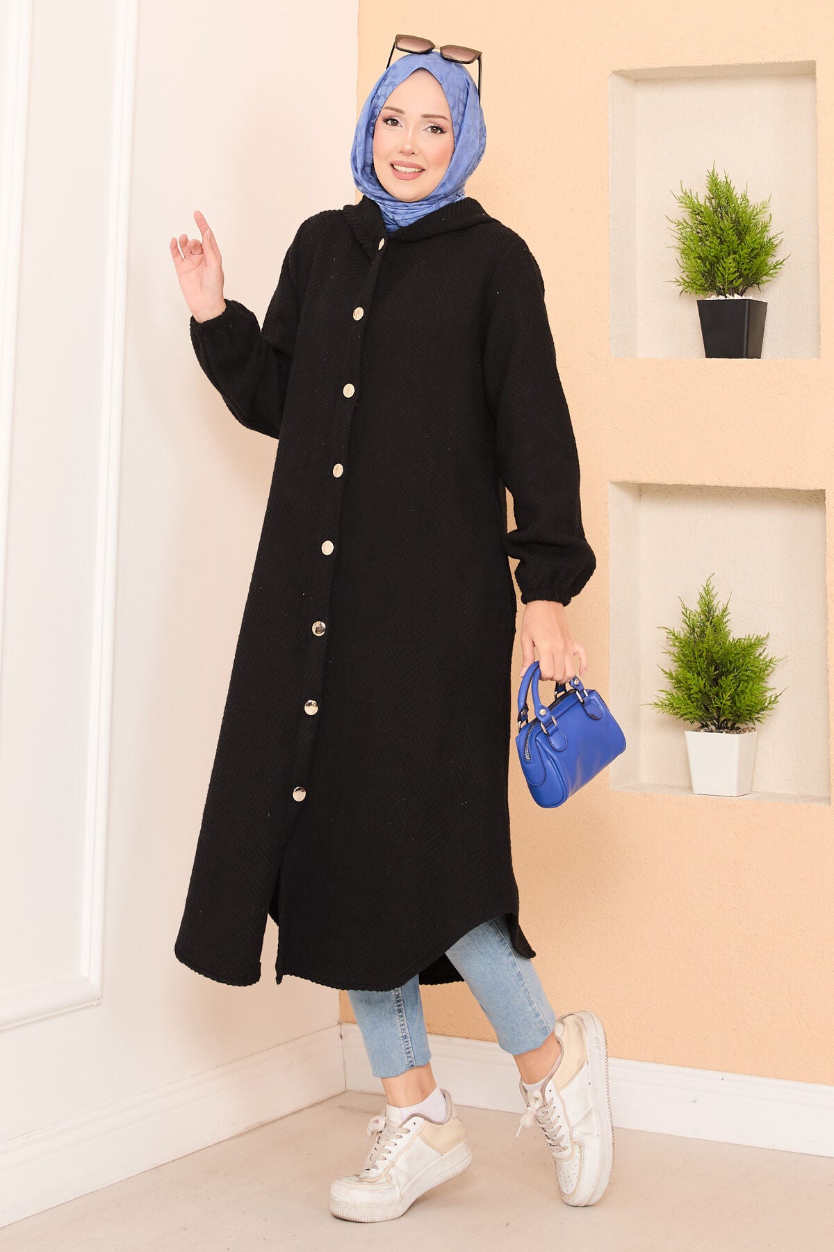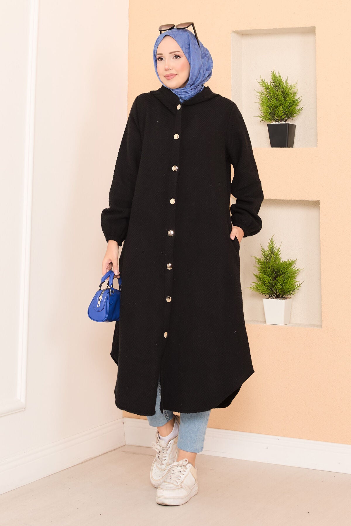 Ürün sonbahar-kışlıktır. Kapüşon detaylı boydan gold düğmeli balıksırtı desenli kaşe tesettür kap. Kap modelimizin önü kısa arkası uzun olup kol manşetleri lastik detaylıdır. Sağ ve sol olmak üzere çift ceplidir.