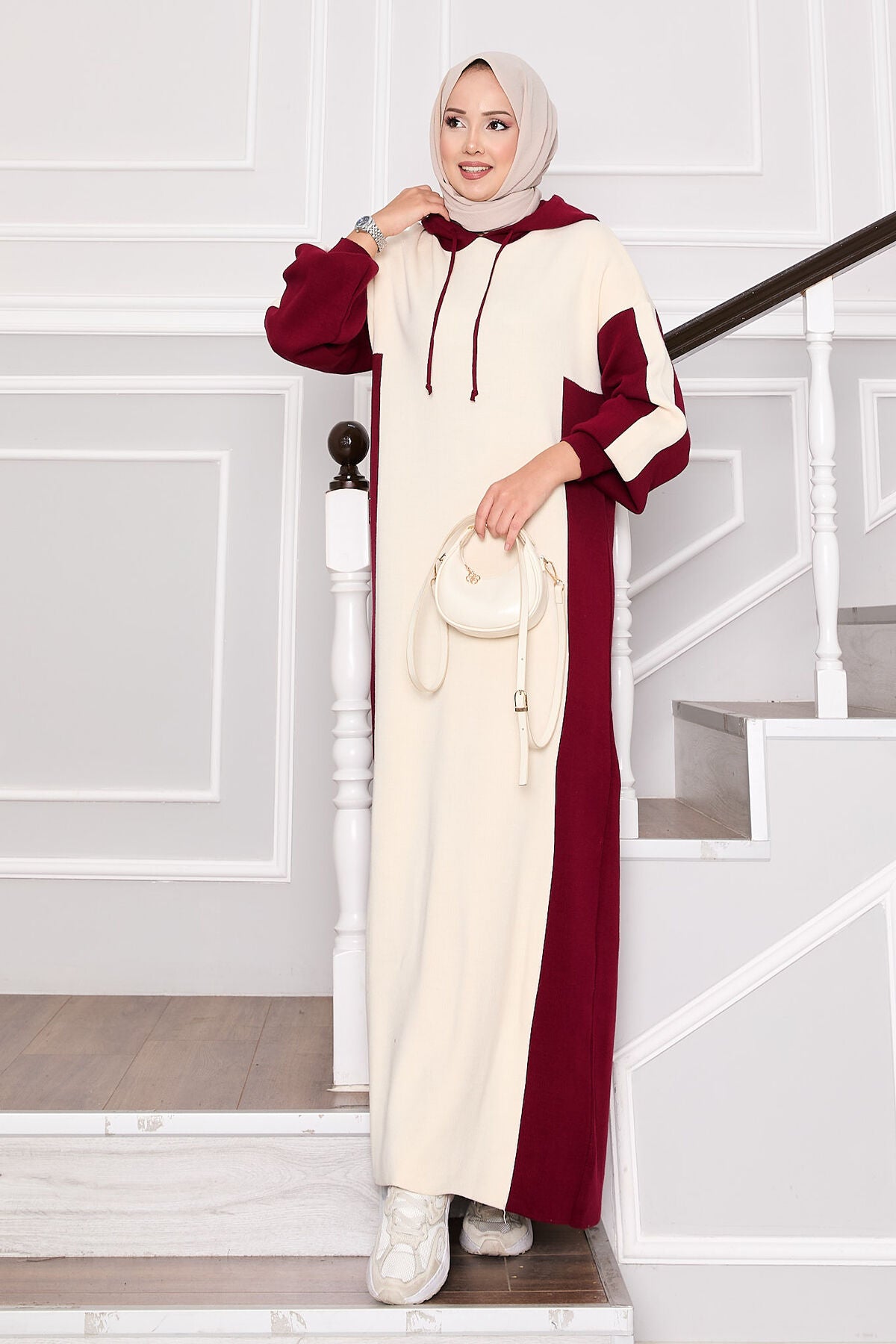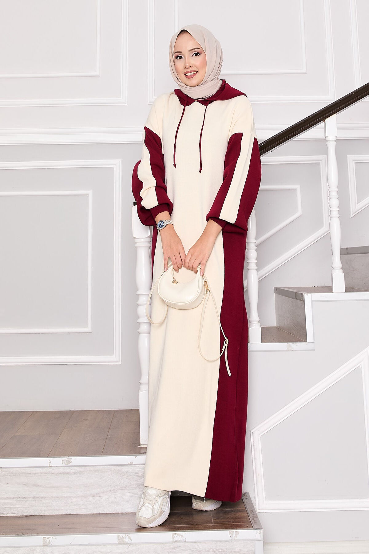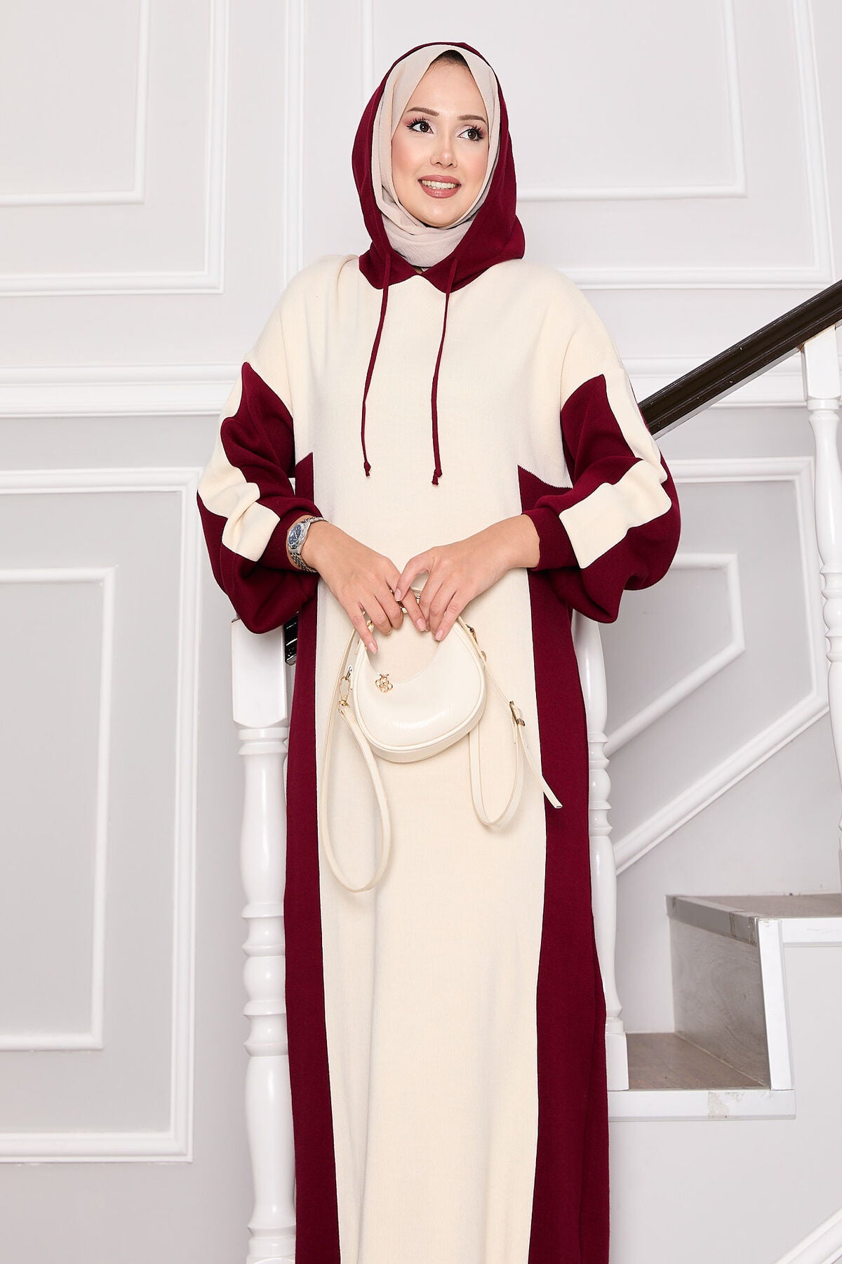 Kapüşonlu Triko Elbise Bordo-Ekru