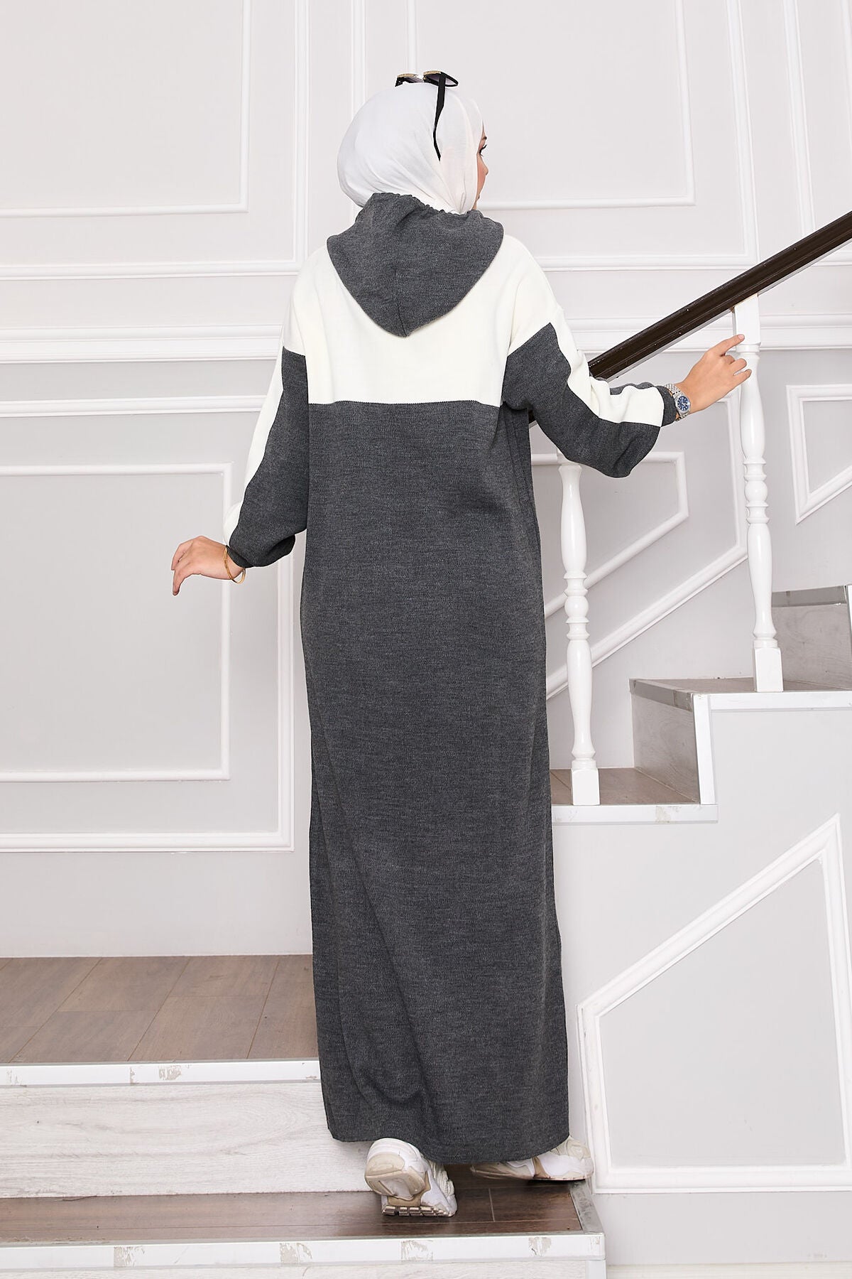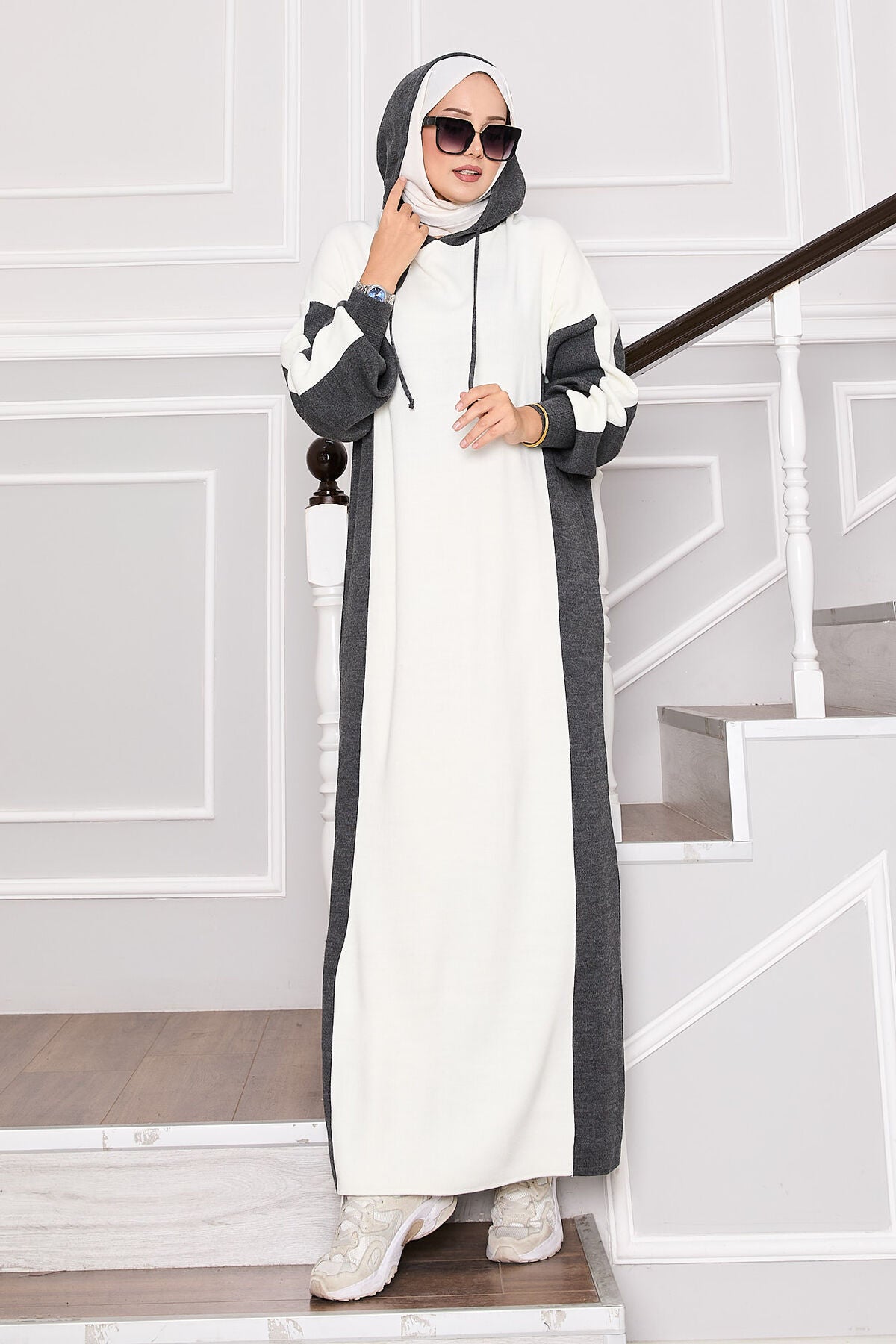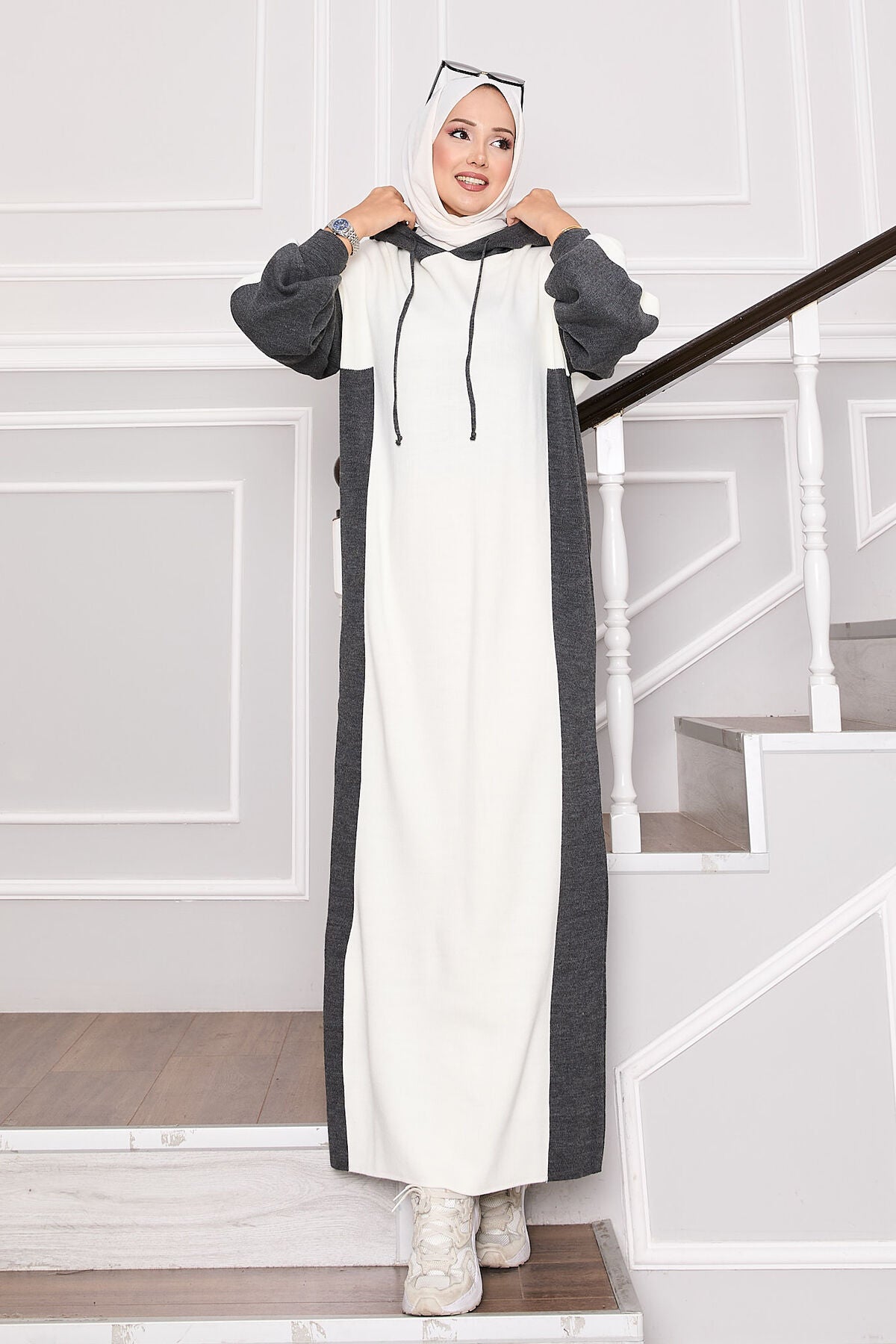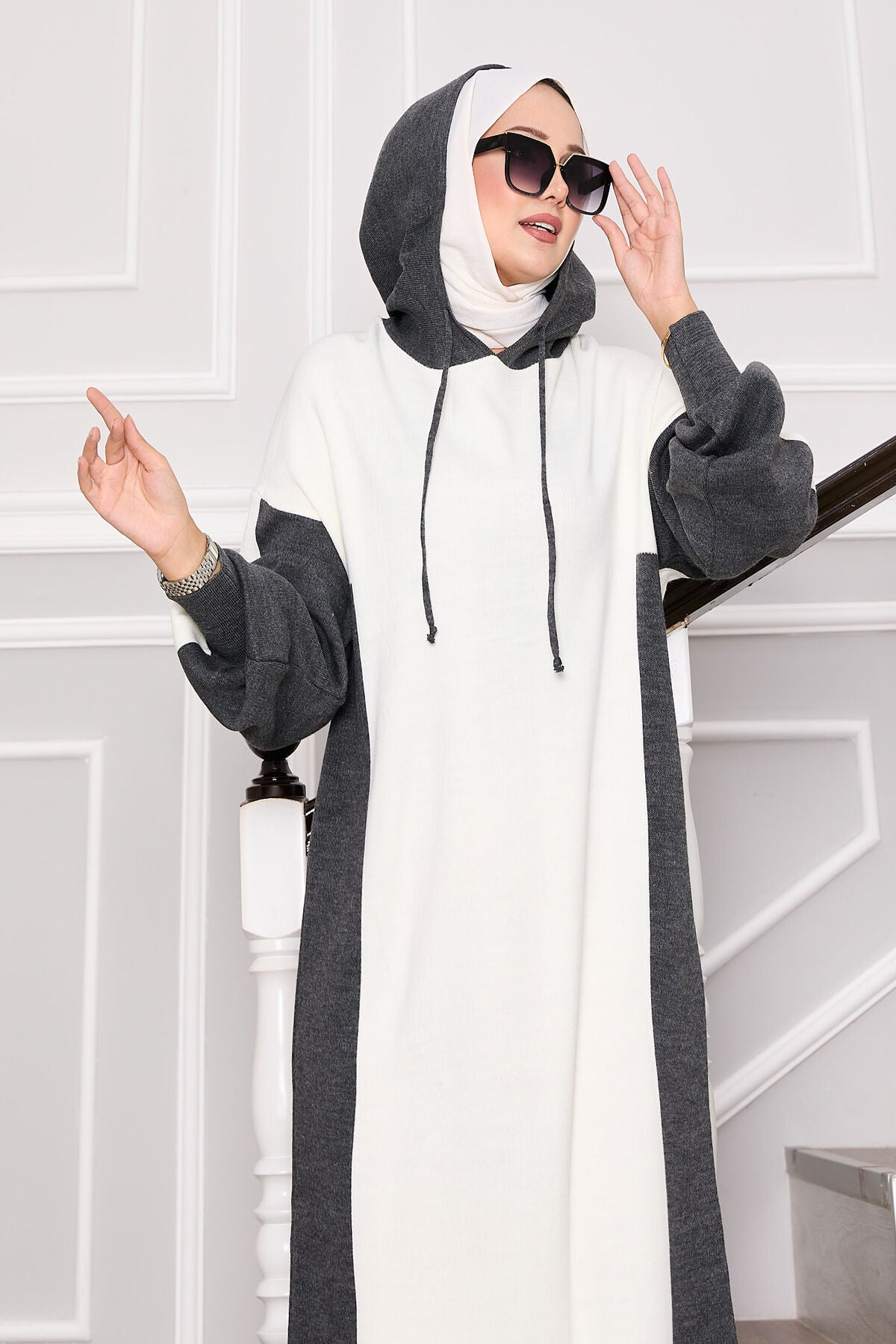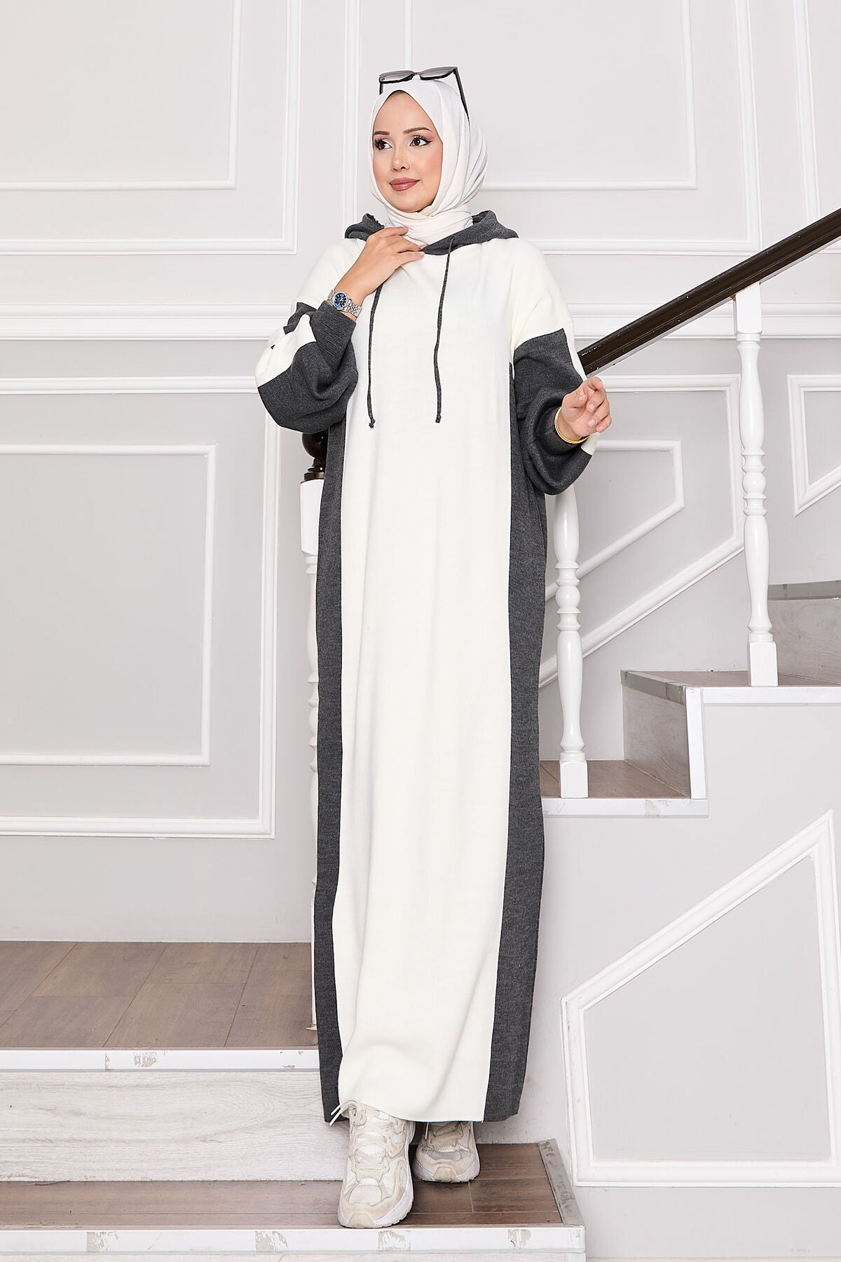 Ürün mevsimliktir. Yeni sezon kapüşoneli iki renkli triko elbise